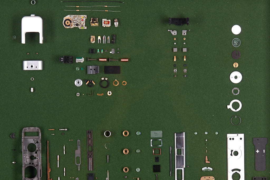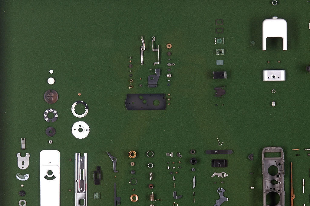 completely disassembled Minox LX with various parts mounted in order on a felt covered board in a framed and glazed display case