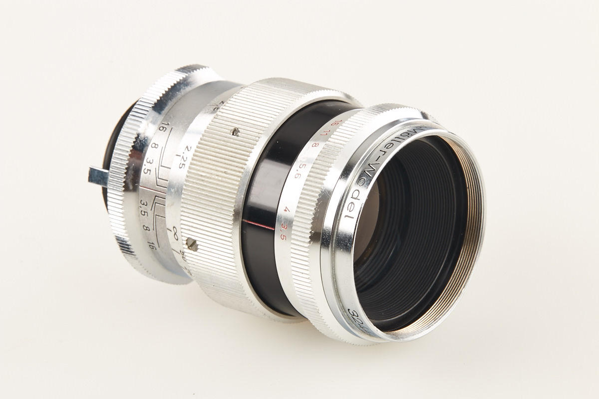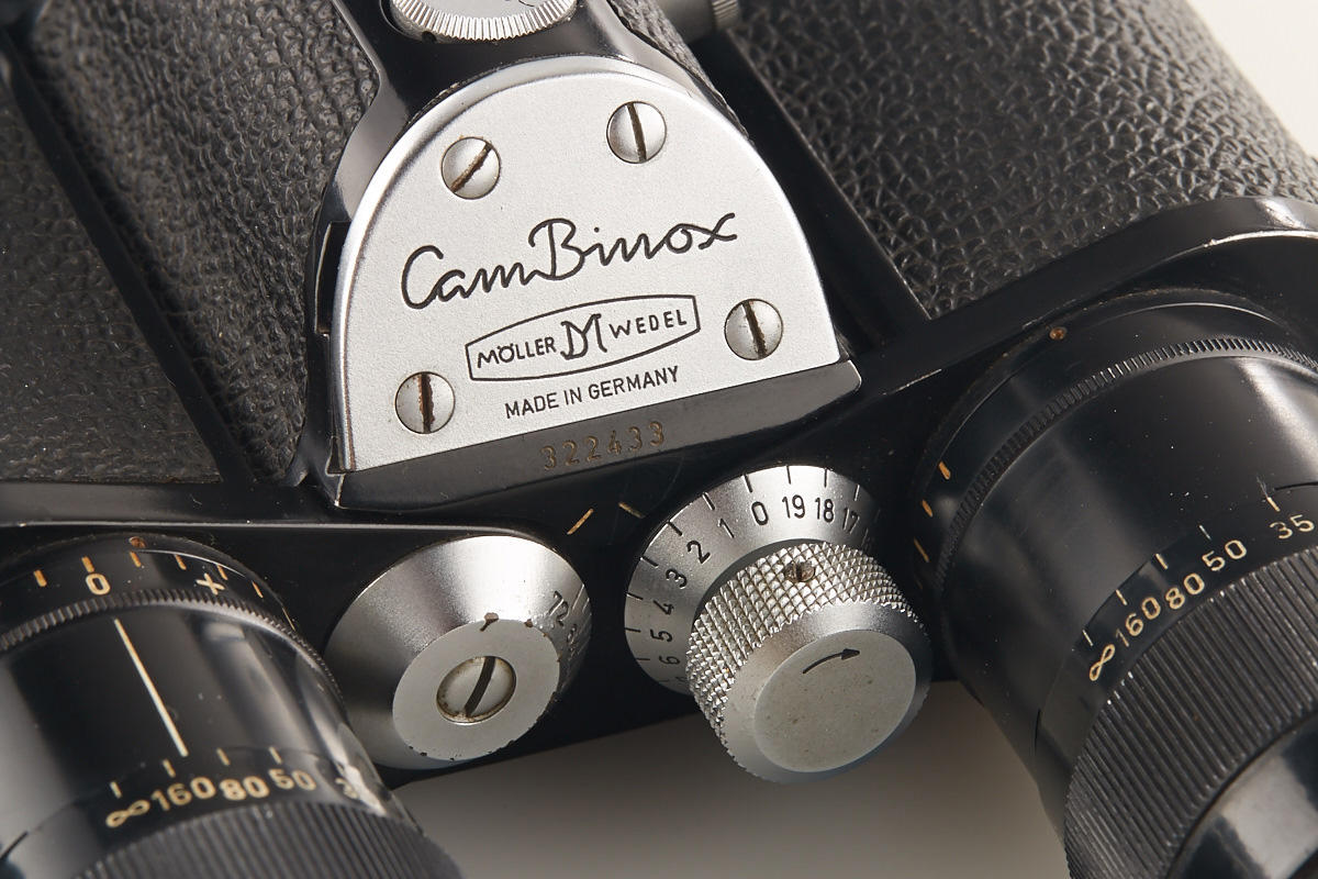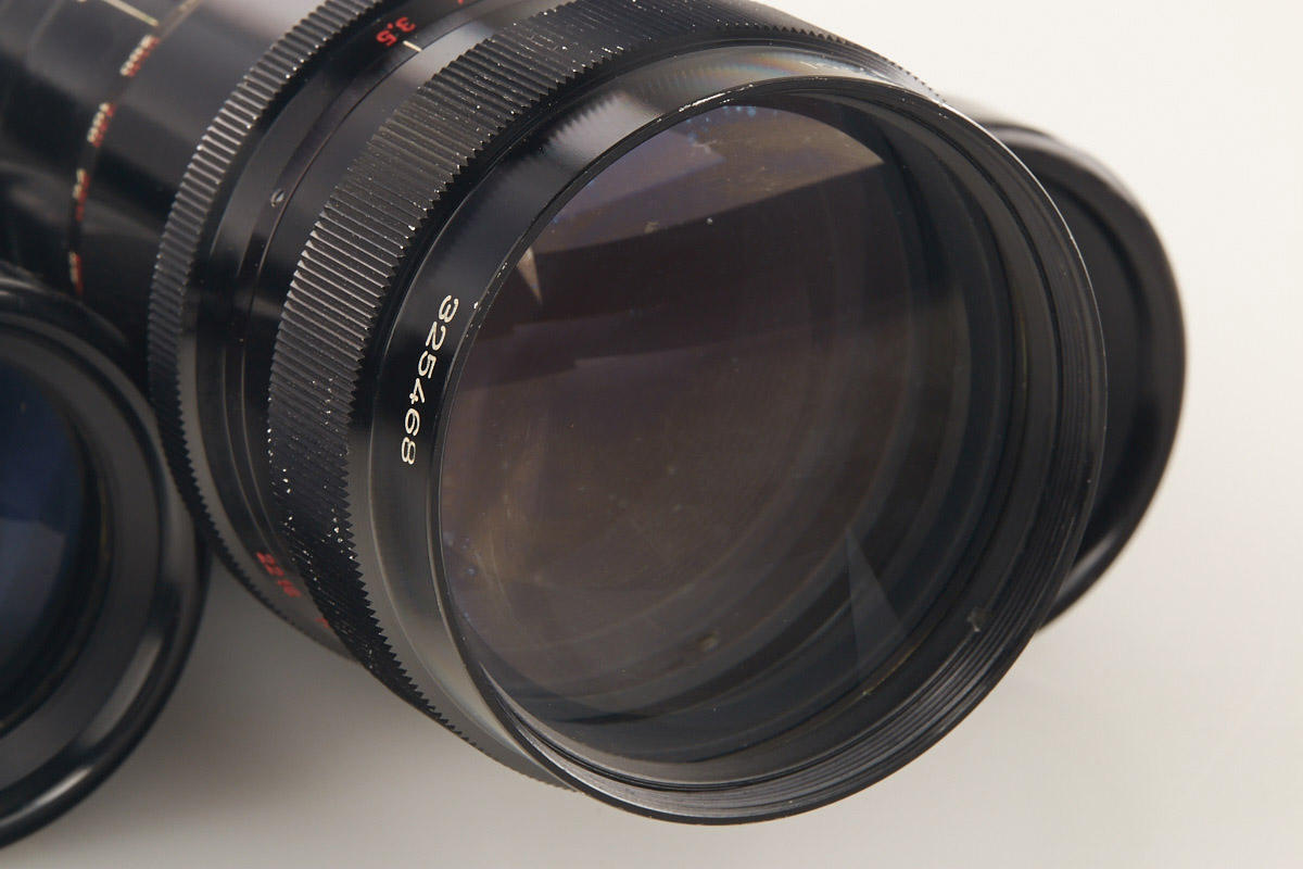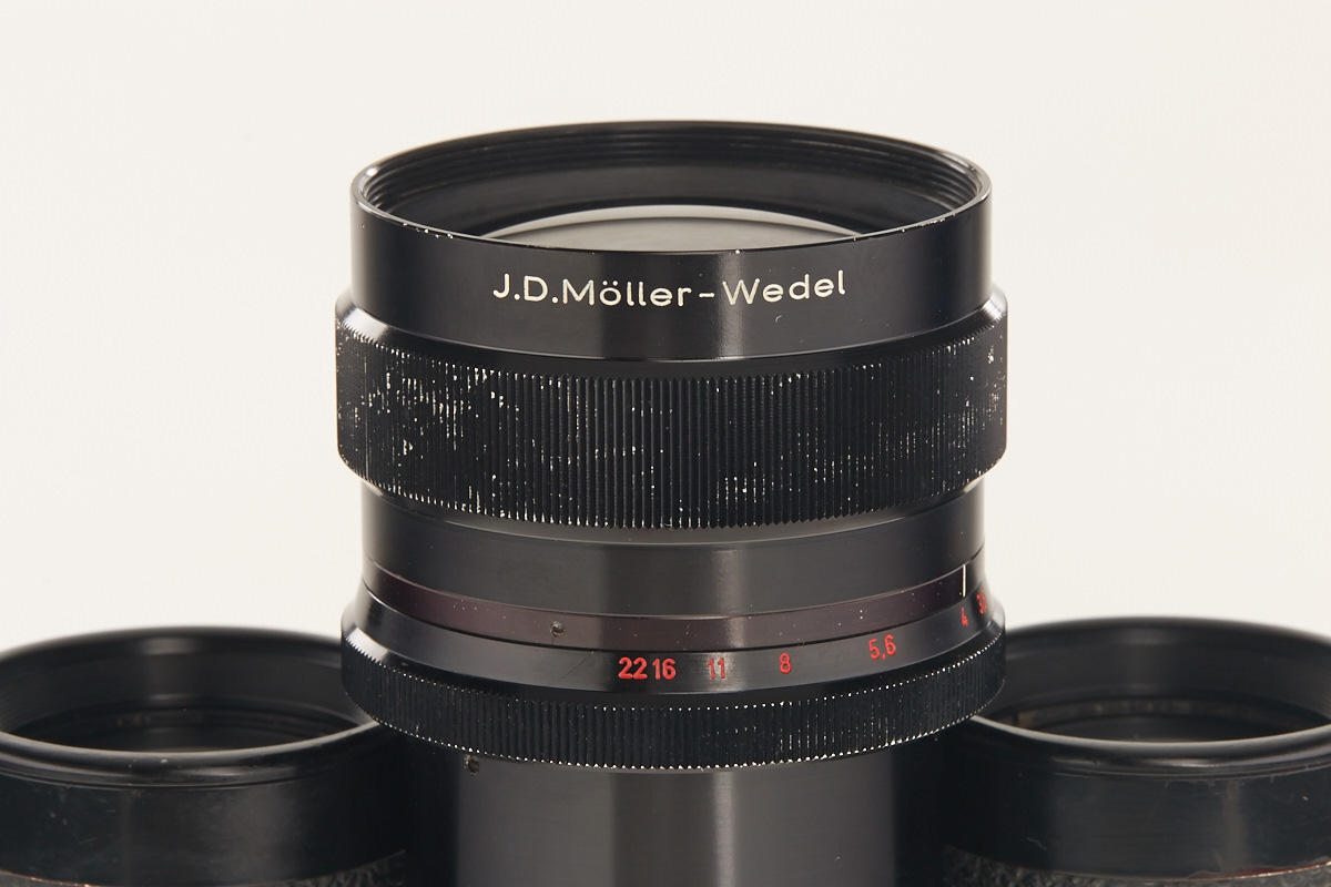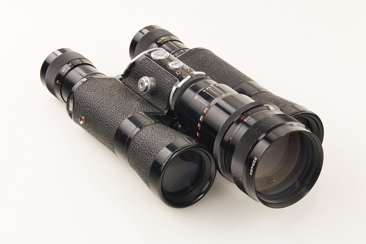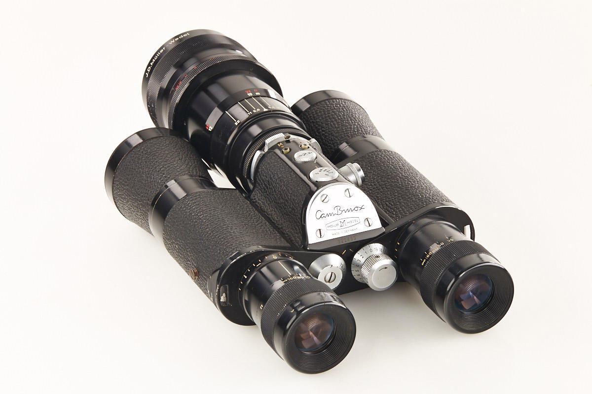 high quality binocular camera for 10x14mm exposures on 16mm film, with chrome Jdemar 3.5/90mm no.324422, Jdemar 3.5/180 (condition B-), strap and custom M39 adapter