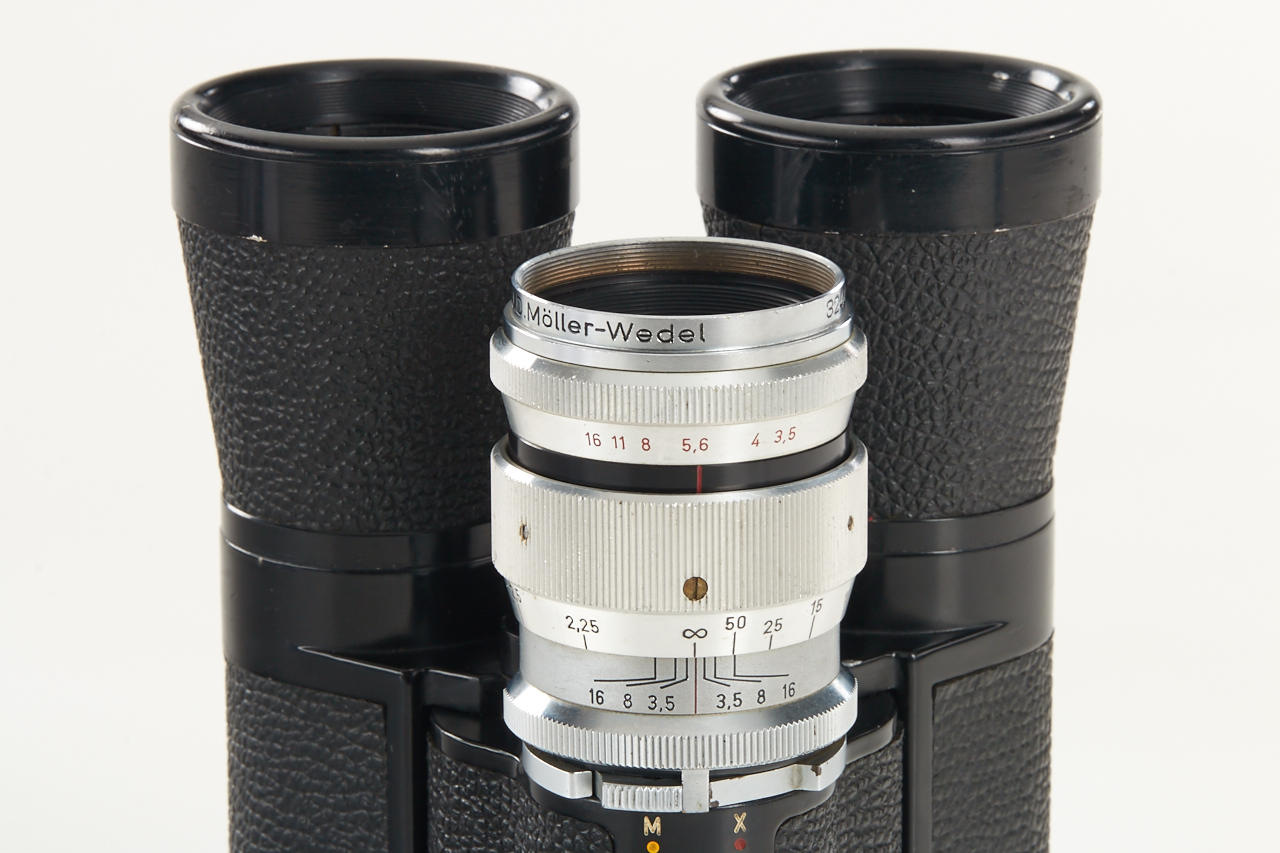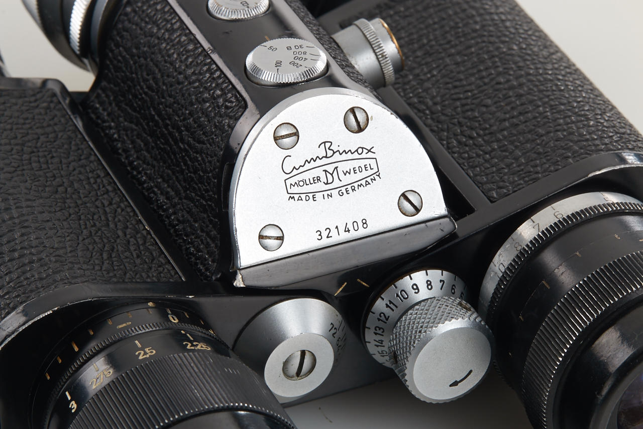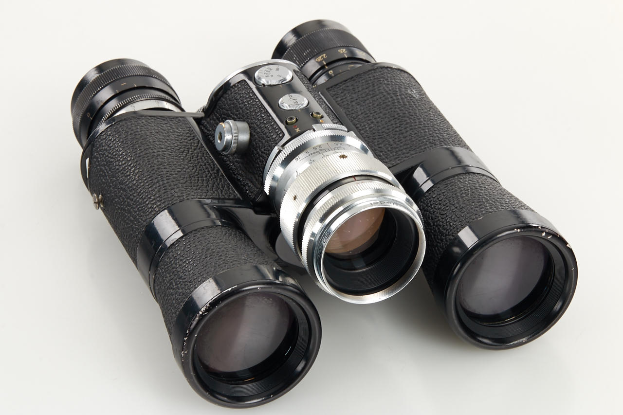 high quality binocular camera for 10x14mm exposures on 16mm film in good condition, uncommon version with ring-shaped graticule in right eyepiece, Jdemar 3.5/90mm no.324069