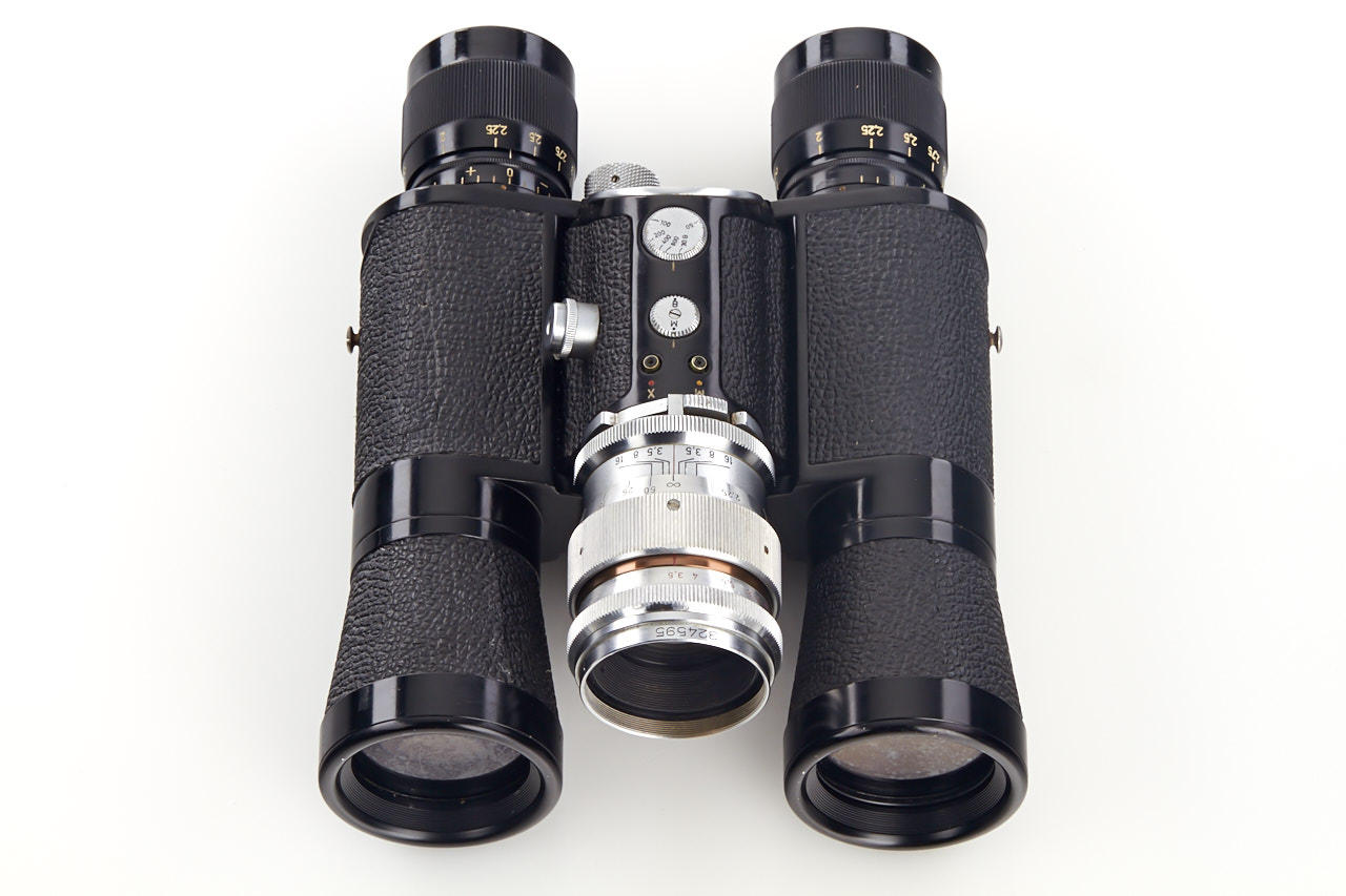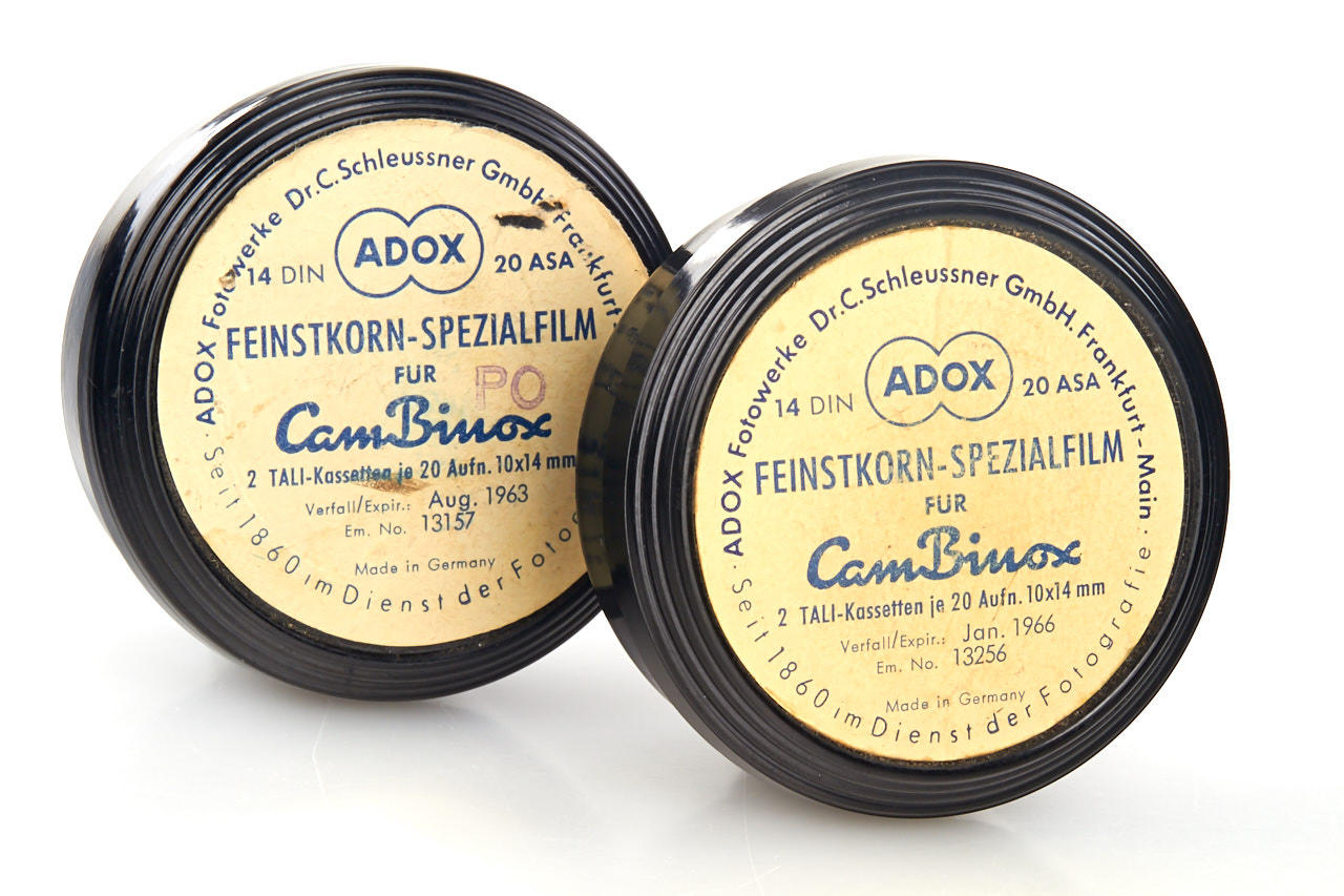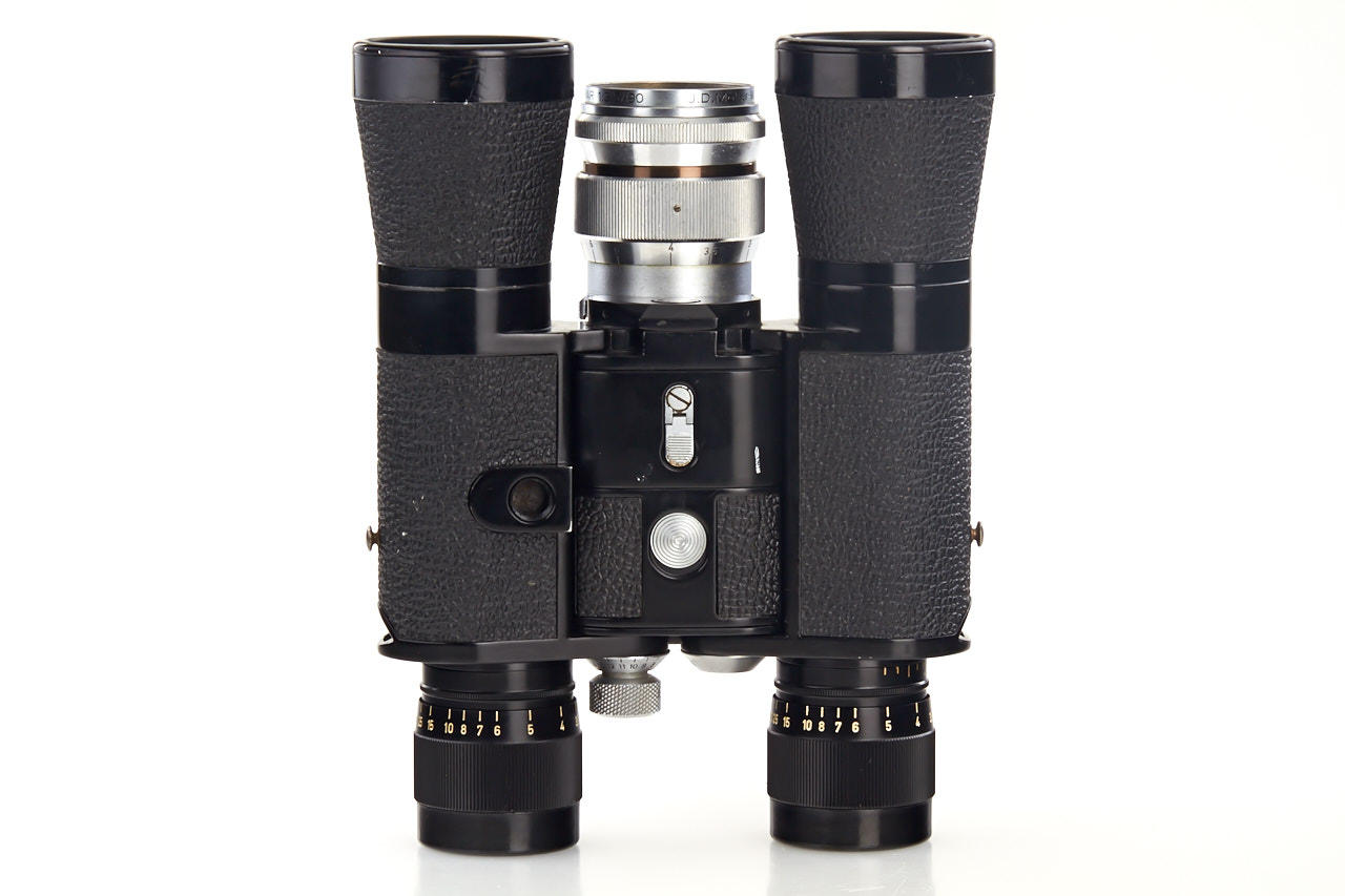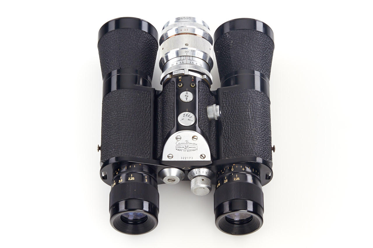 high quality binocular camera for 10x14mm exposures on 16mm film in excellent condition, with 3 lenses: Jdemar 3.5/90mm no.324595, Jdemar 3.5/135mm no.325375 and uncommon Jdemar 3.5/35mm no.V1204002, two Bakelite cans of special Cambinox Adox 14 Din film (each with two sealed films inside)