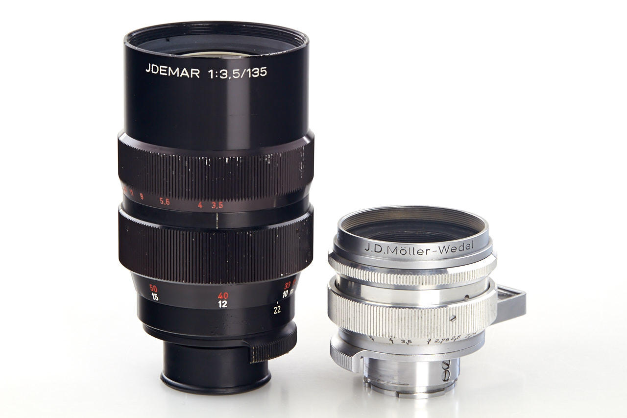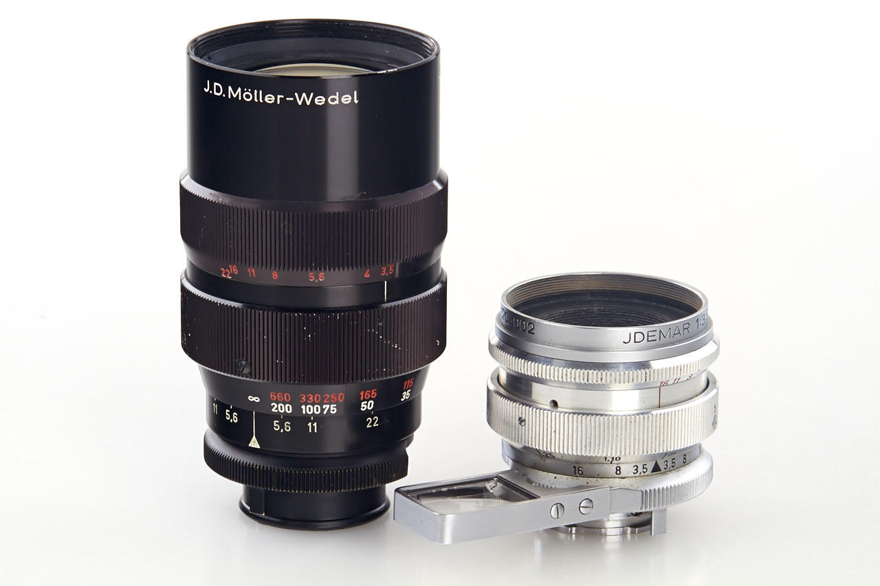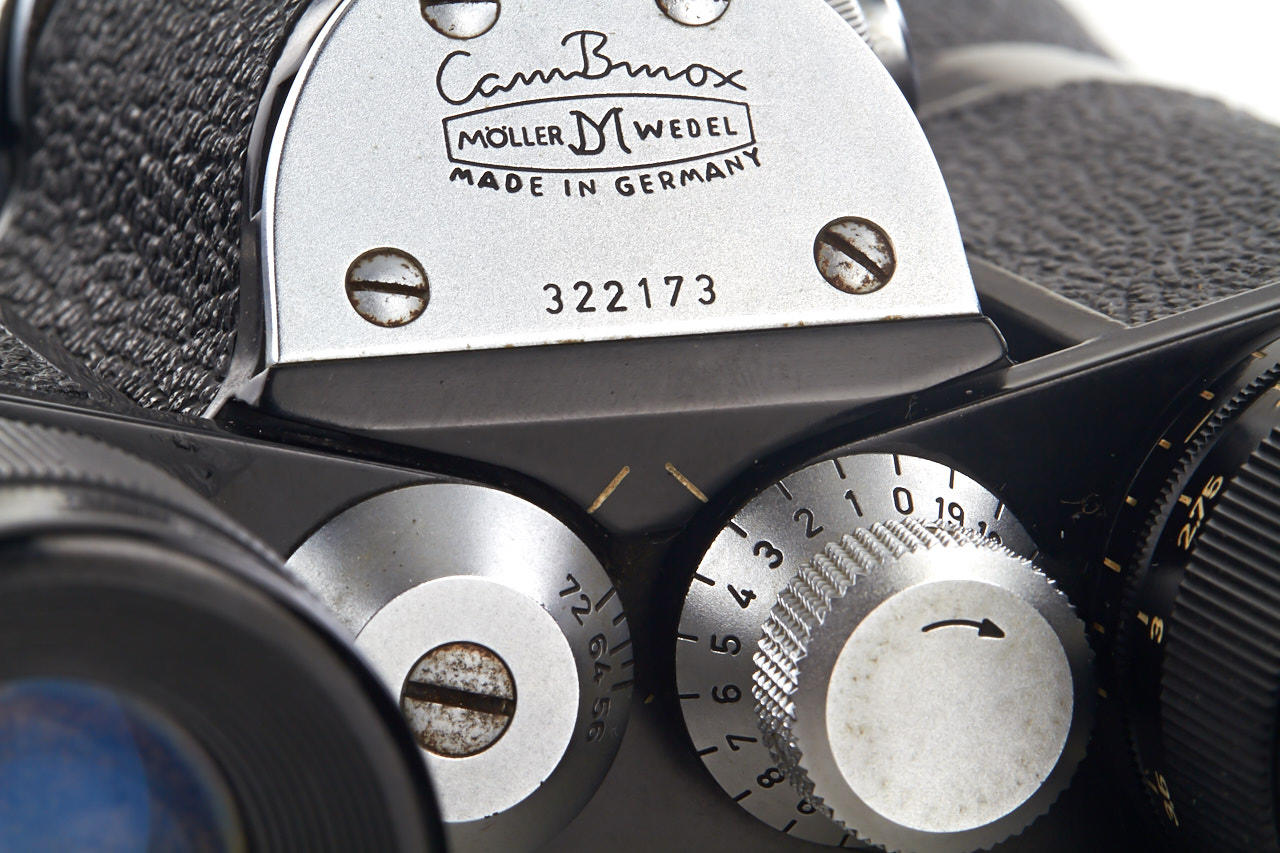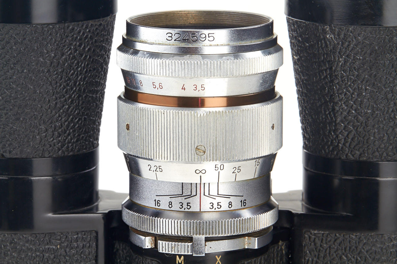 high quality binocular camera for 10x14mm exposures on 16mm film in excellent condition, with 3 lenses: Jdemar 3.5/90mm no.324595, Jdemar 3.5/135mm no.325375 and uncommon Jdemar 3.5/35mm no.V1204002, two Bakelite cans of special Cambinox Adox 14 Din film (each with two sealed films inside)