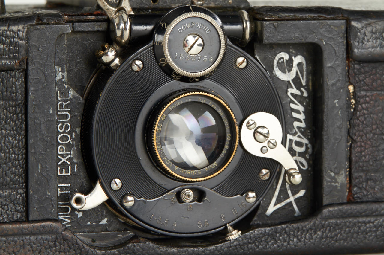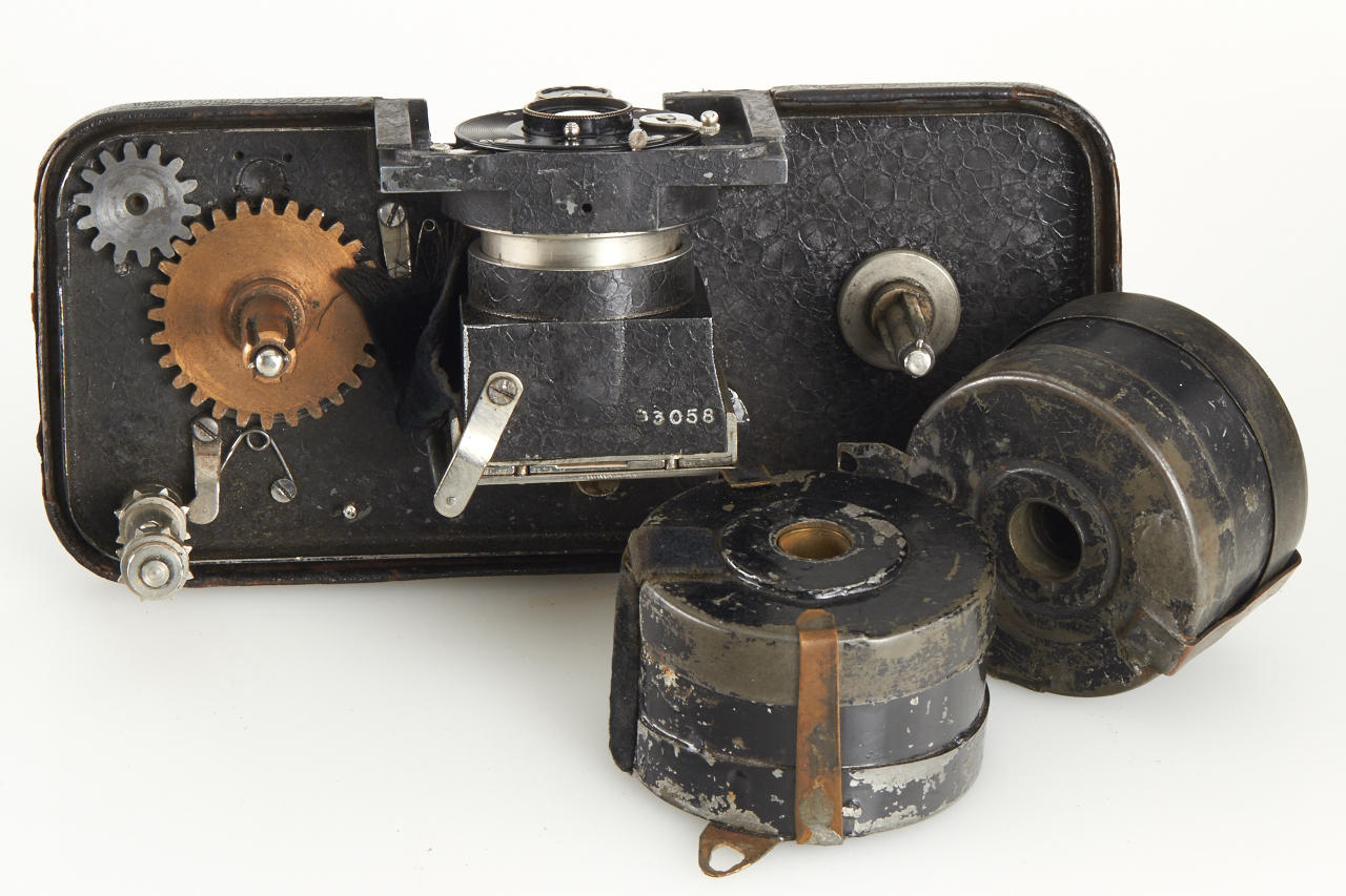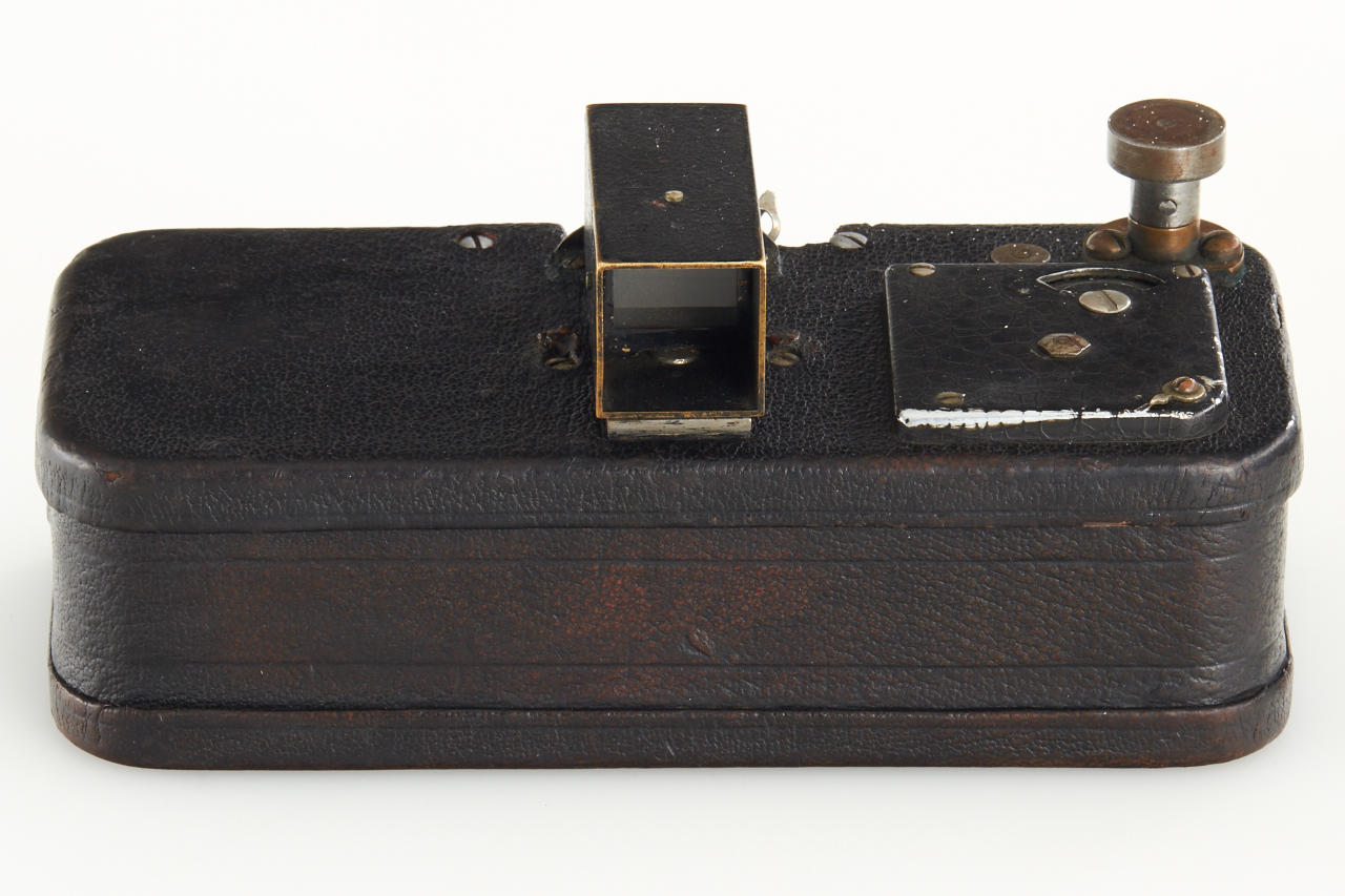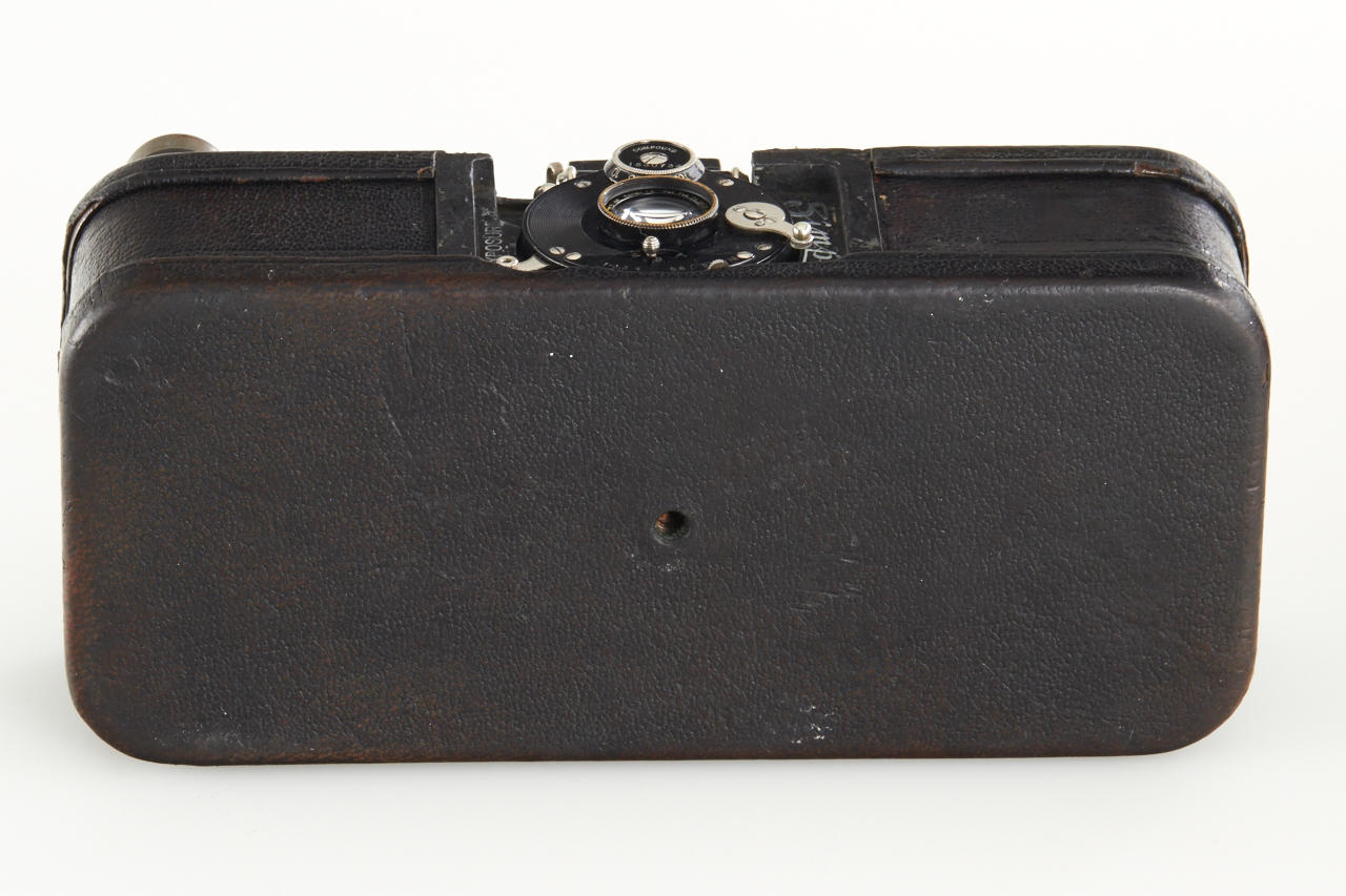 Extremely rare and historically important this is the first production camera for 24x36mm exposures on 35mm film (one of only approximately 27 made, around 5 of these are known to exist). The offered camera this is the only example known with detachable, non-collapsible finder and in good original condition. With Bausch & Lomb Zeiss Tessar 50mm no.1894840, two film spools inside, inclusive original 1914 advertisement from the Travel magazine.