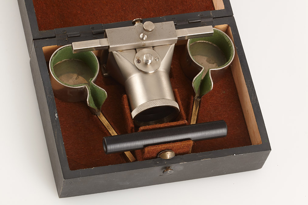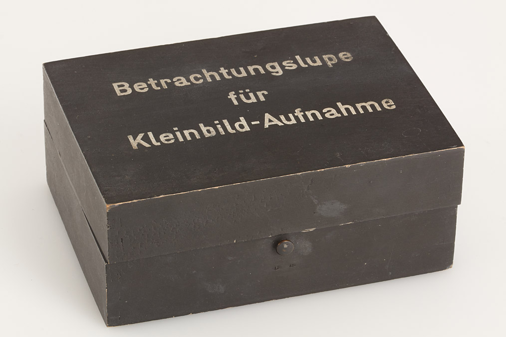 very rare slide viewer for 250 exposures, complete with grip, both spools trays and opal glass in original wooden box