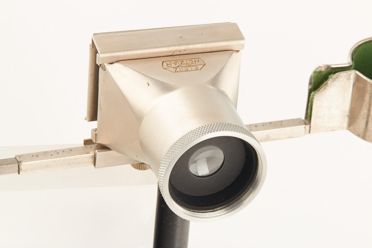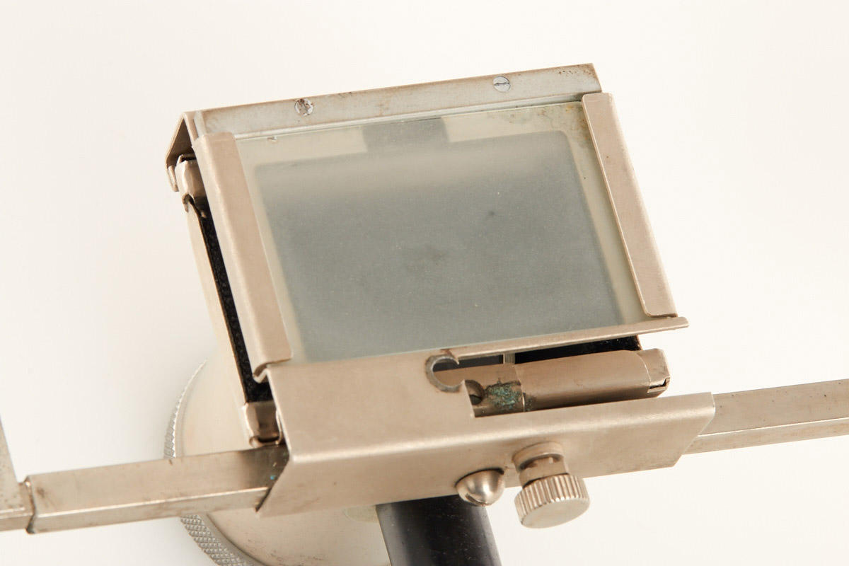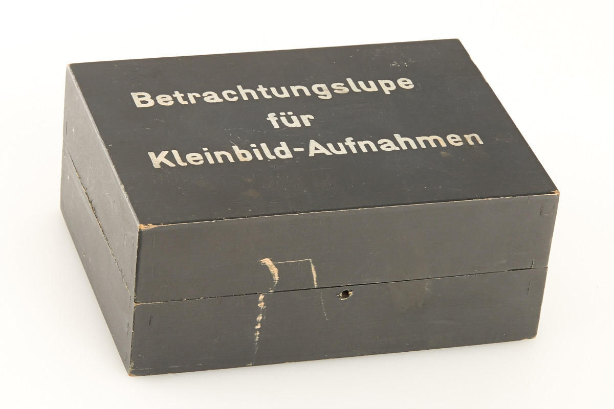 very rare wartime slide viewer for 250 exposures, complete with grip, both spool trays in original grey painted wooden box