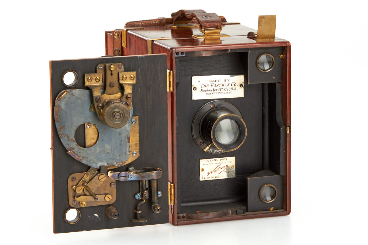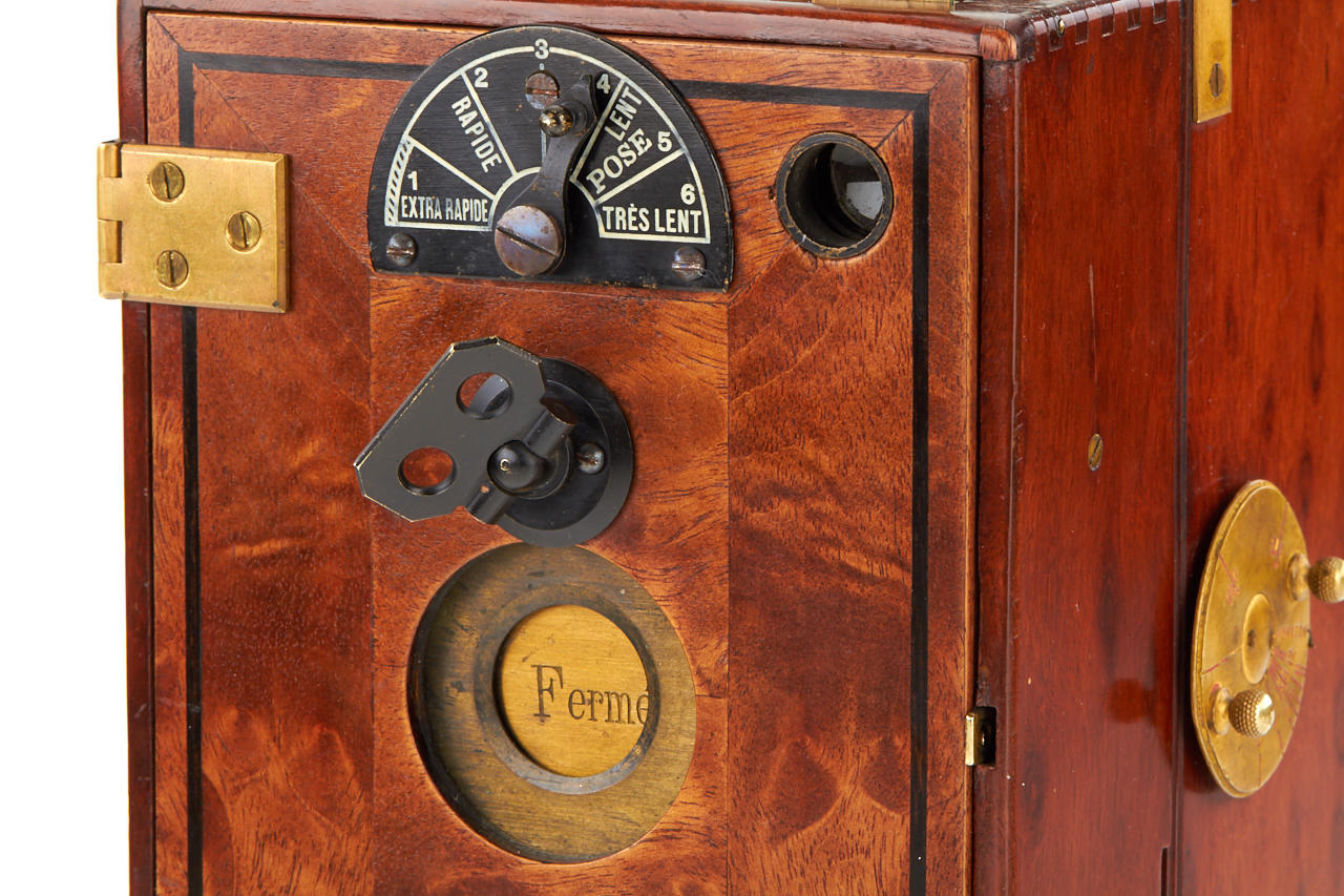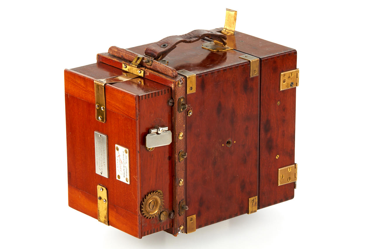 rare detective camera for 9x12cm exposures, attractive mahogany body, maker’s plaque inside ‘Nadar Fabt. 53, Rue des Mathurins. Paris’, Steinheil Gruppen Antiplanet no.28053, built-in two folding angle finders, adapted Eastman rollfilm back (with Nadar’s plaque)