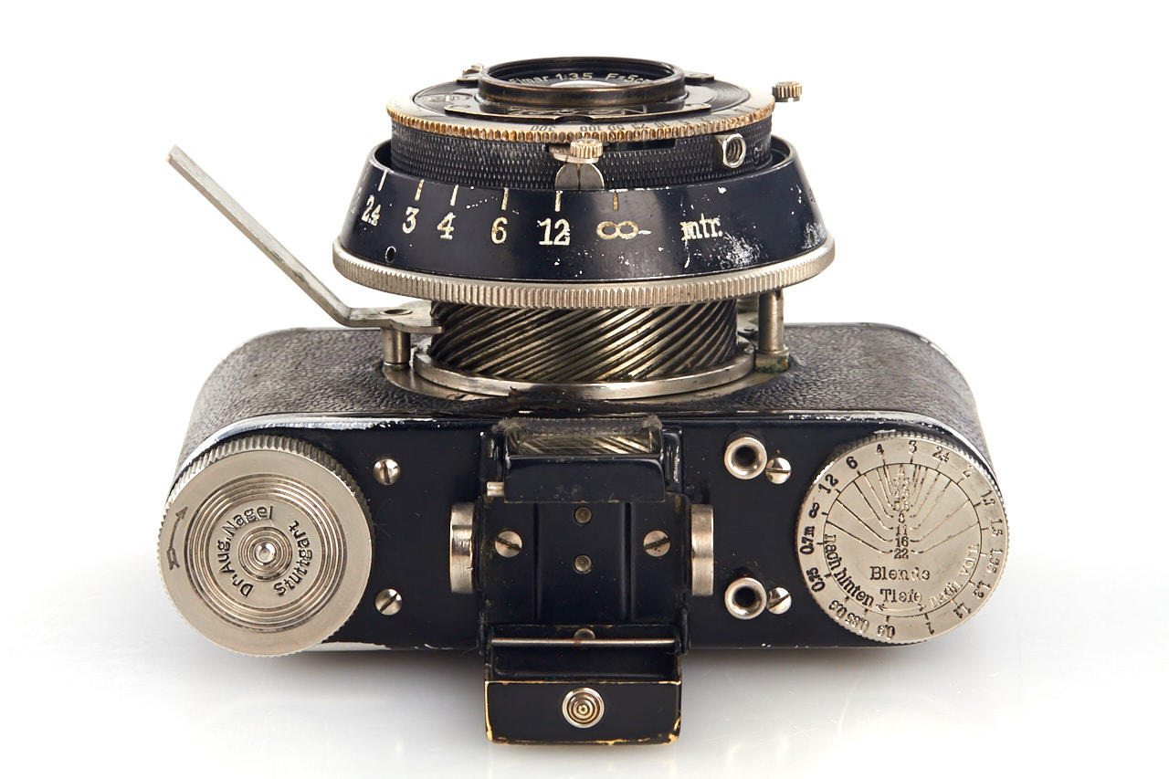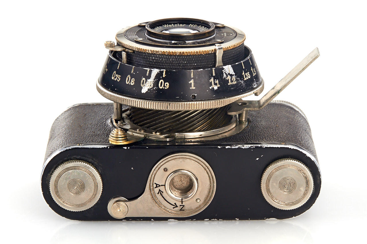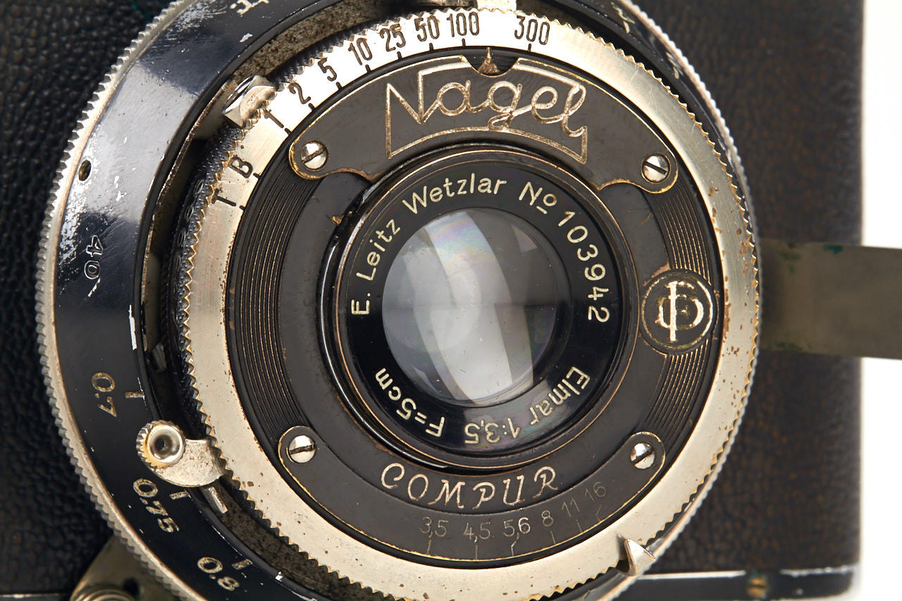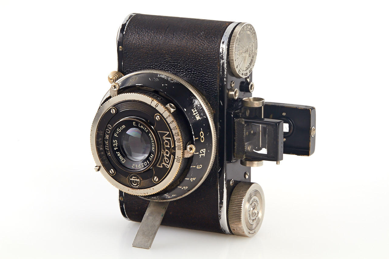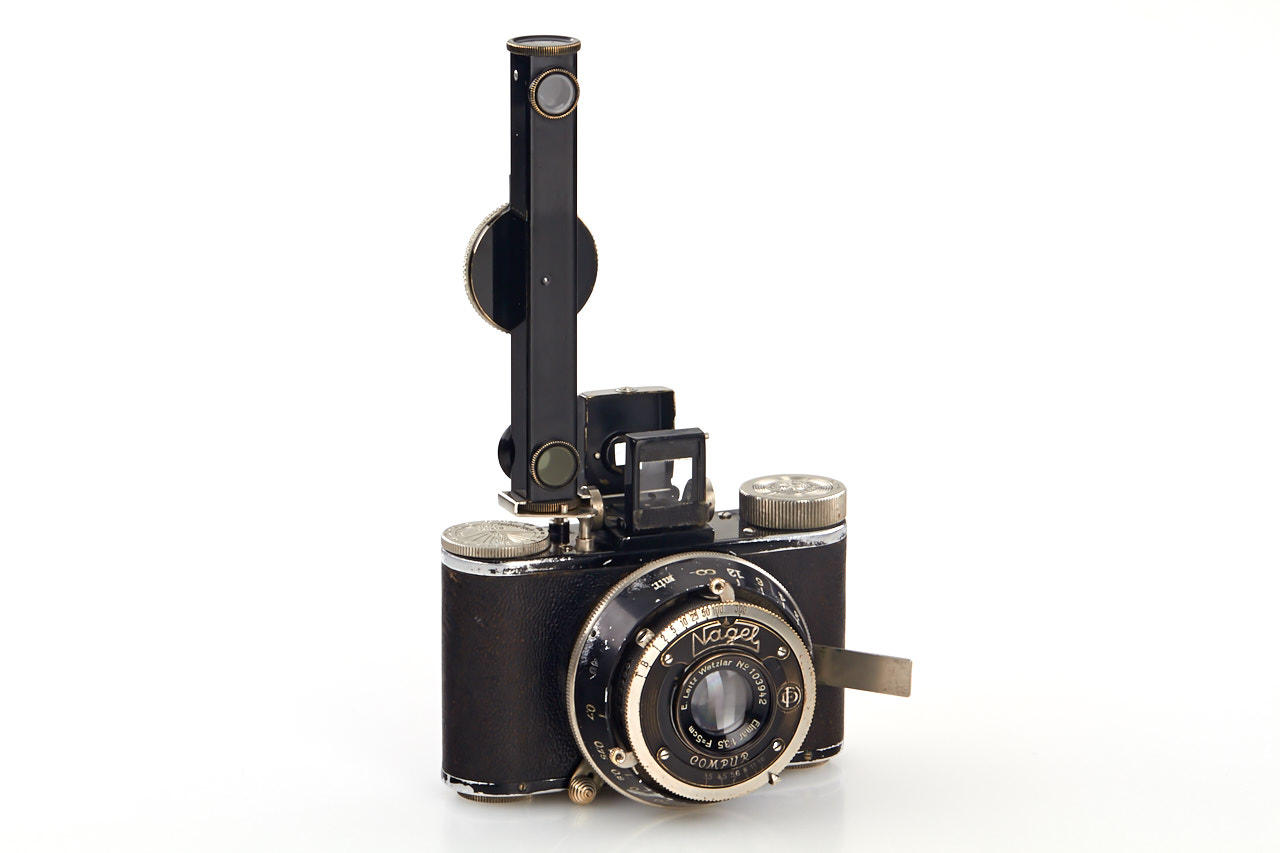 with Elmar 3.5/5cm no.103942 in Compur shutter, matching FOFER rangefinder, yellow filter, leather outfit case, very rare flash shoe attachment and vertical stand
