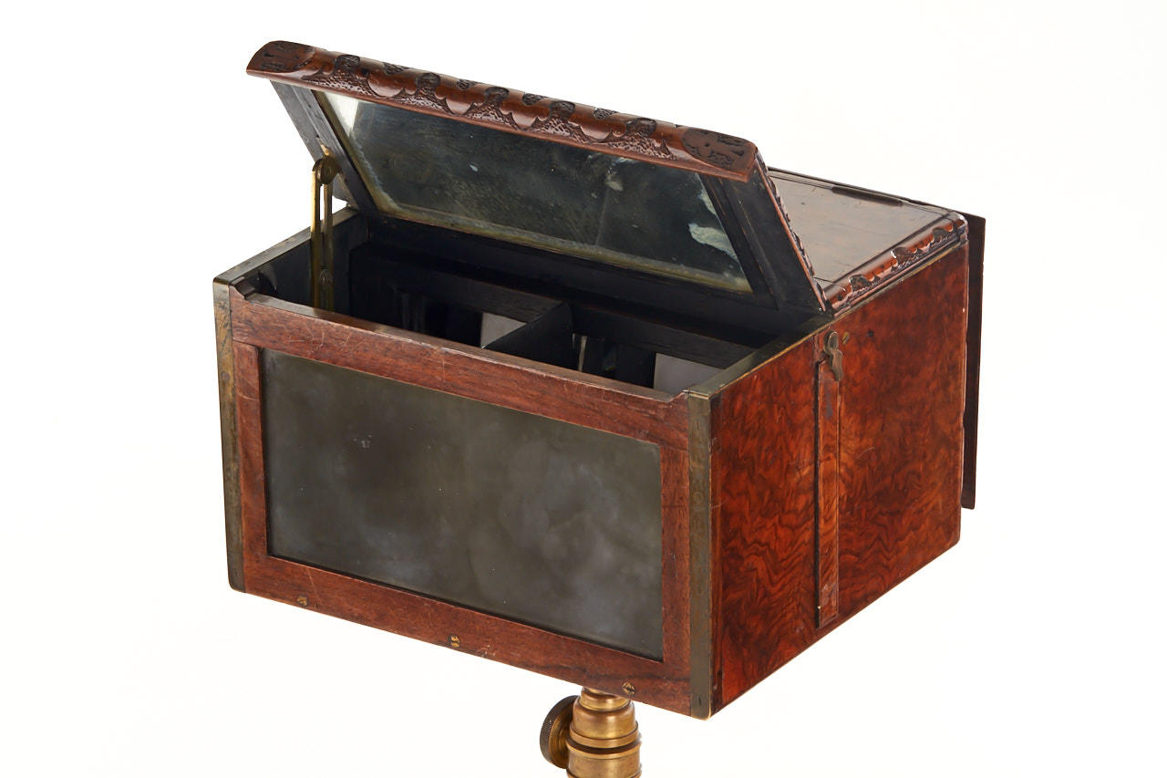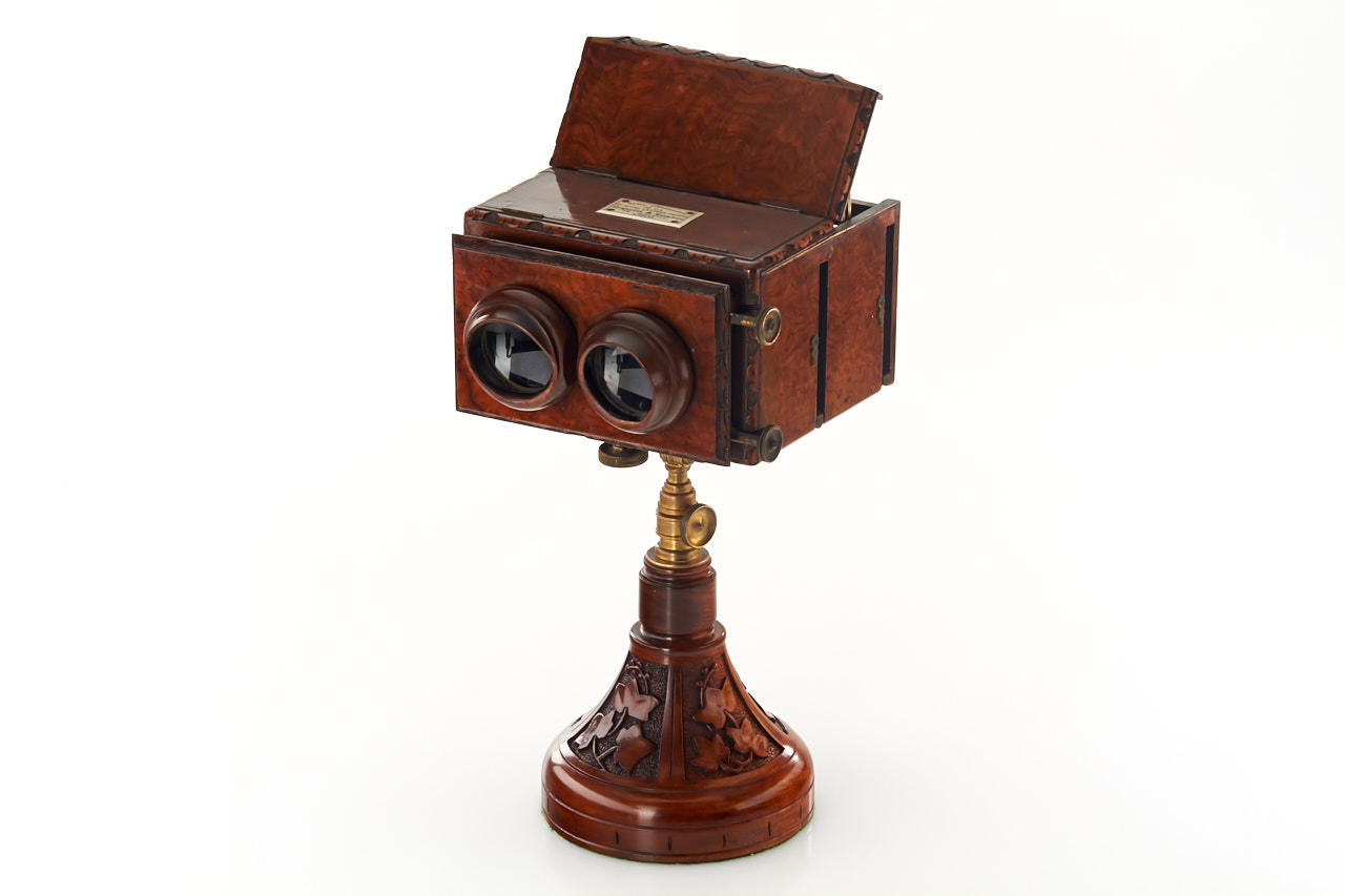 highly decorative, beautiful mahogany stereoscope for 9x18cm glass plates or prints, in excellent condition with no missing parts, ivory maker's plaque on top: 'Magic Stereoscope, No.310 by Royal Letters Patent, Negretti & Zambra, 59 Cornhill, London', with later mahogany stand carved in grape leaf design, one of the most beautiful viewers we have seen