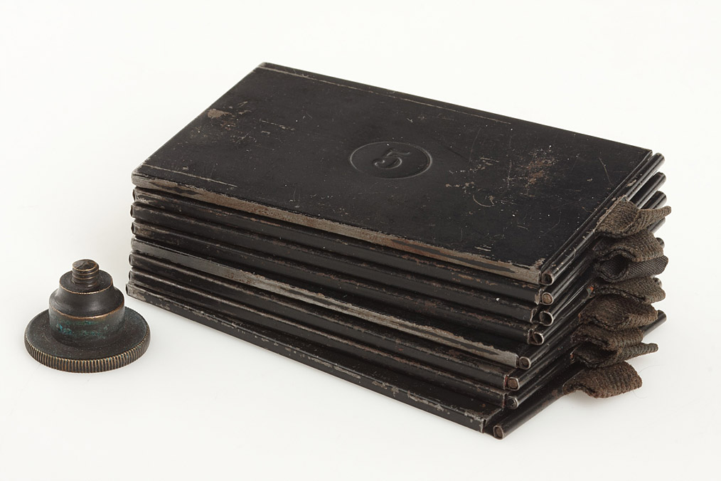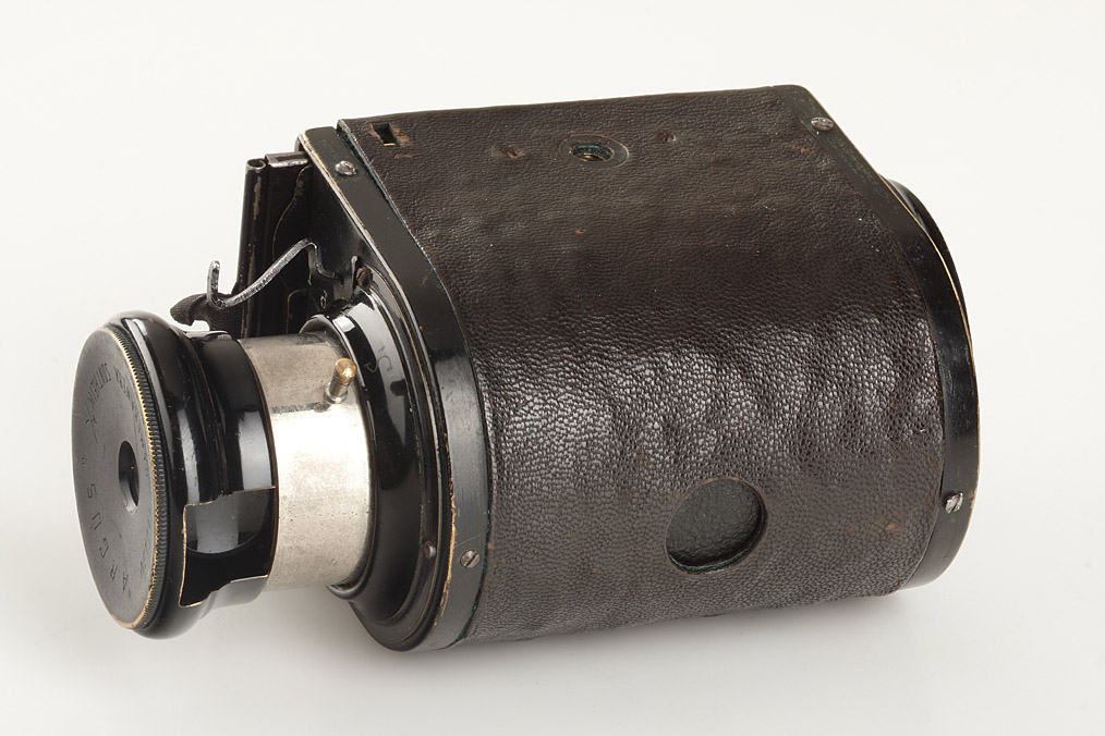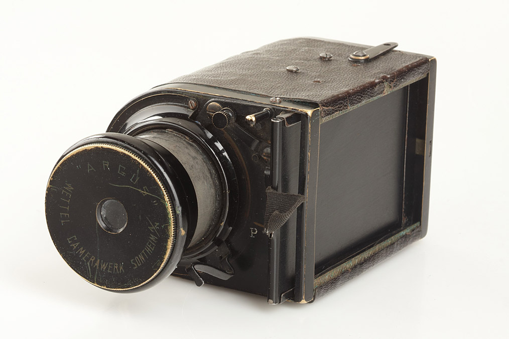 4.5x6cm, early version of the rare monocular spy camera from Nettel Camerawerk Sontheim A/N, Nettel Anastigmat 5.8/50mm, simple shutter, in good original condition, 9 platefilm holders, original tripod screw and leather case