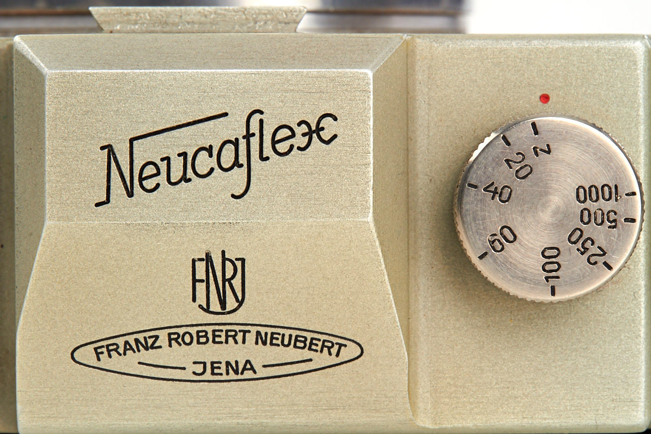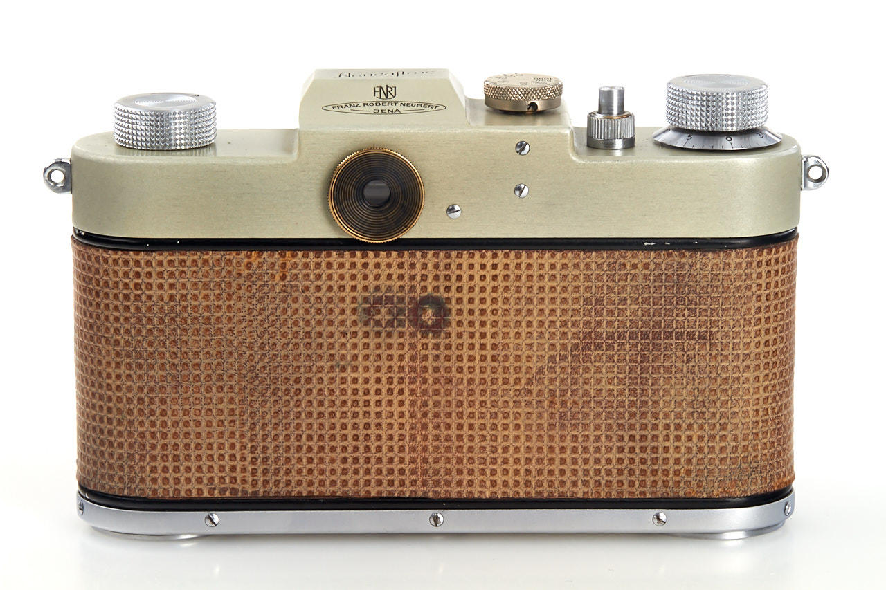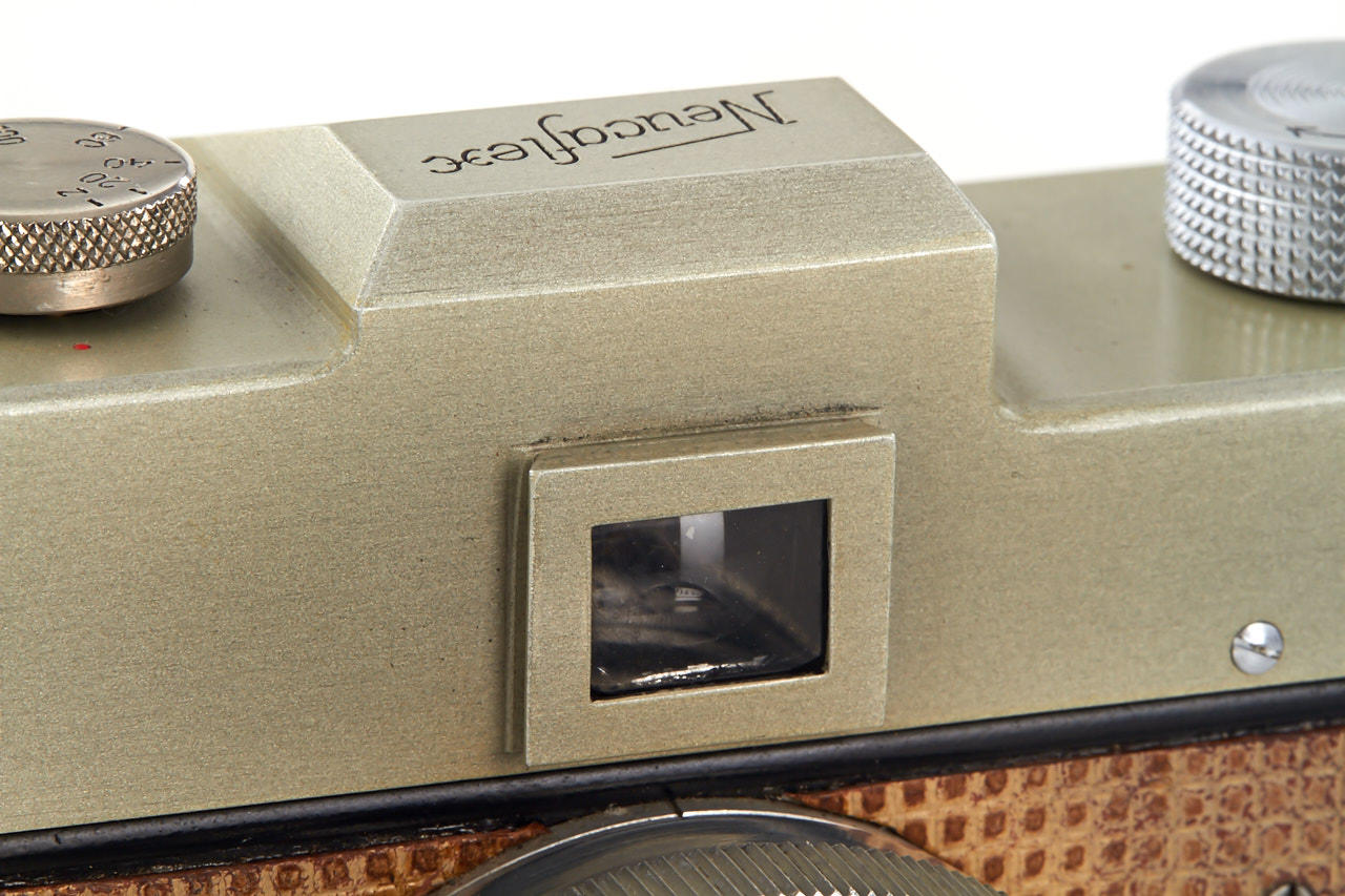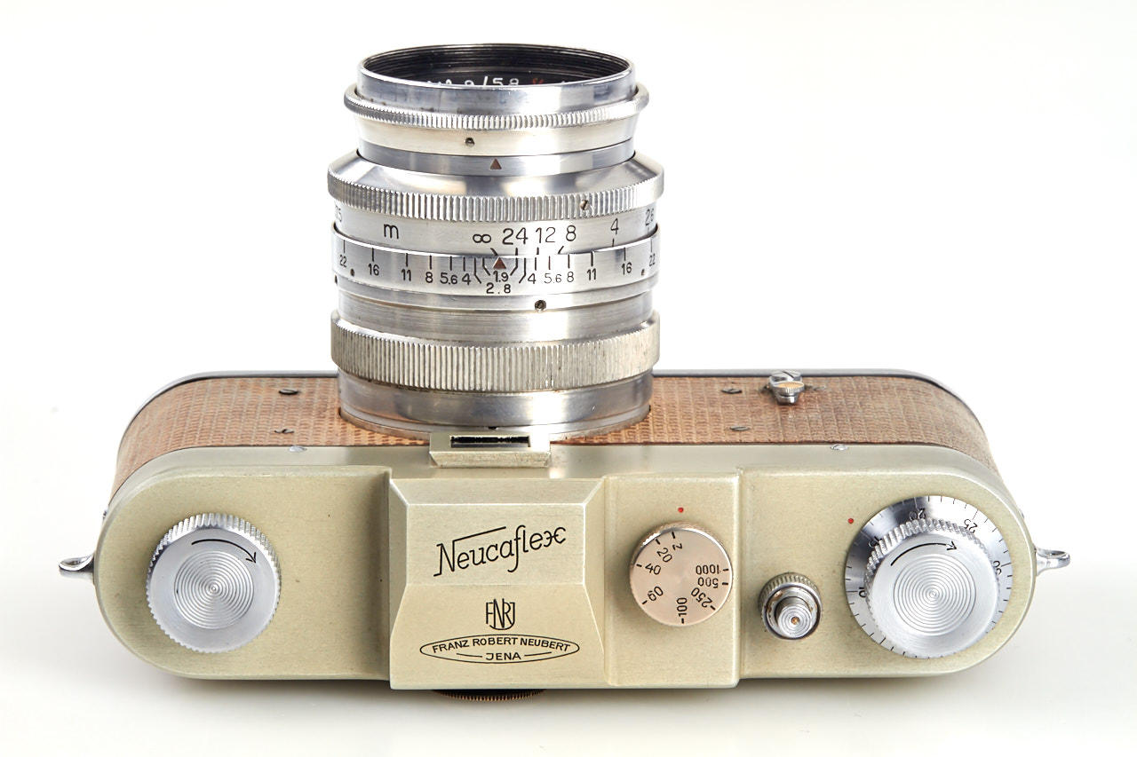 35mm SLR camera with 'periscopic' view finding, similar to the Periflex (and predating it). The camera was designed and made by Franz Robert Neubert in Jena from 1950, based on his earlier Leica copy, the Neuca. Made in very small numbers, only about 3-4 Neucaflex cameras are known to exist. It has a mirror and pentaprism, arranged to give a magnified view of the center of the frame in the viewfinder for focusing. When the shutter release is pressed slightly, both the mirror and pentaprism swing out of the optical path, and the eyepiece now forms part of a reverse-Galilean finder for framing before exposure. The camera uses Leica-mount lenses, and its controls (shutter speed selector, film advance and rewind knobs) are similar to those of a Leica. It has shutter speeds 1/20 - 1/1000 second, plus 'B'. After only a few months, production of a new version of the camera, the Ucaflex began, by UCA in Flensburg. The offered camera has a unique finish with 'reptile' imitation leather covering. It comes with three matching Meyer M39 lenses: (1) Primoplan 1.9/58mm no.1109616, (2) Trioplan 2.8/100mm no.1125855, (3) Tele Megor 5.5/180mm no.1112951 - all lenses in perfect condition, with caps, 2 special Meyer cases. The camera is in beautiful original condition, the base plate is stamped '20' and comes with original leather case, and also 17.5mm + 35mm extension tubes - a sensational discovery from the early German post-war camera history !
