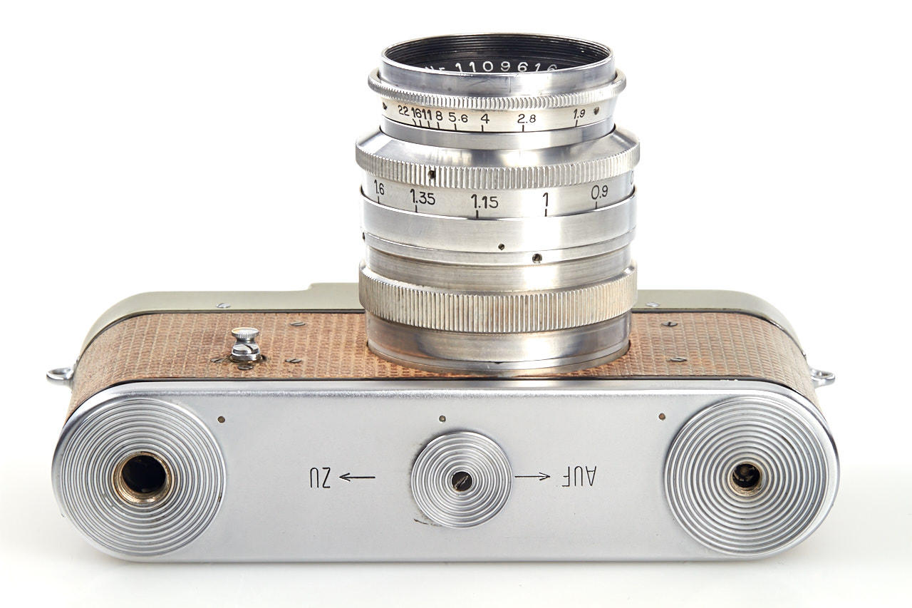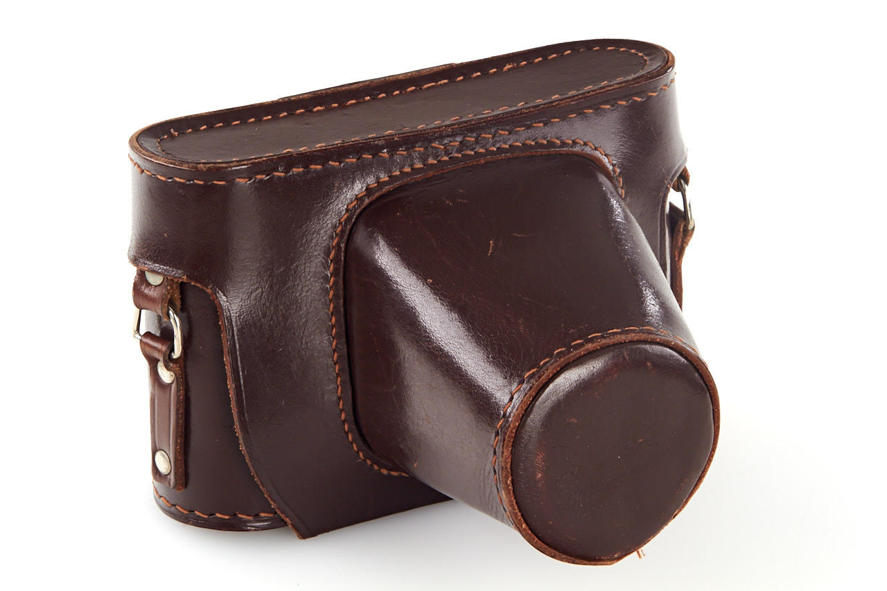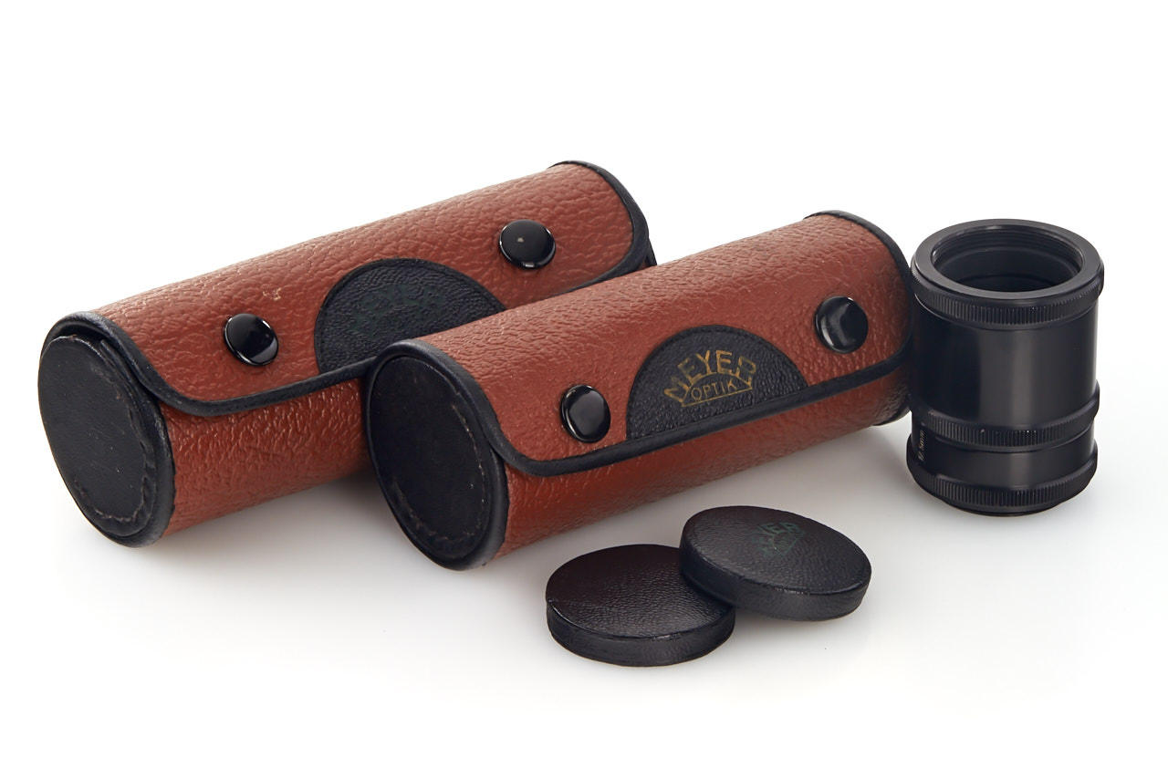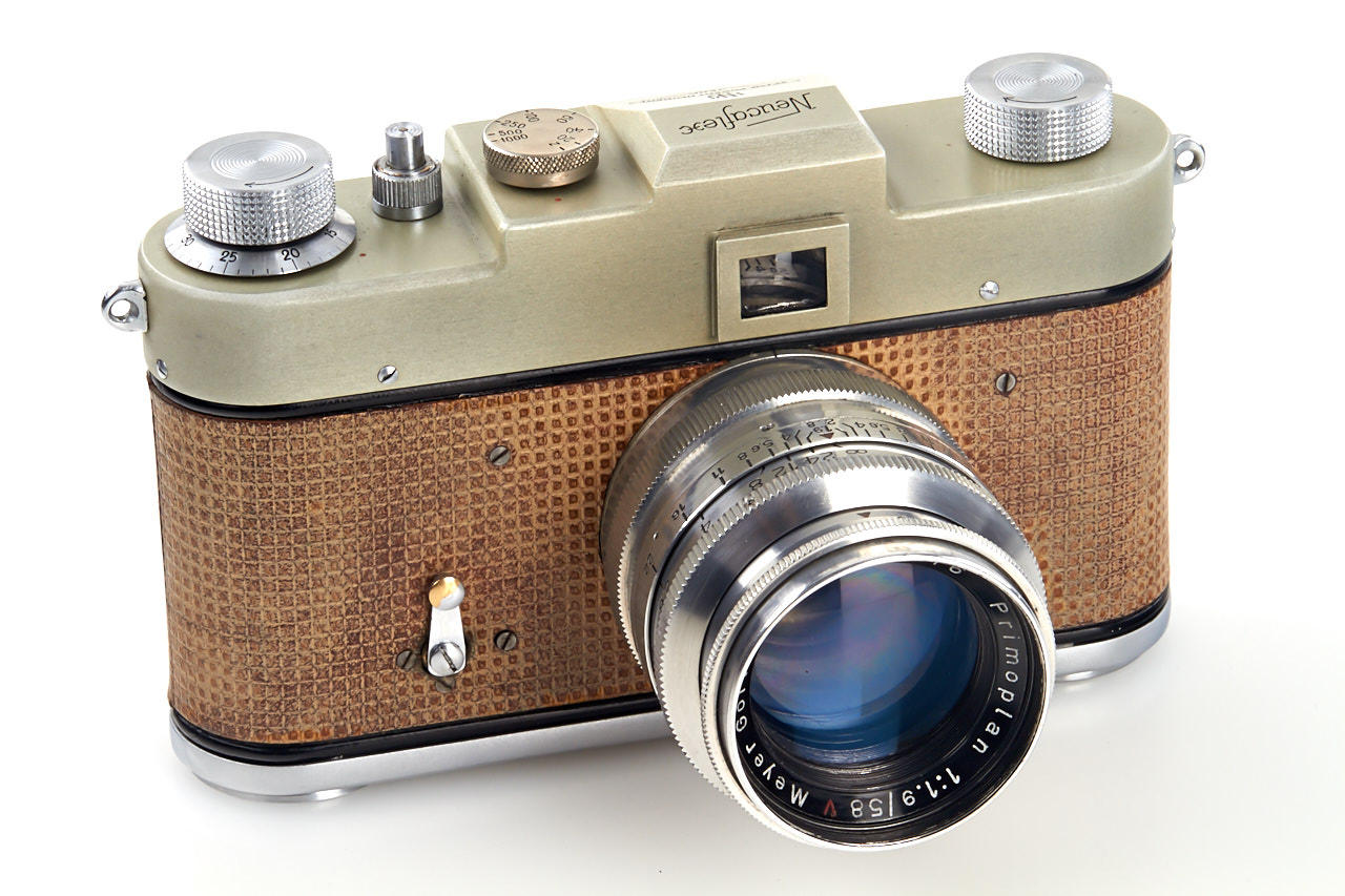 35mm SLR camera with 'periscopic' view finding, similar to the Periflex (and predating it). The camera was designed and made by Franz Robert Neubert in Jena from 1950, based on his earlier Leica copy, the Neuca. Made in very small numbers, only about 3-4 Neucaflex cameras are known to exist. It has a mirror and pentaprism, arranged to give a magnified view of the center of the frame in the viewfinder for focusing. When the shutter release is pressed slightly, both the mirror and pentaprism swing out of the optical path, and the eyepiece now forms part of a reverse-Galilean finder for framing before exposure. The camera uses Leica-mount lenses, and its controls (shutter speed selector, film advance and rewind knobs) are similar to those of a Leica. It has shutter speeds 1/20 - 1/1000 second, plus 'B'. After only a few months, production of a new version of the camera, the Ucaflex began, by UCA in Flensburg. The offered camera has a unique finish with 'reptile' imitation leather covering. It comes with three matching Meyer M39 lenses: (1) Primoplan 1.9/58mm no.1109616, (2) Trioplan 2.8/100mm no.1125855, (3) Tele Megor 5.5/180mm no.1112951 - all lenses in perfect condition, with caps, 2 special Meyer cases. The camera is in beautiful original condition, the base plate is stamped '20' and comes with original leather case, and also 17.5mm + 35mm extension tubes - a sensational discovery from the early German post-war camera history !