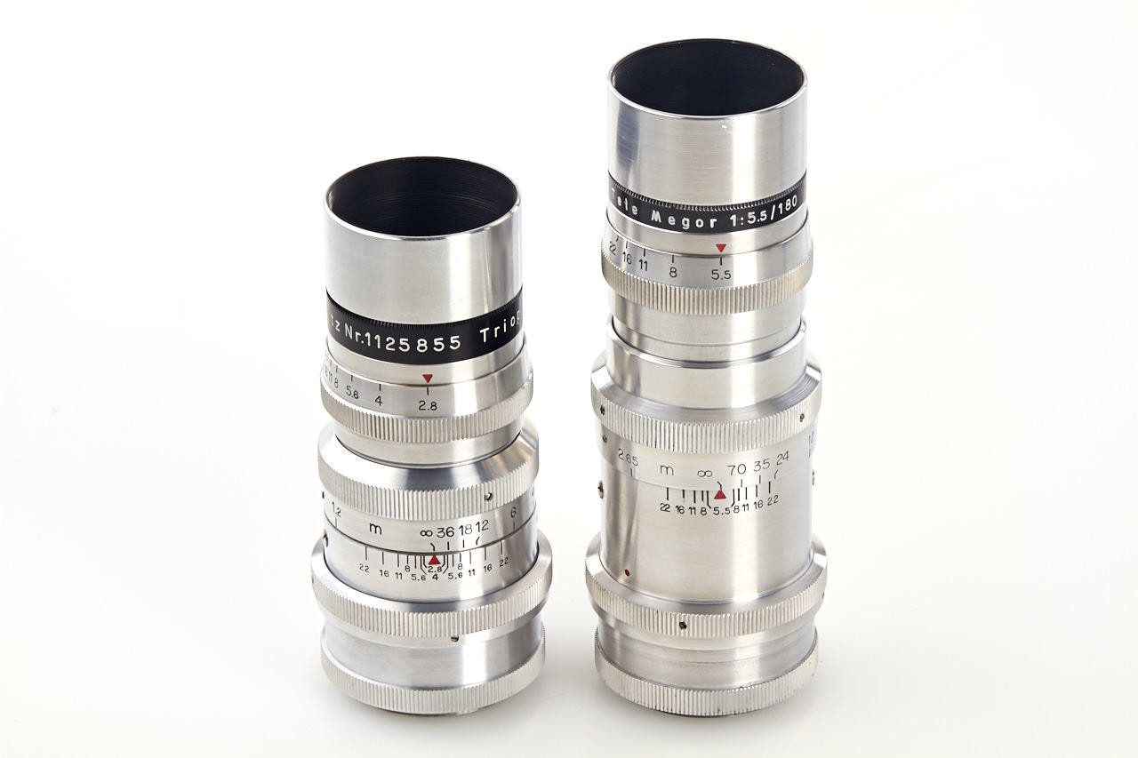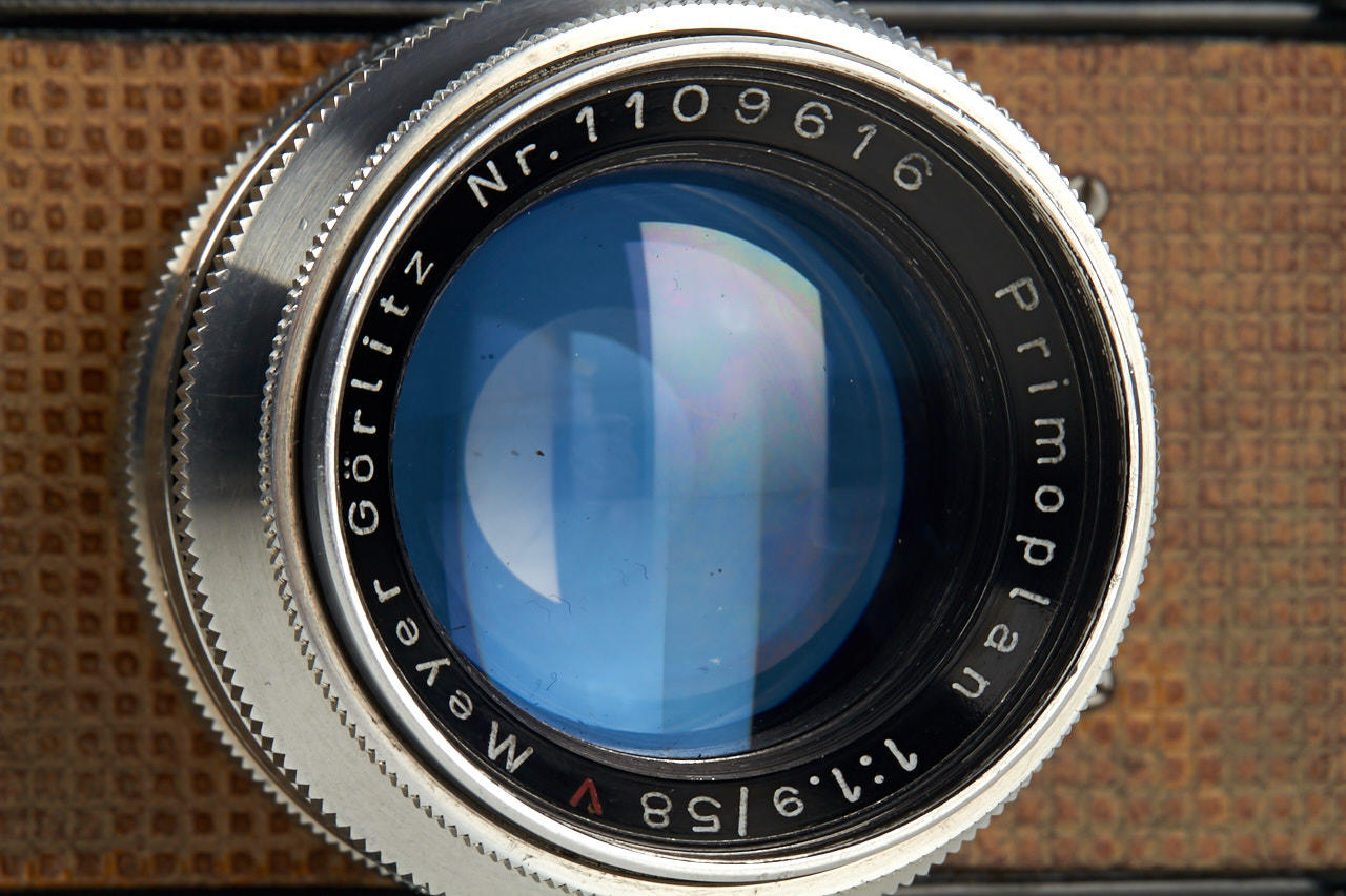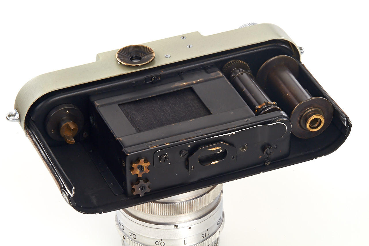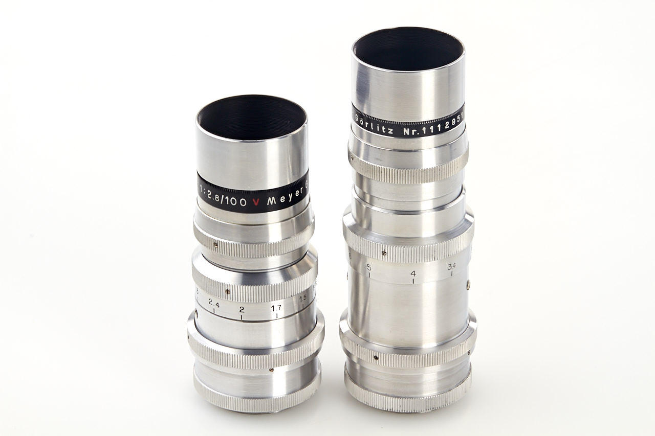 35mm SLR camera with 'periscopic' view finding, similar to the Periflex (and predating it). The camera was designed and made by Franz Robert Neubert in Jena from 1950, based on his earlier Leica copy, the Neuca. Made in very small numbers, only about 3-4 Neucaflex cameras are known to exist. It has a mirror and pentaprism, arranged to give a magnified view of the center of the frame in the viewfinder for focusing. When the shutter release is pressed slightly, both the mirror and pentaprism swing out of the optical path, and the eyepiece now forms part of a reverse-Galilean finder for framing before exposure. The camera uses Leica-mount lenses, and its controls (shutter speed selector, film advance and rewind knobs) are similar to those of a Leica. It has shutter speeds 1/20 - 1/1000 second, plus 'B'. After only a few months, production of a new version of the camera, the Ucaflex began, by UCA in Flensburg. The offered camera has a unique finish with 'reptile' imitation leather covering. It comes with three matching Meyer M39 lenses: (1) Primoplan 1.9/58mm no.1109616, (2) Trioplan 2.8/100mm no.1125855, (3) Tele Megor 5.5/180mm no.1112951 - all lenses in perfect condition, with caps, 2 special Meyer cases. The camera is in beautiful original condition, the base plate is stamped '20' and comes with original leather case, and also 17.5mm + 35mm extension tubes - a sensational discovery from the early German post-war camera history !