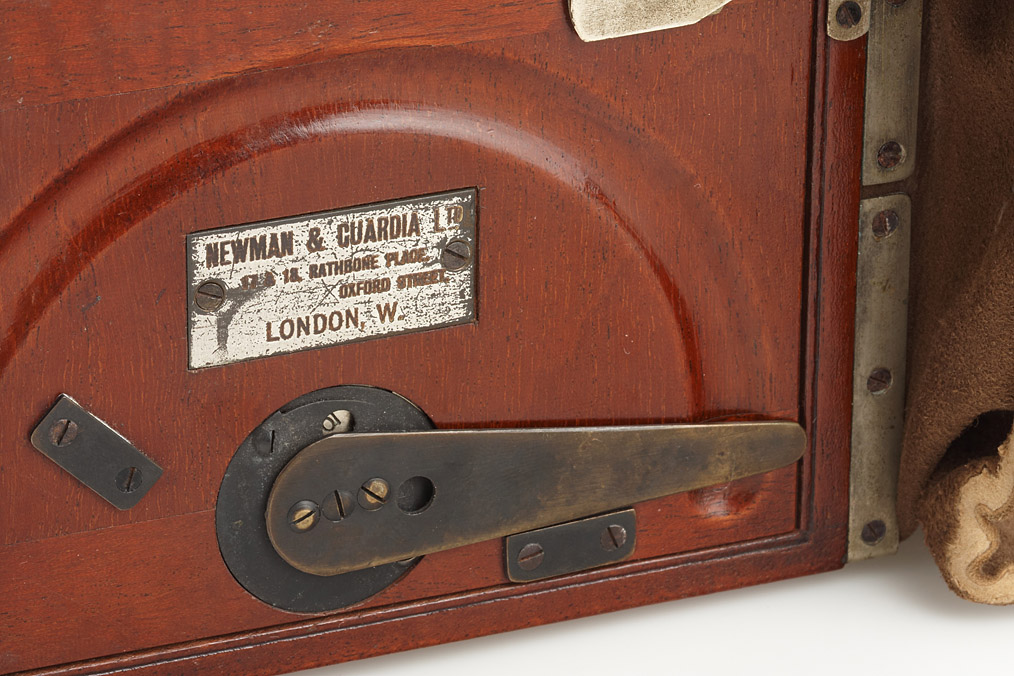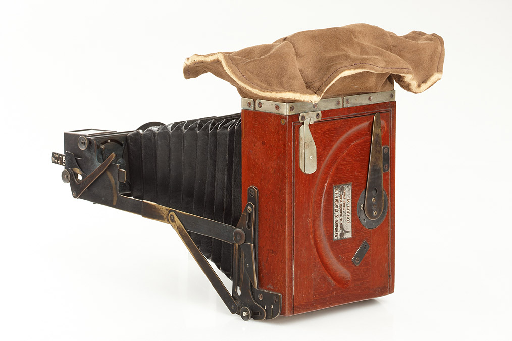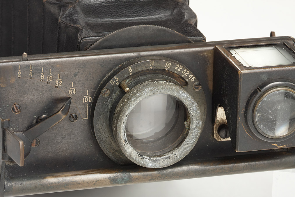 Unusual design which is essentially a Newman bag changer for eight quarter plates with changing lever and automatic counter, to which is attached a folding camera. Carl Zeiss Jena Protarlinse 240mm no.54616 lens with between-lens iris diaphragm and eyelid type shutter with speeds 2 to 1/100 sec. Probably the most portable of the magazine cameras.