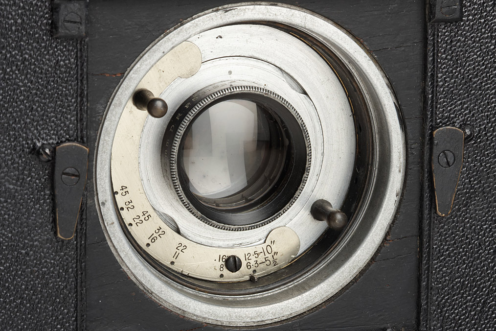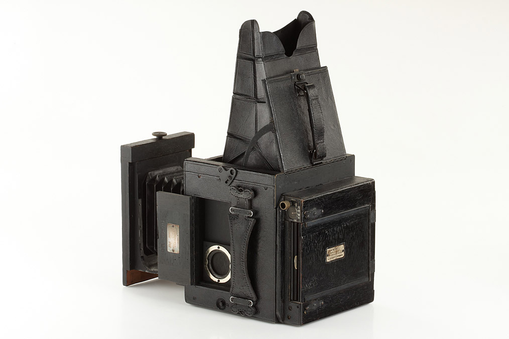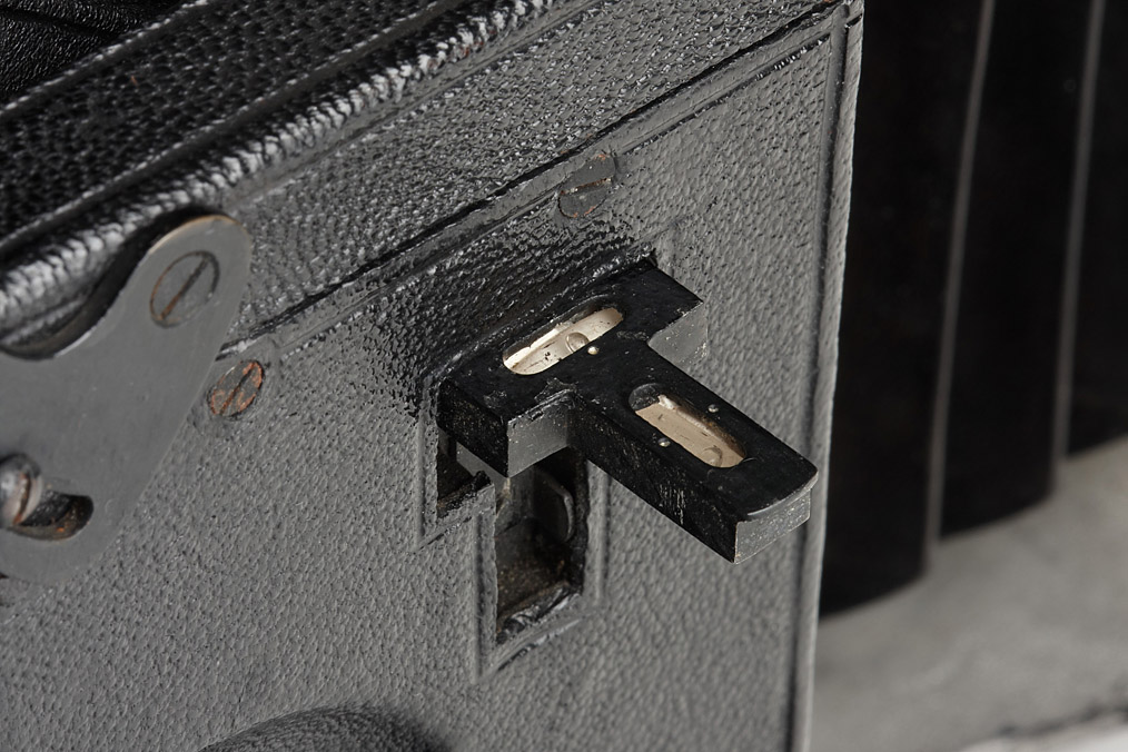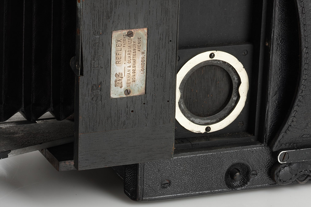 6.5x9cm, leather covered reflex camera with Protarlinse 240mm no.56109, focal plane shutter (not working), maker's plaque, in very good original condition