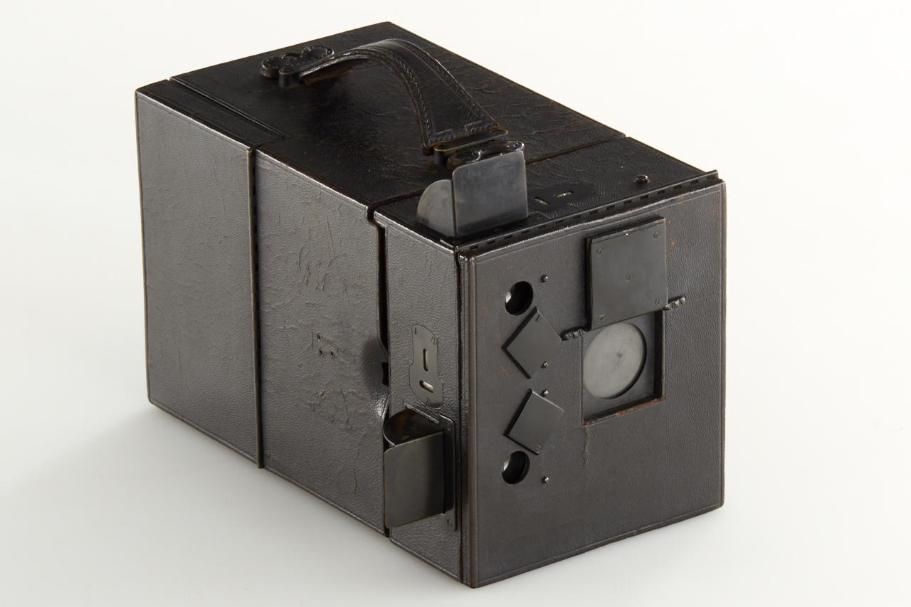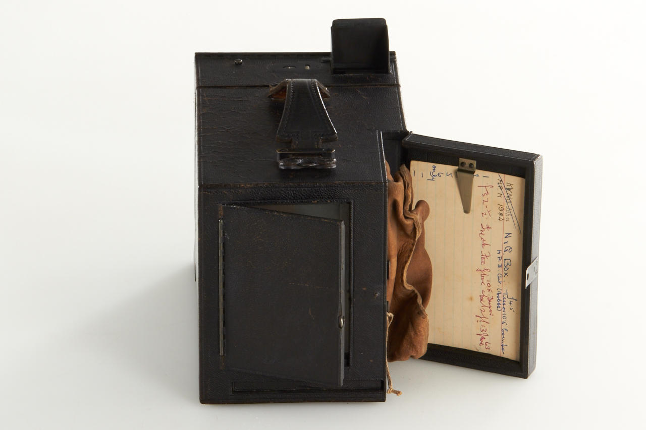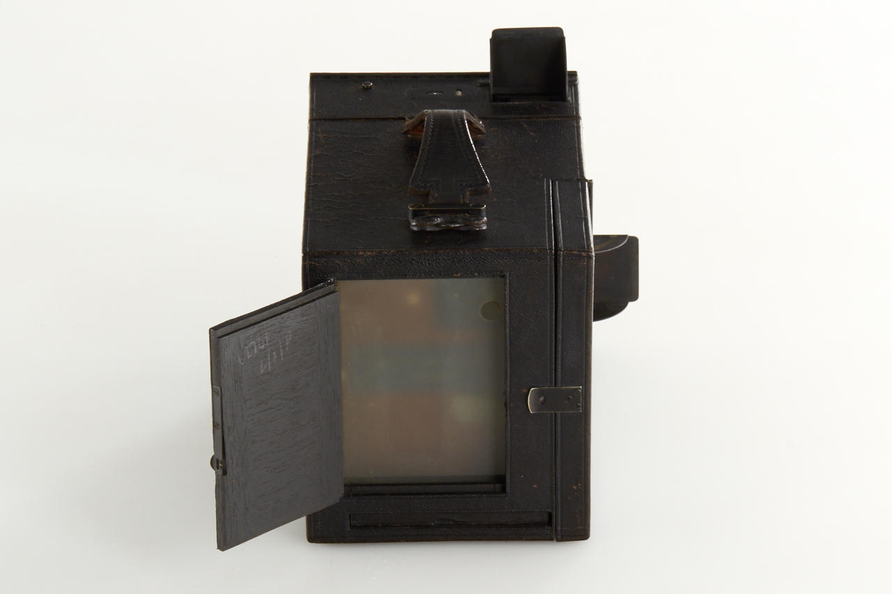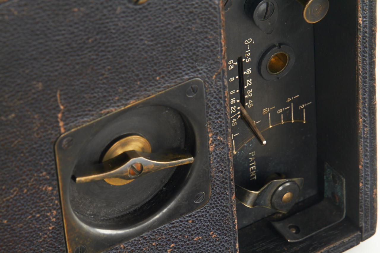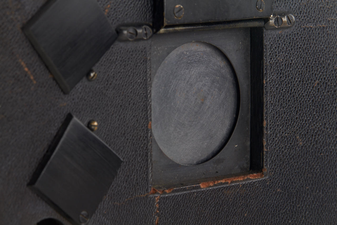 rare leather-covered detective camera in very good working condition, long front extension for close-up photography, inclusive original leather case (lid torn)