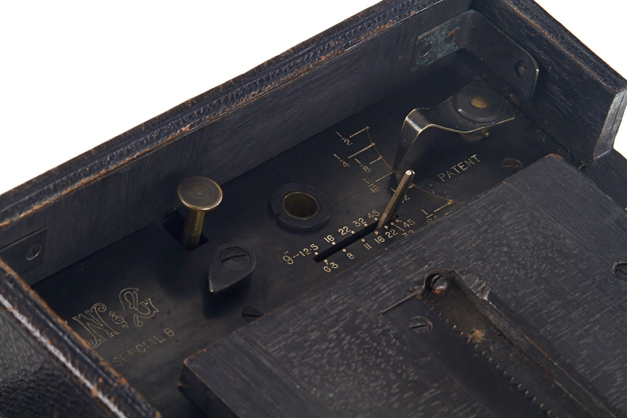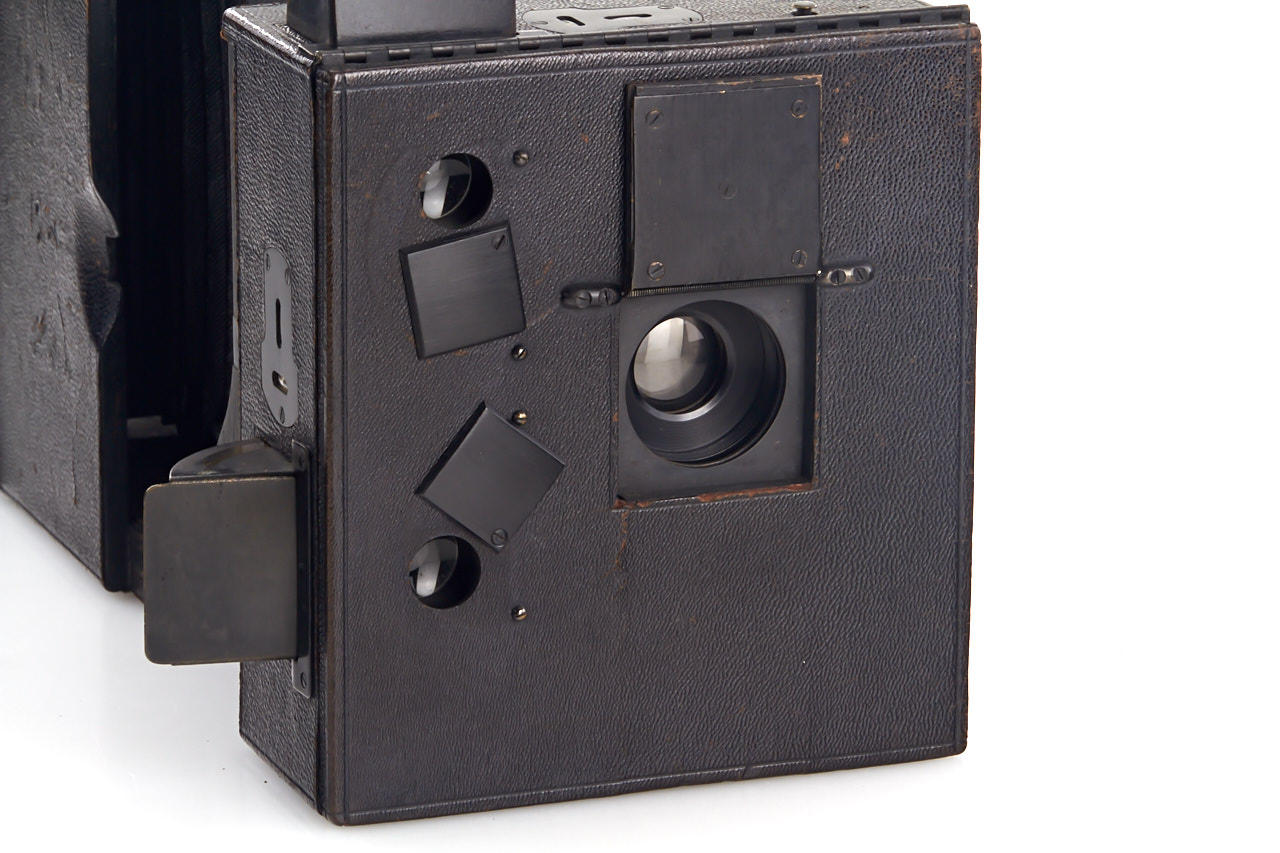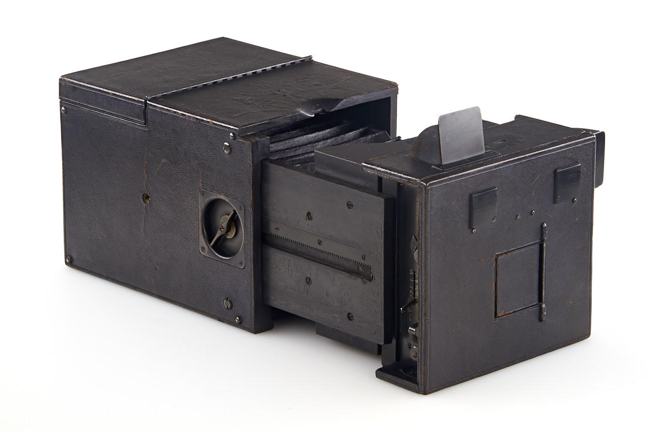 rare leather-covered detective camera in very good working condition, long front extension for close-up photography, inclusive original leather case (lid torn)
