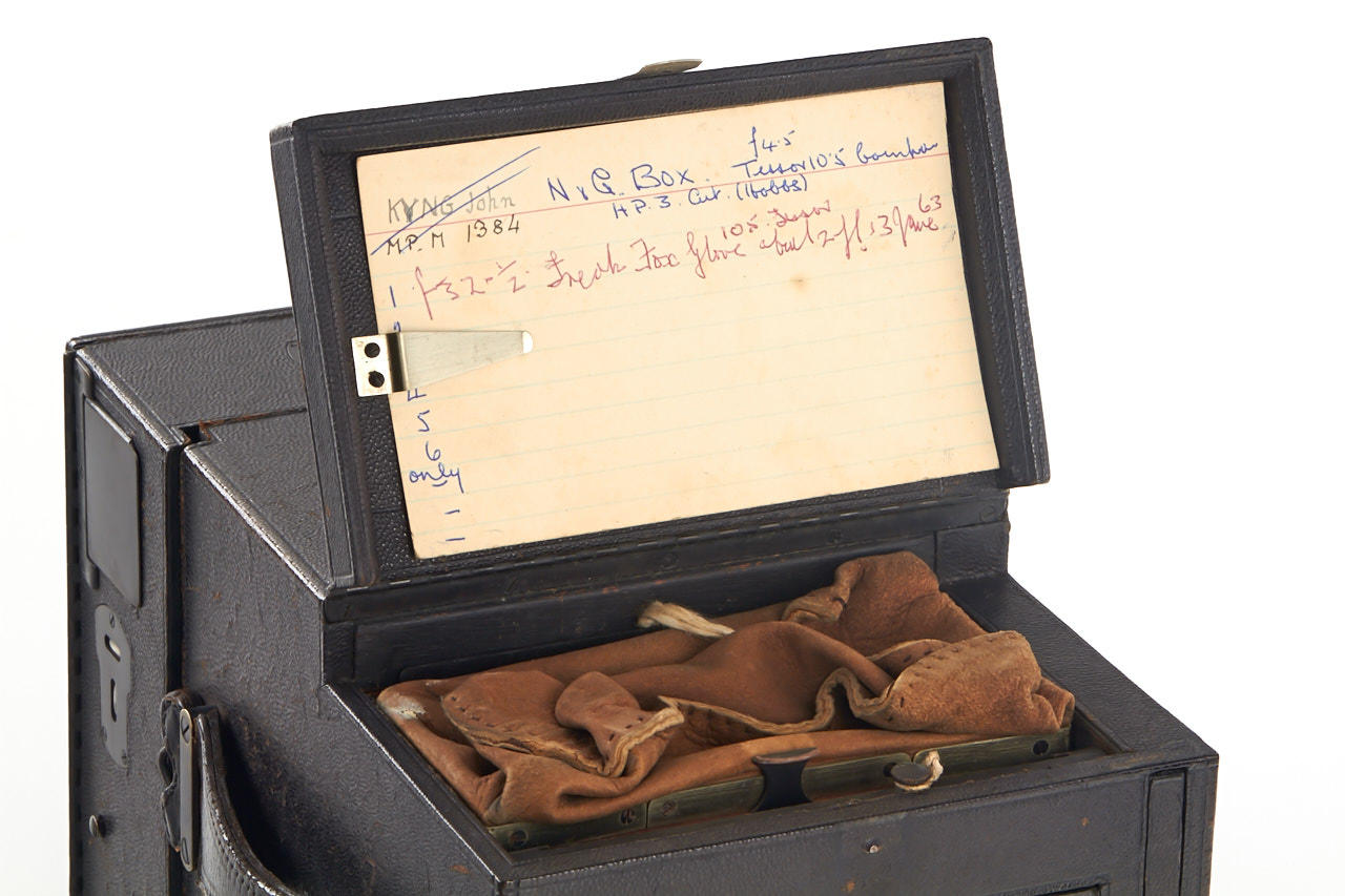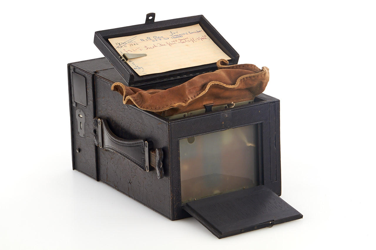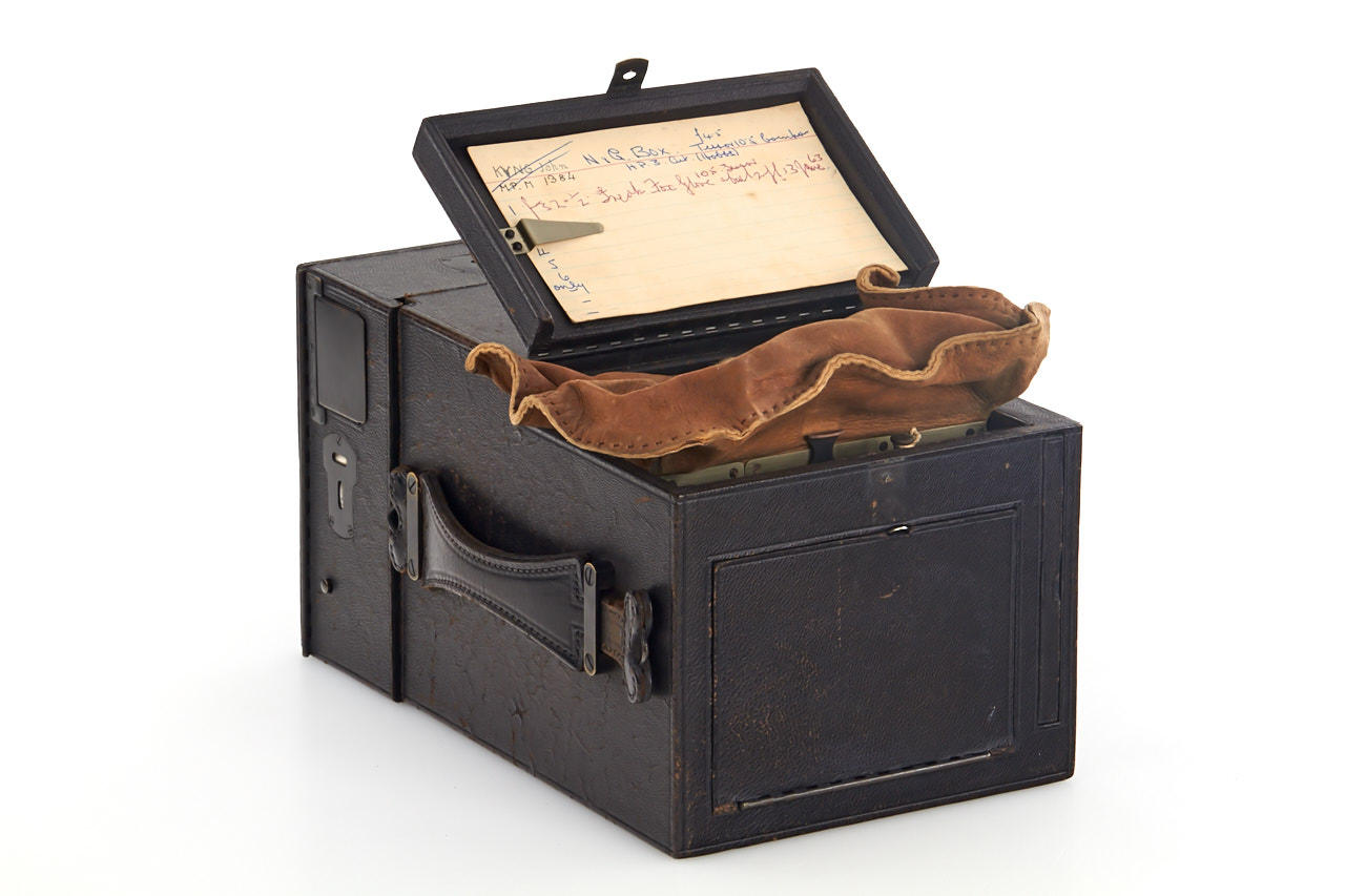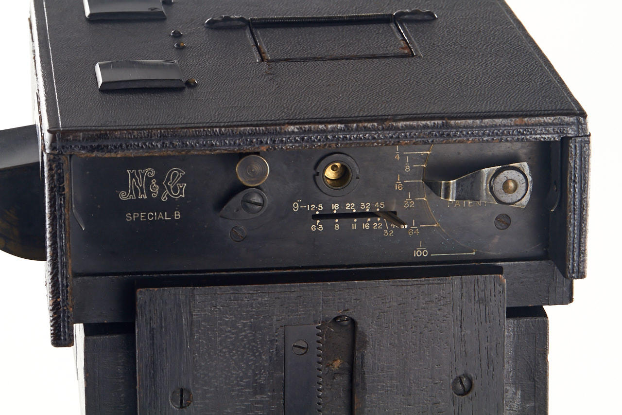 rare leather-covered detective camera in very good working condition, long front extension for close-up photography, inclusive original leather case (lid torn)