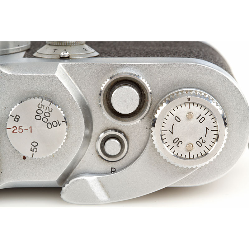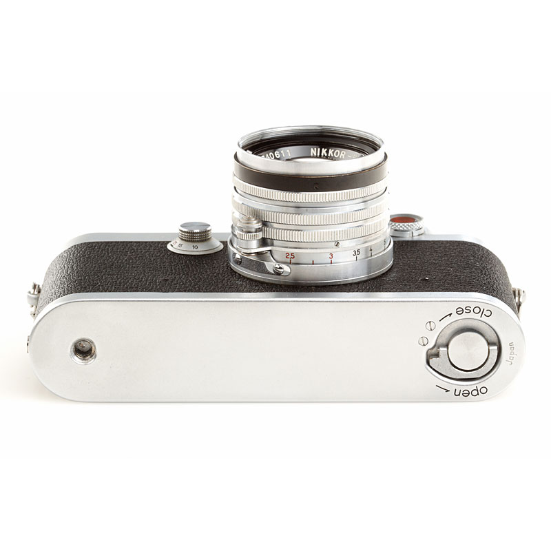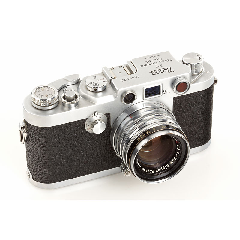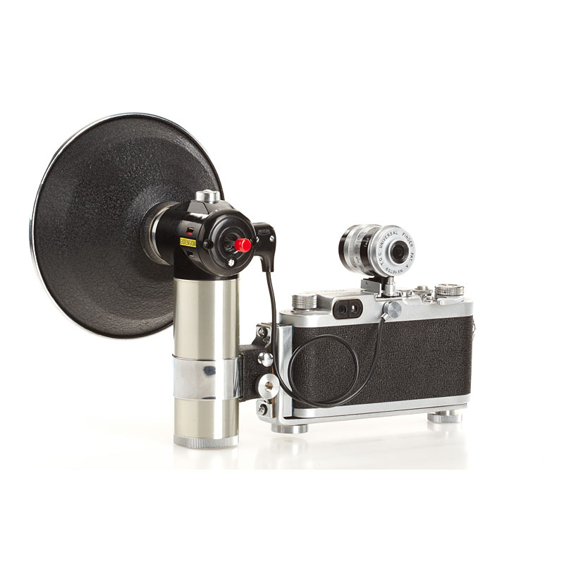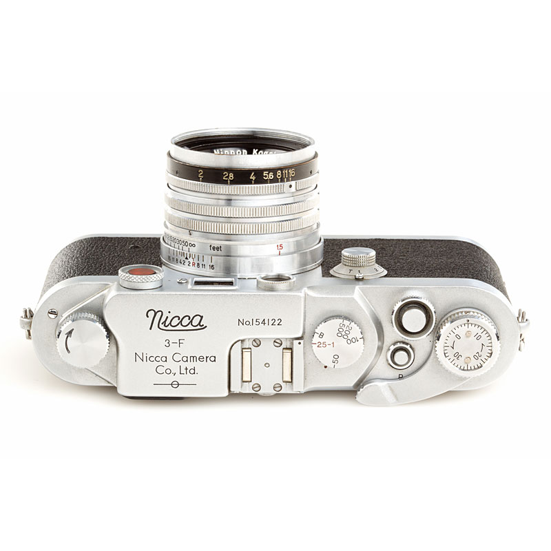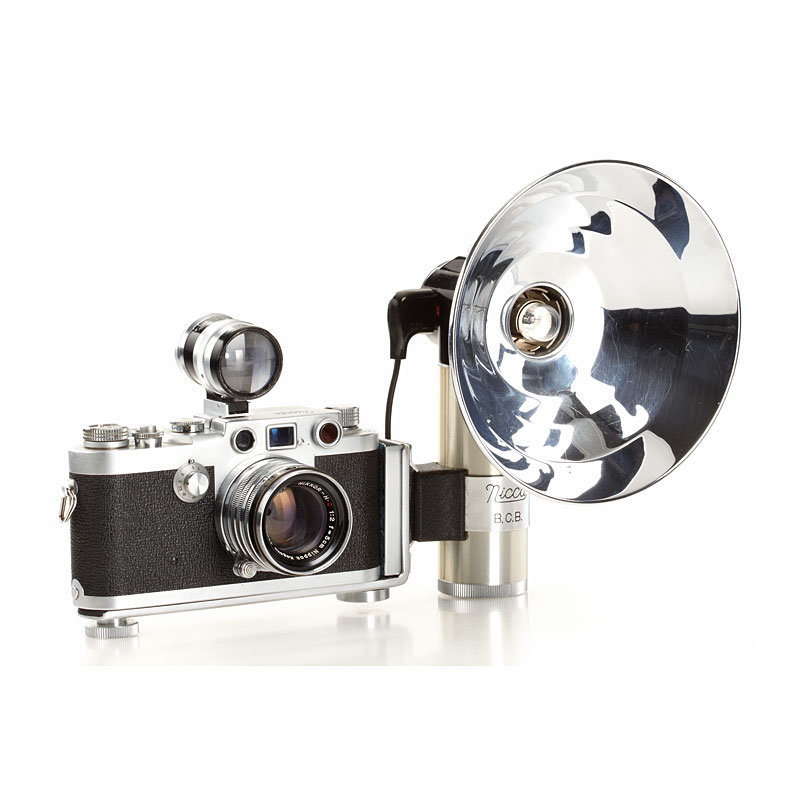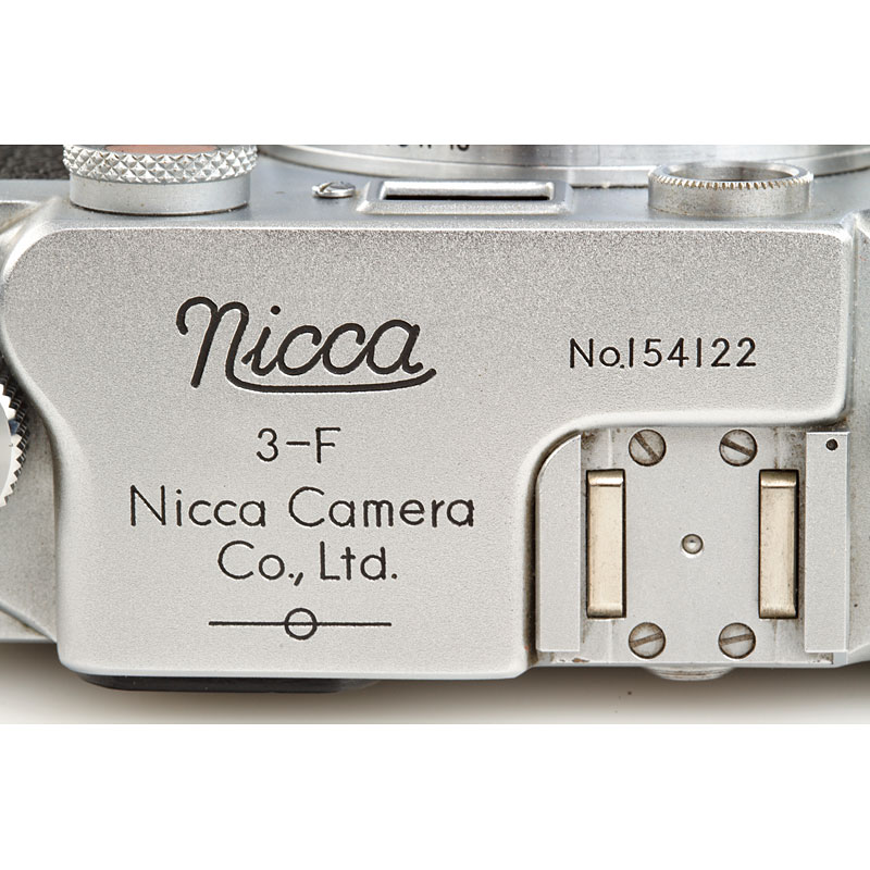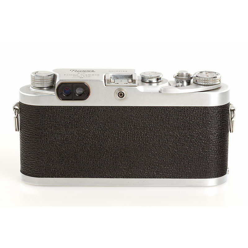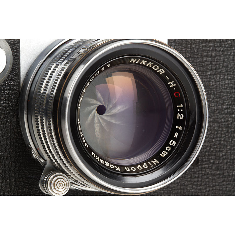 very clean second model, clean finder, shutter and rangefinder, Nikkor-H.C 2/5cm no.740611 (black aperture ring, focus to 1.5 feet, Nicca cap), chrome Nicca hood (with maker's box), ever-ready case, instruction book, maker's box, also with matching Topcor 3.5/13.5cm no.55181 (caps) with Nicca universal finder no.16739 and original Nicca flash unit with maker's box