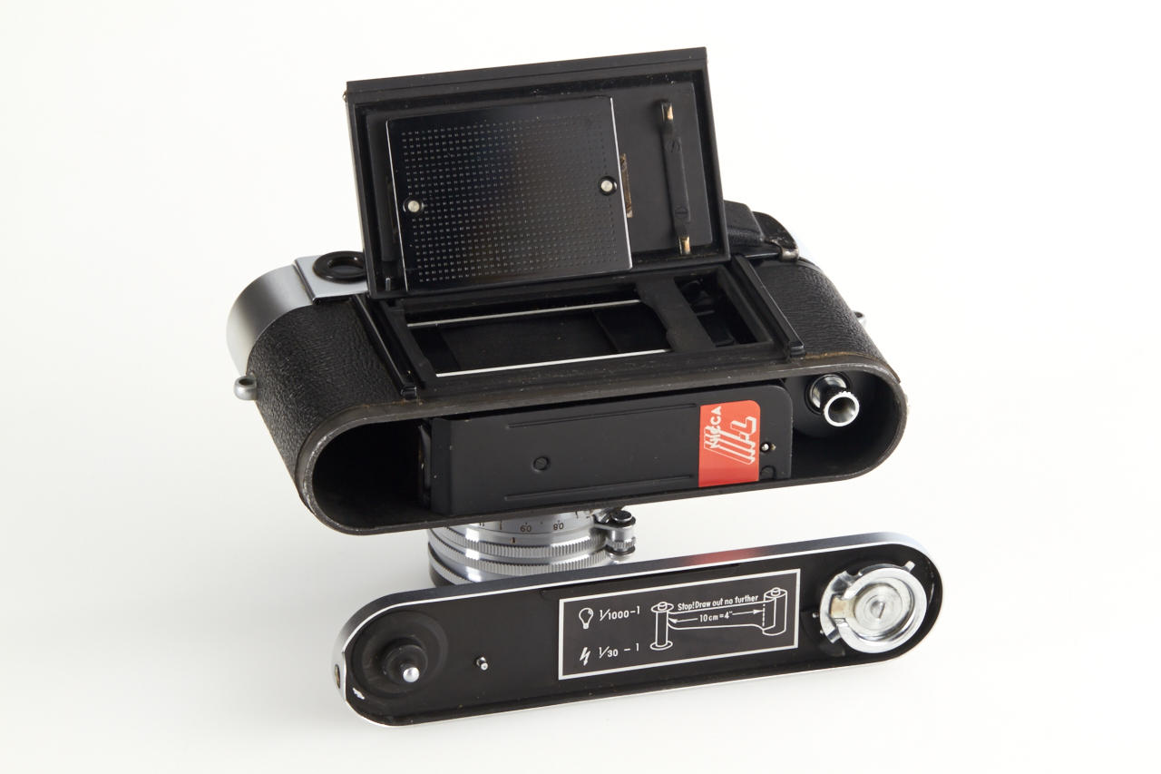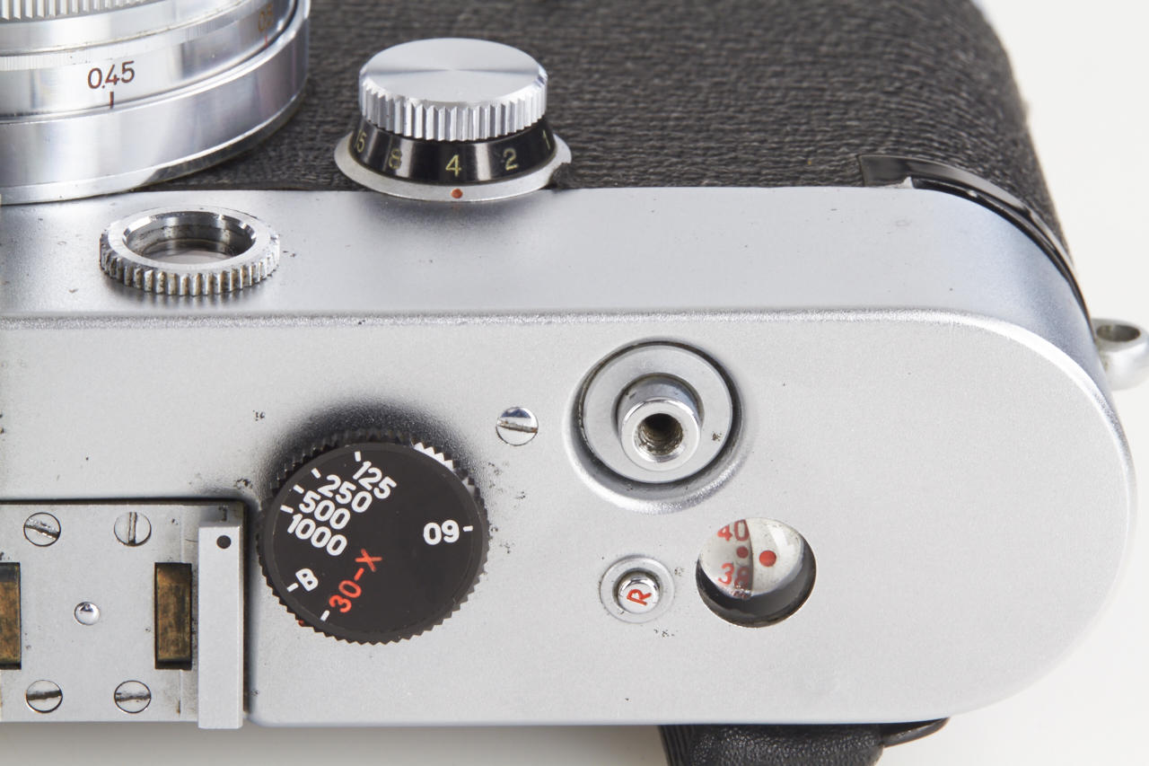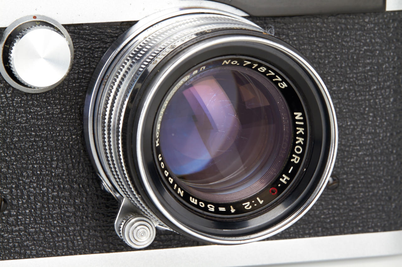 M39 rangefinder camera with the design influenced by the Leica M3, quite rare, in good working condition with slight separation in finder, with clean Nikkor-H 2/5cm no.718773 (only few cleaning marks), worn everready case