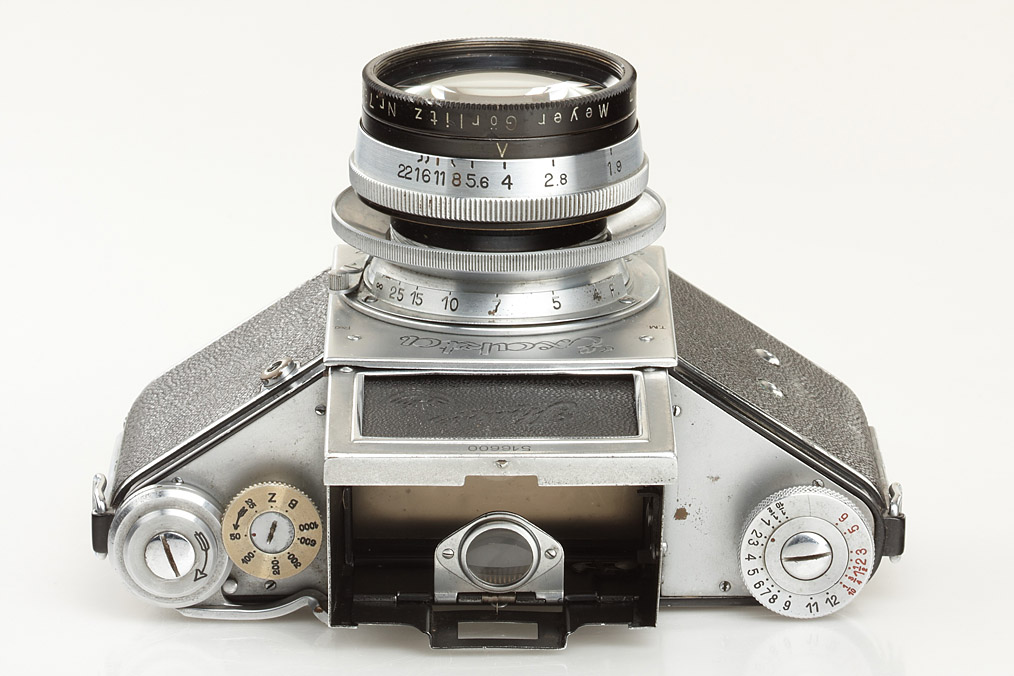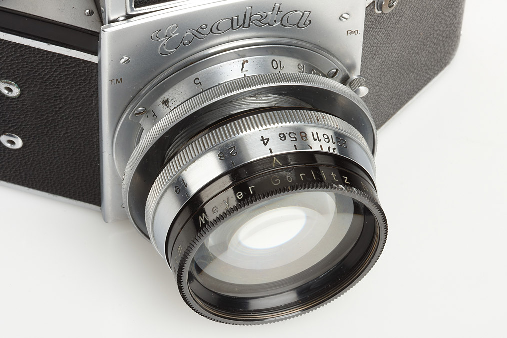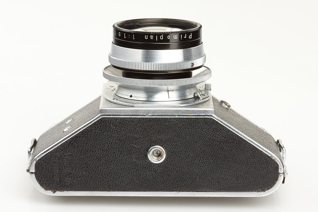 SLR for 4x6.5cm, very rare chrome 4th version Night Exakta (shutter needs repair), with matching Primoplan 1.9/8cm no.792649, export version (embossed on leather of back door 'Made in Germany', lens in Feet), case