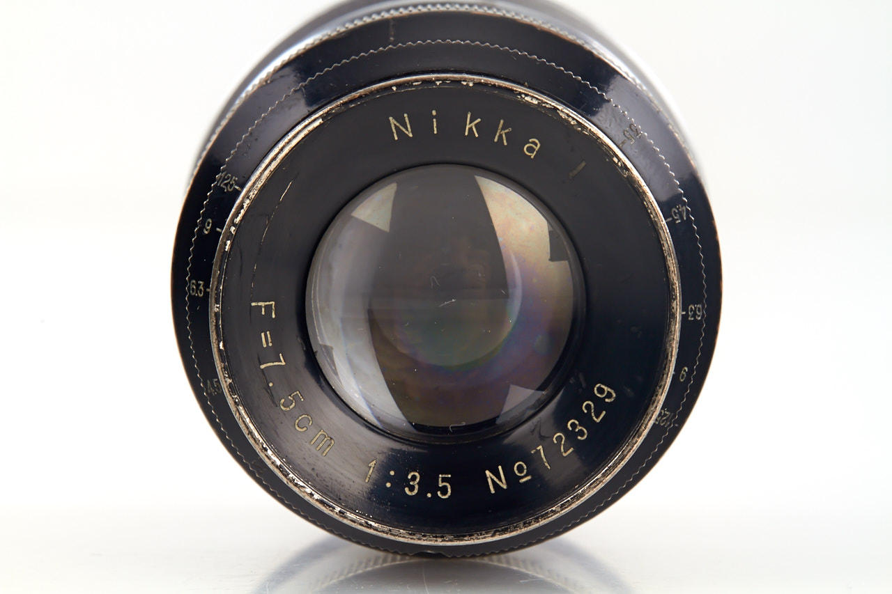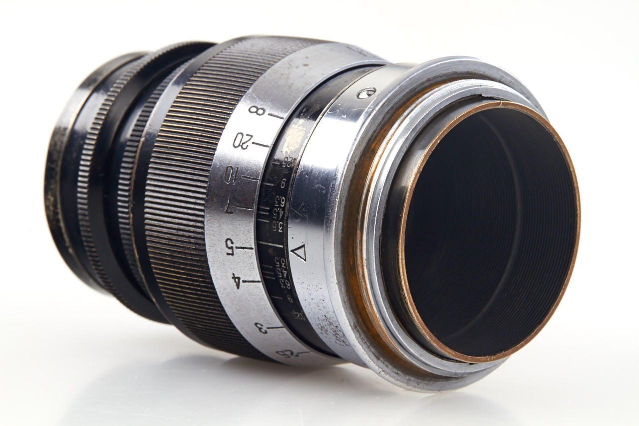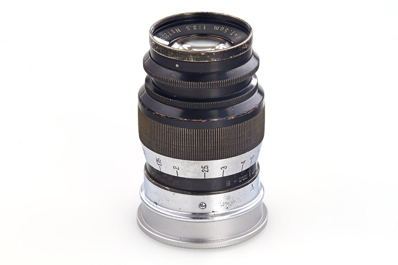 unknown Tessar-type Japanese copy of the Leitz Elmar 9cm with focal length 7.5cm, black paint and chrome finish, RF coupled
