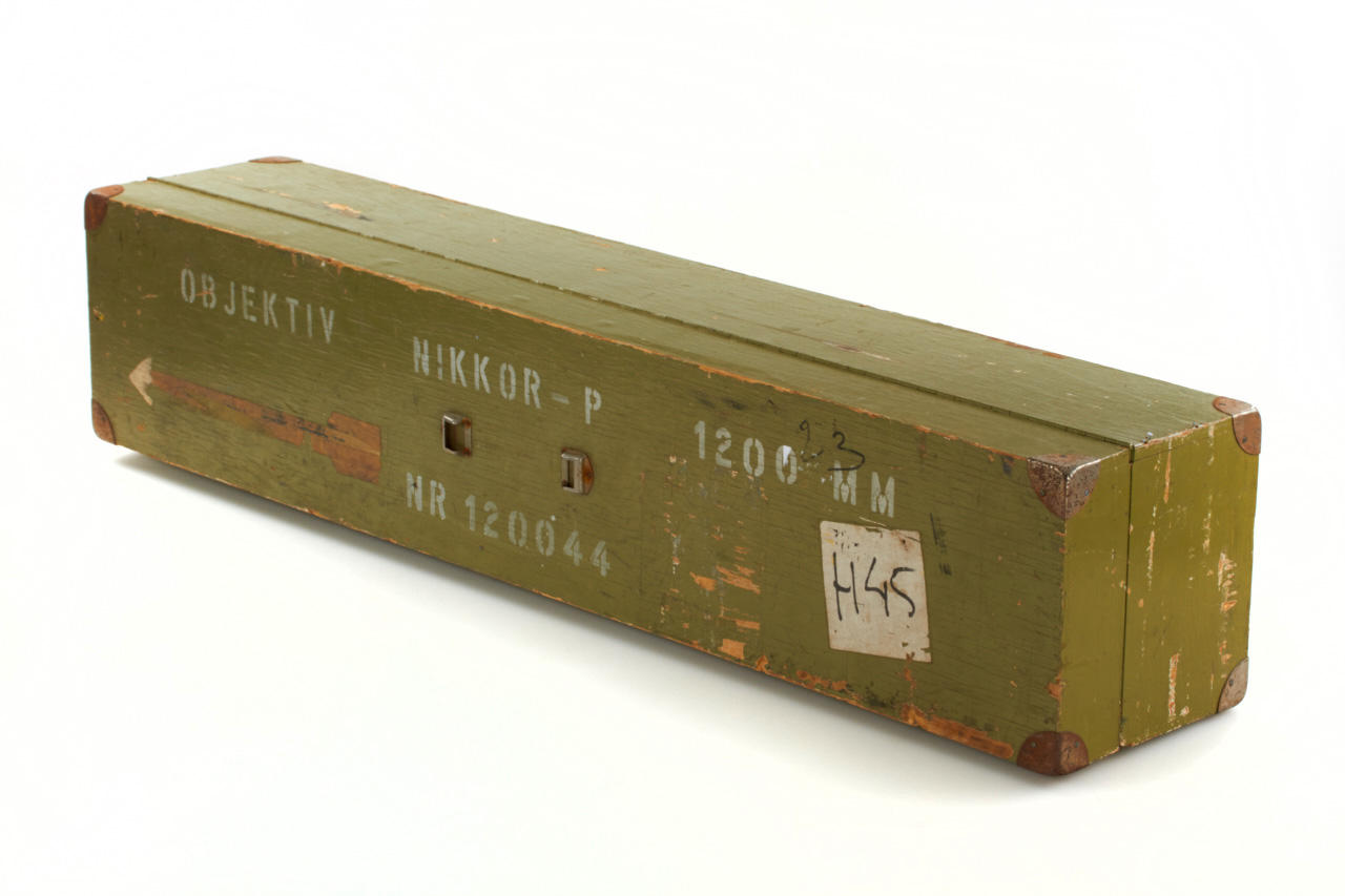 very rare Nikon F lens (number range for this type lens was between 131001-131148, still the confirmed lenses are only between nos.131026-131041, so this is the last lens known to exist), in near mint condition with built-in hood, delivered to the Swedish Navy, with original army-green painted wooden box