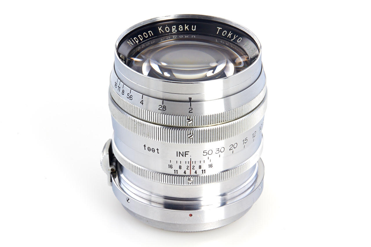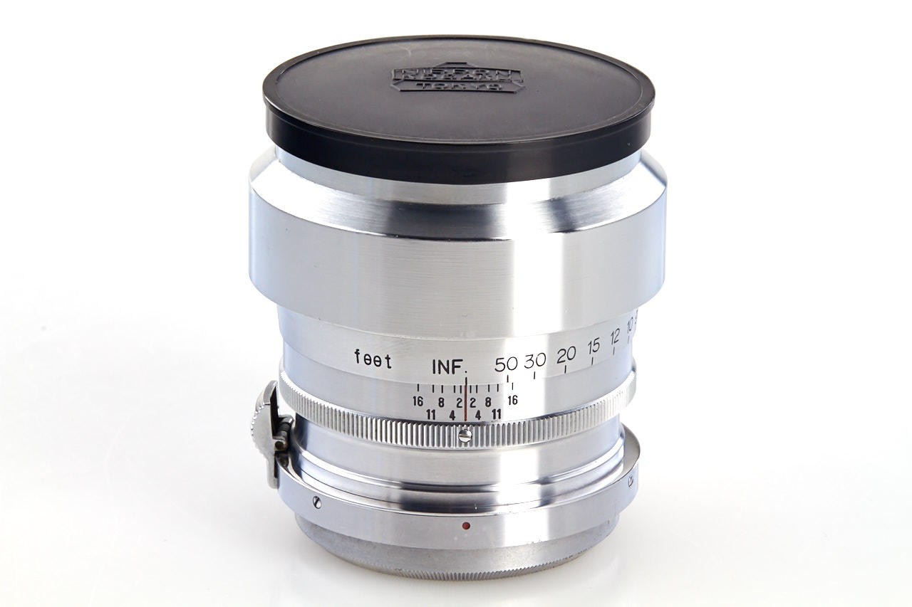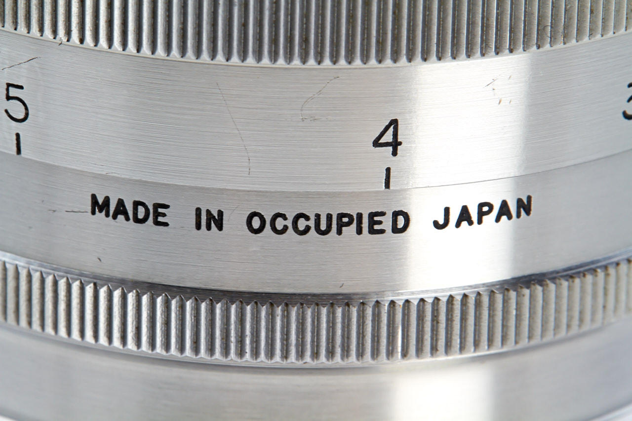 Very early and rare first version 8.5cm lens for Nikon I introduced already in March 1948, produced in April/May 1949. The lens is engraved on the barrel 'MADE IN OCCUPIED JAPAN' is in near mint original condition, complete with chrome hood, front and rear cap, leather case