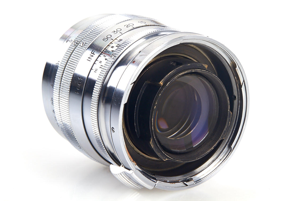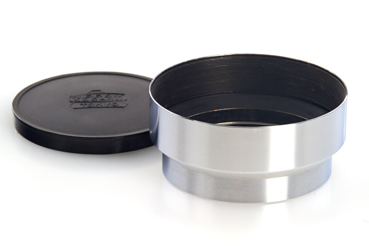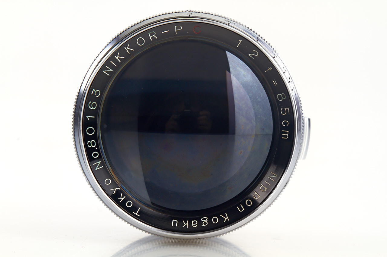 Very early and rare first version 8.5cm lens for Nikon I introduced already in March 1948, produced in April/May 1949. The lens is engraved on the barrel 'MADE IN OCCUPIED JAPAN' is in near mint original condition, complete with chrome hood, front and rear cap, leather case