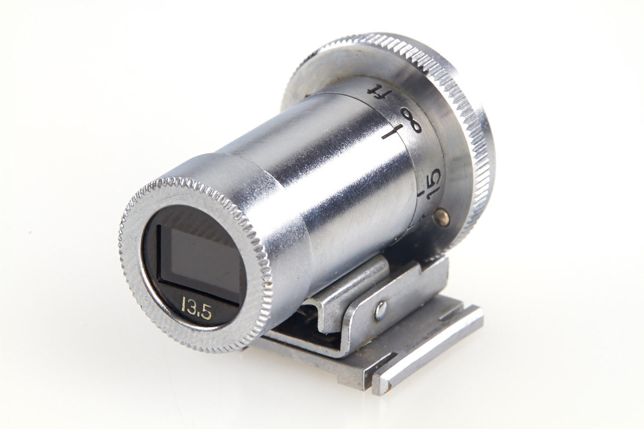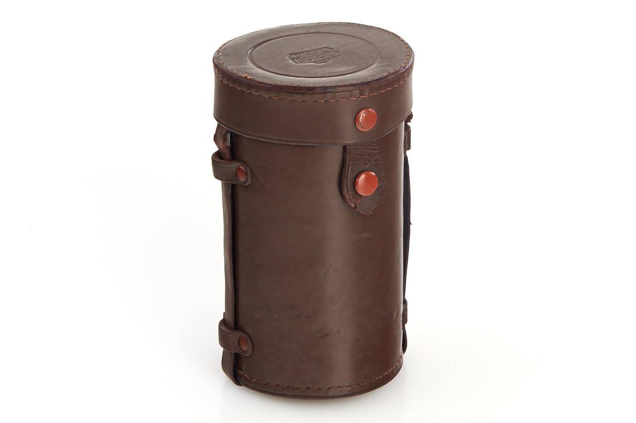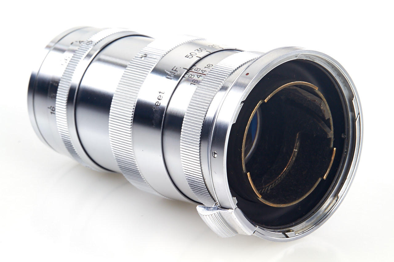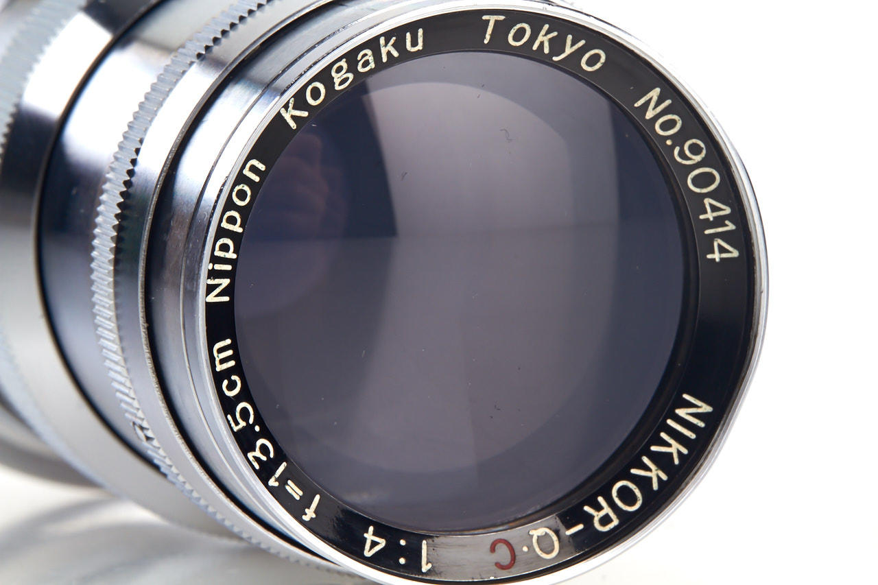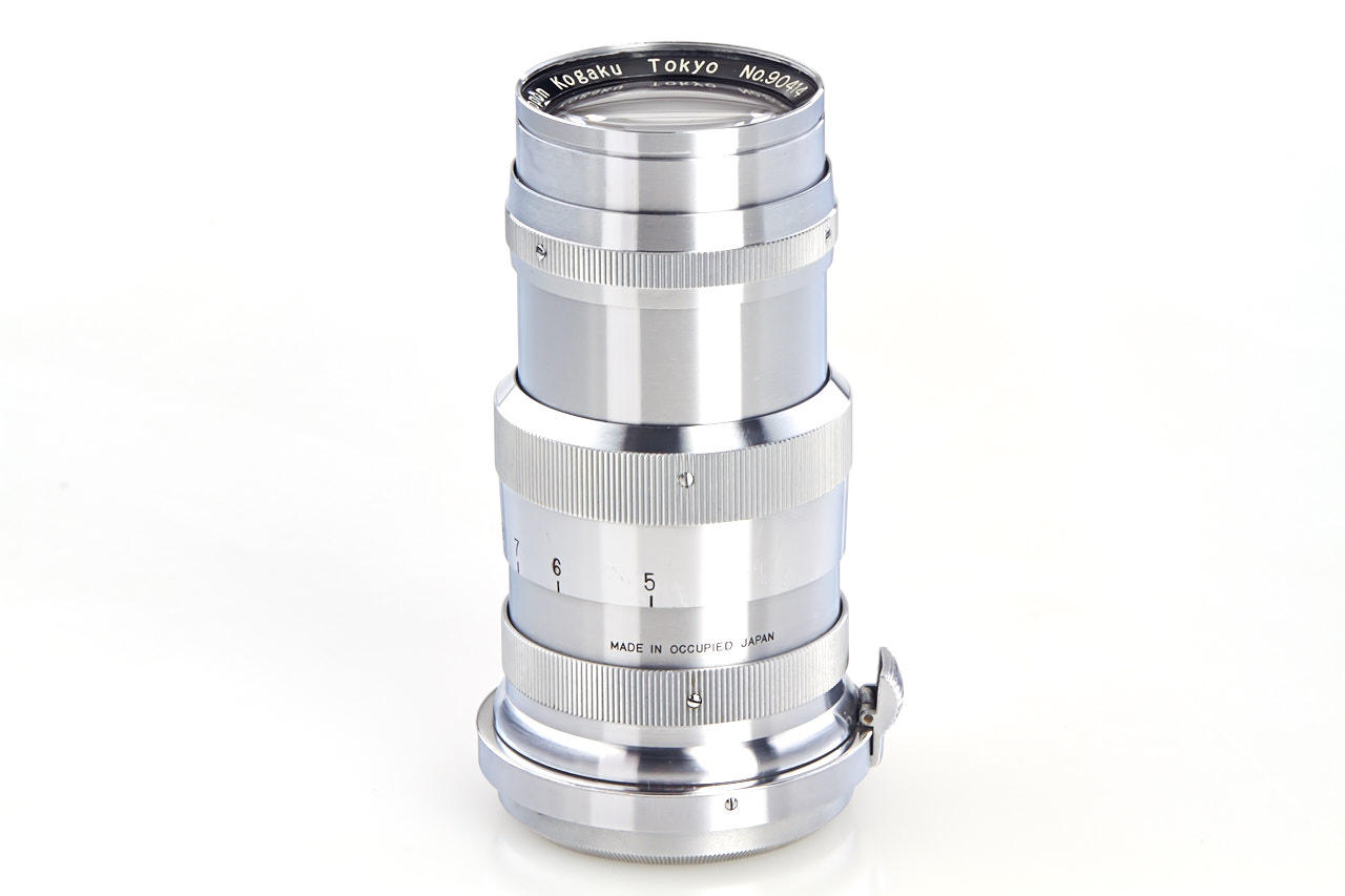 near mint and very rare heavy lens for Nikon M engraved 'MADE IN OCCUPIED JAPAN'; very early serial number, complete with metal hood, black Tokyo cap, brown Tokyo leather case, matching chrome Tokyo 13.5cm finder