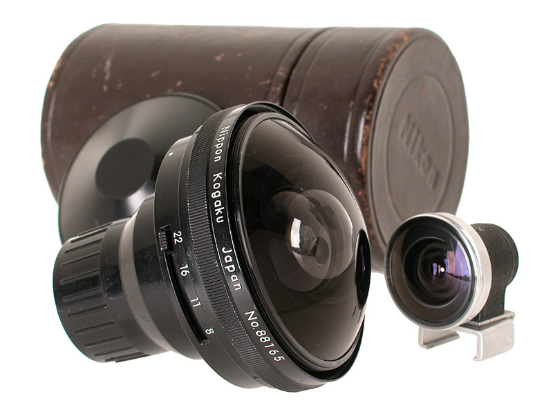 Frühes Objektiv in gutem Zustand mit beiden Deckeln, original Sucher DF-1, Lederköcher