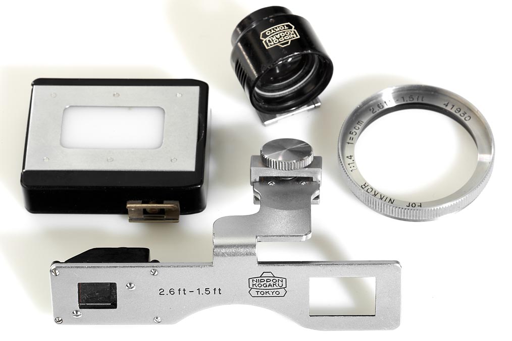 rare black 3.5cm BL finder, very rare and early (for Nikon I, M & S) close focus attachment (2.6 ft - 1.5 ft) with filter for Nikkor 1.4/5cm no.41930 in case, booster f. exposure meter in case, Nikon flash BC-5 in case (4)