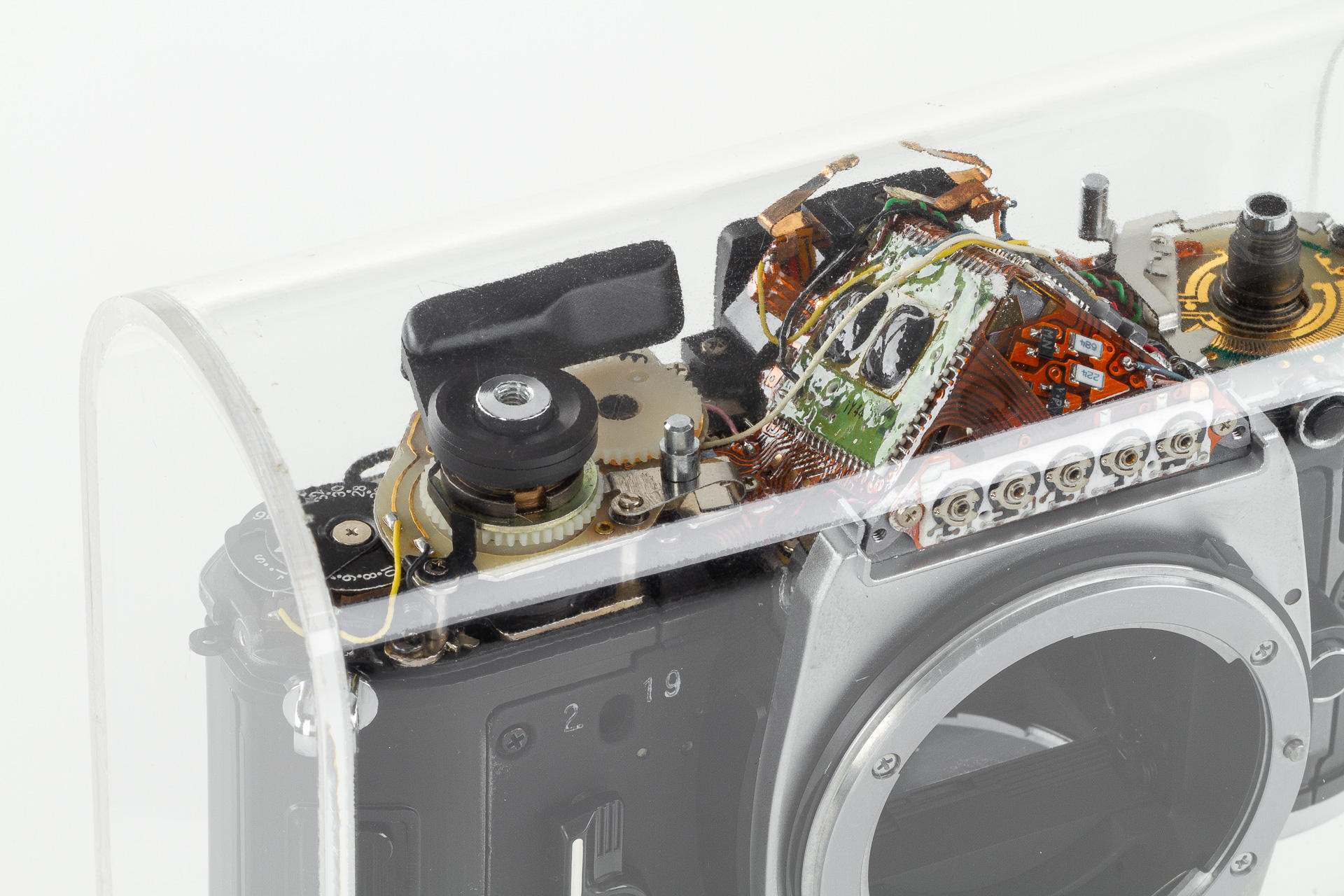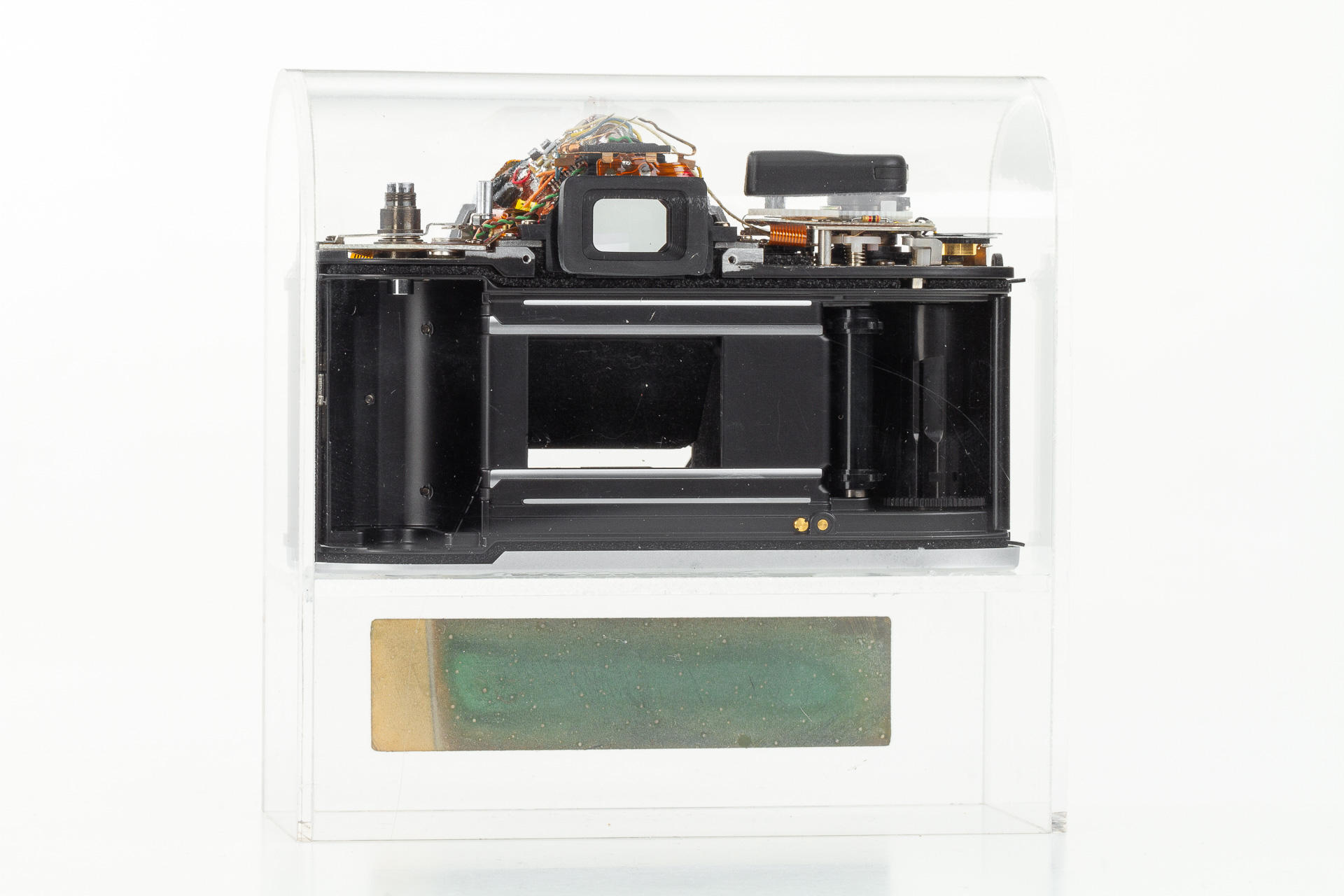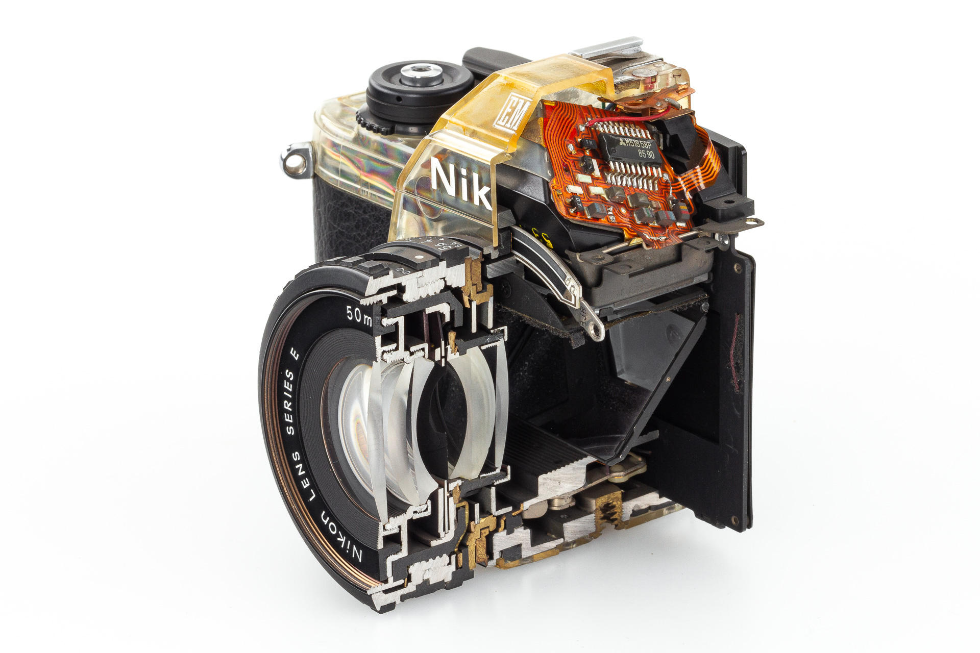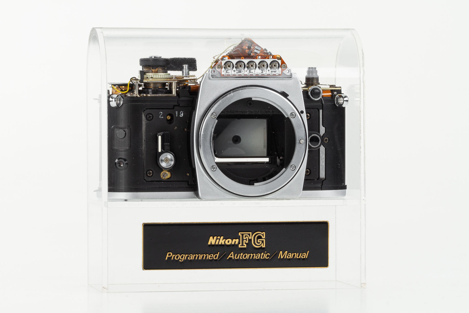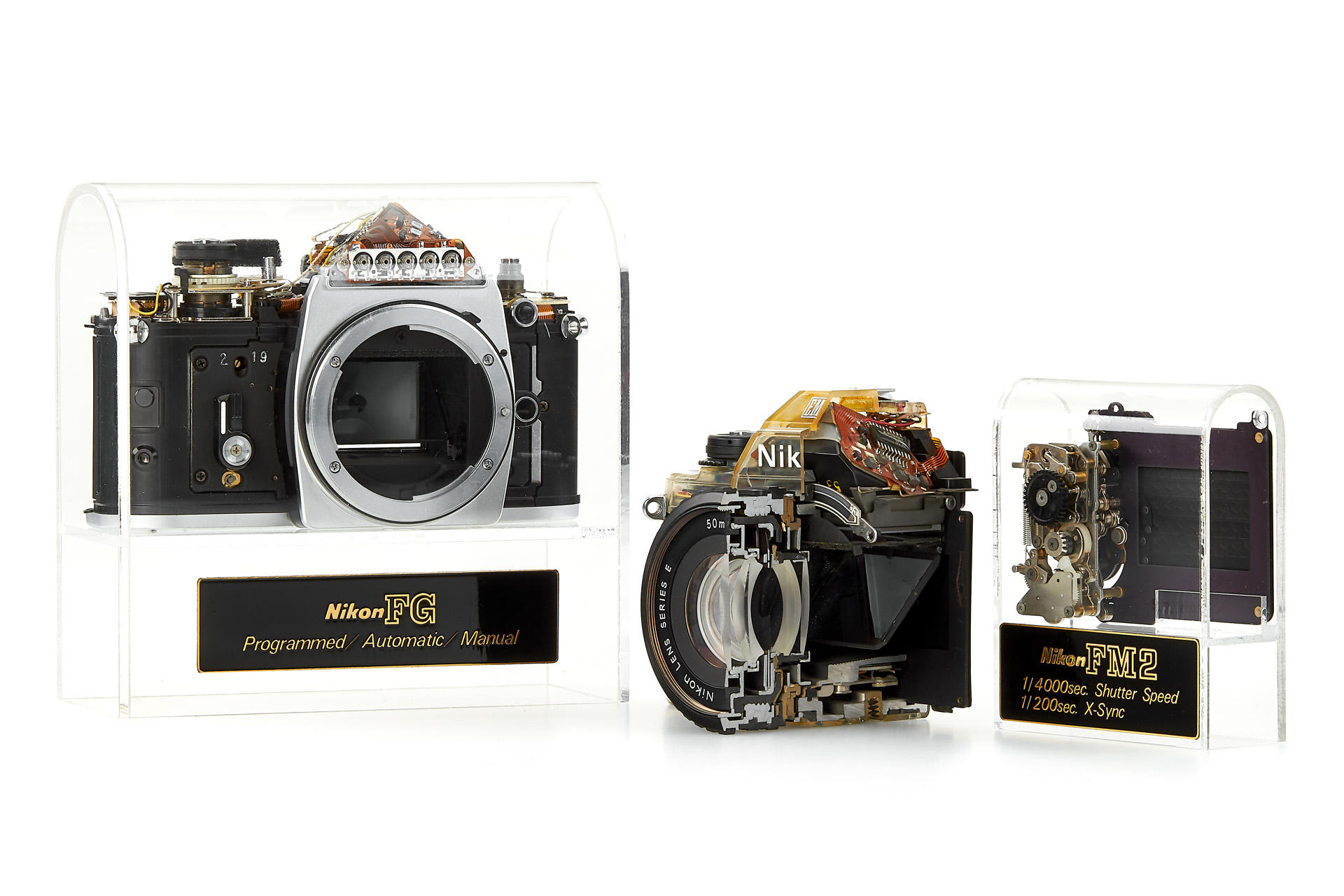 set of 3 rare Nikon displays, Nikon FG, Nikon EM and Nikon FM2 shutter, beautifully made cut models in plexiglass casing