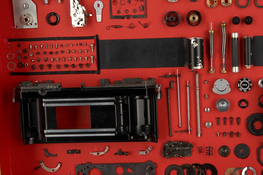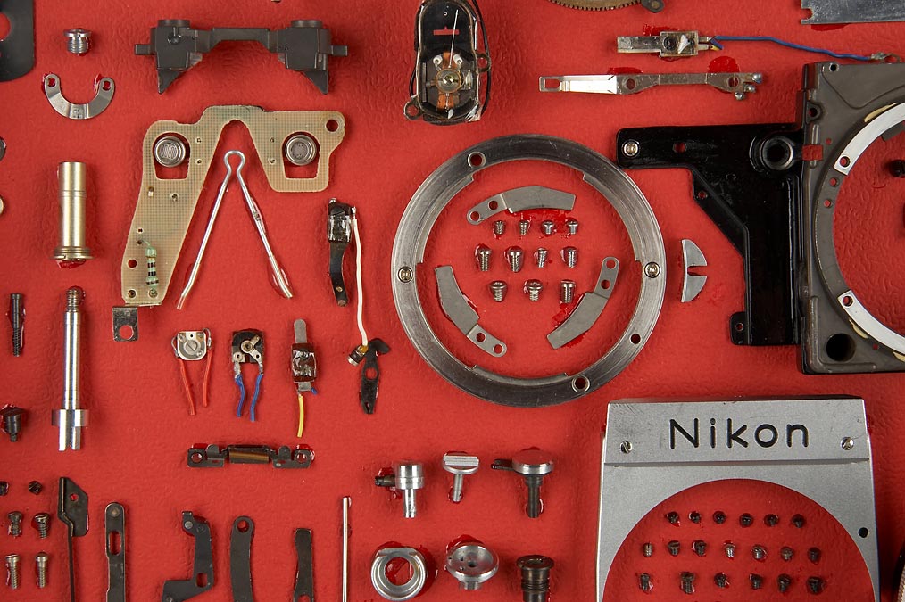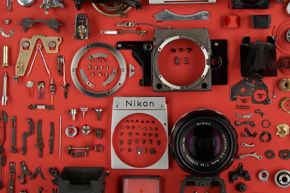 explosion display of a completely dismantled Nikon F Photomic FTN chrome with Nikkor-S.C 1.4/50mm no.1534138, framed and mounted on red cloth - a beautiful and artistically arranged tableaux