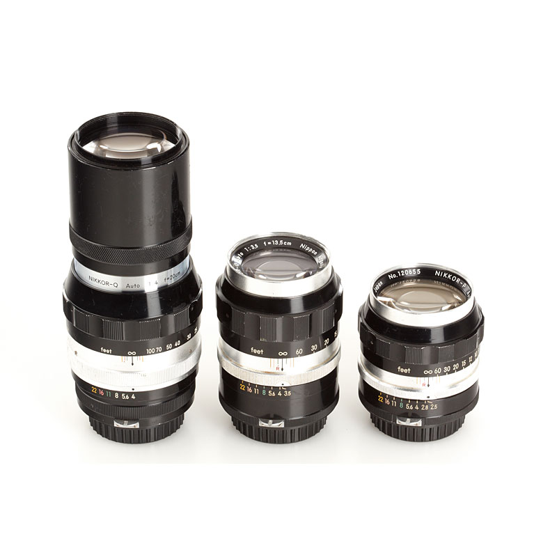 extremely early body in fine original condition with all early features and 4 matching lenses: (1) 'Tick Mark' Nikkor-S 2/5cm no.523240 (cond. B+), (2) 'Tick Mark' Nikkor-P 2.5/10.5cm no.120655 (cond. B), (3) 'Tick Mark' Nikkor-Q 3.5/13.5cm no.720141 (cond. B), (4) Nikkor-Q 4/20cm no.169467 (cond. C) - a very rare outfit from the first production - ex Machold Collection
