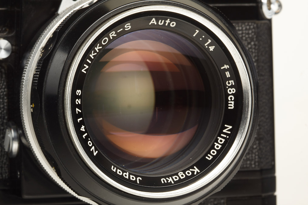 body in good working order with film-advance lever like Apollo, F-36 motor drive no.141646 type 9, brown battery pack with cable, Nikkor-S Auto 1.4/5.8cm no.171723, hood