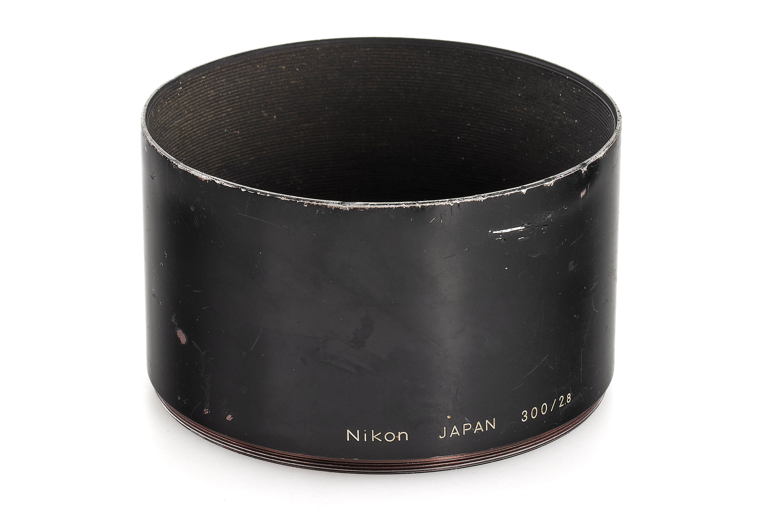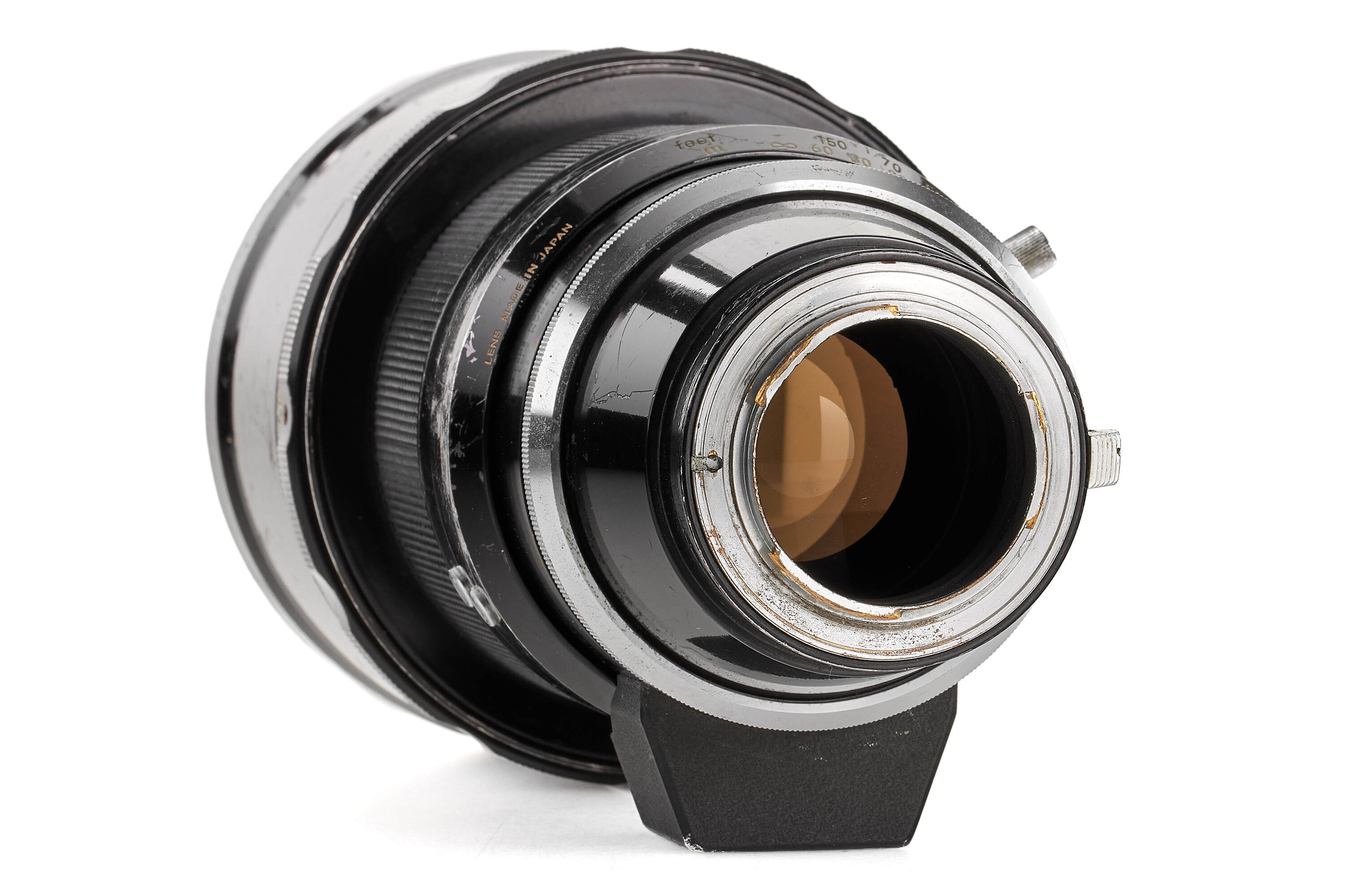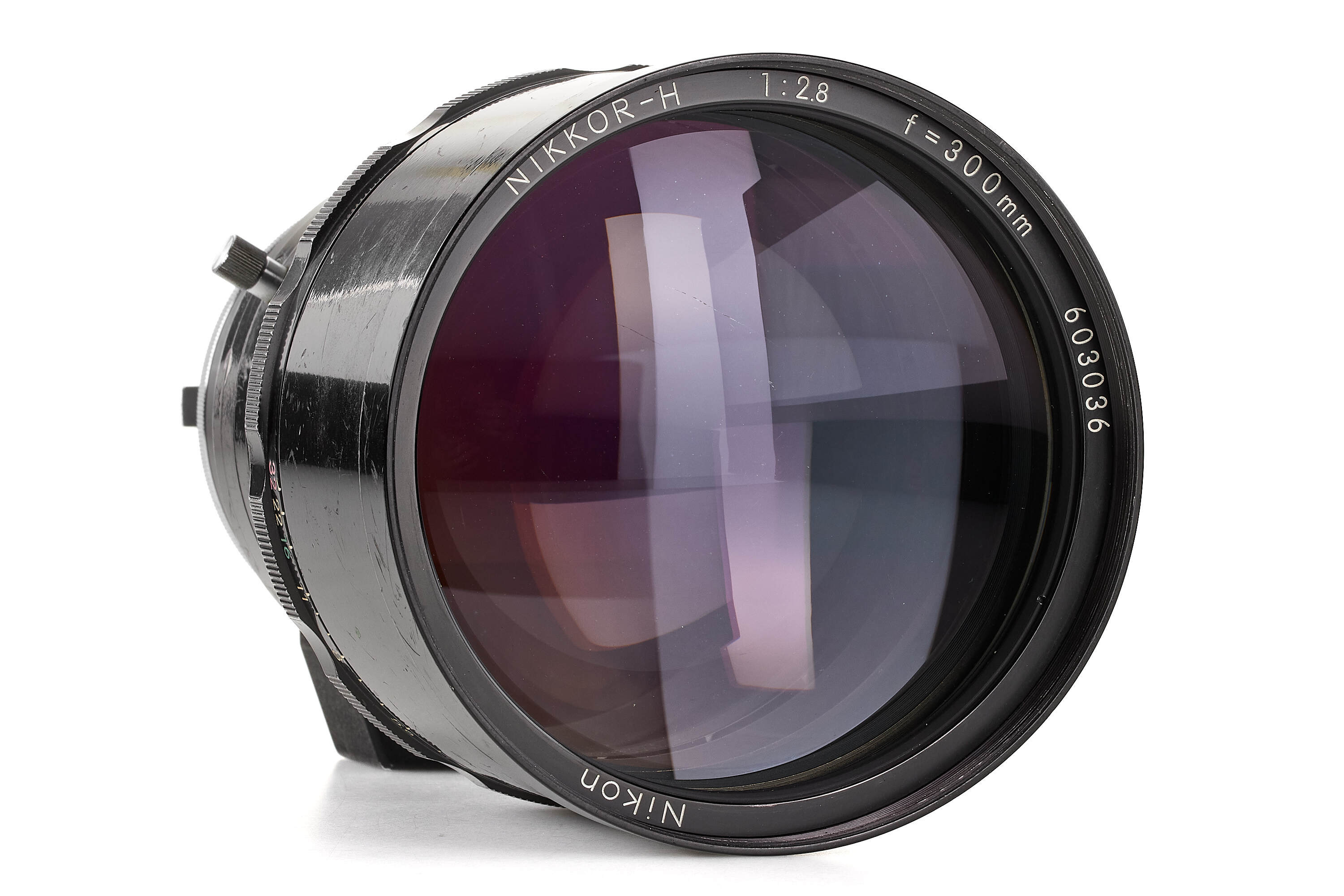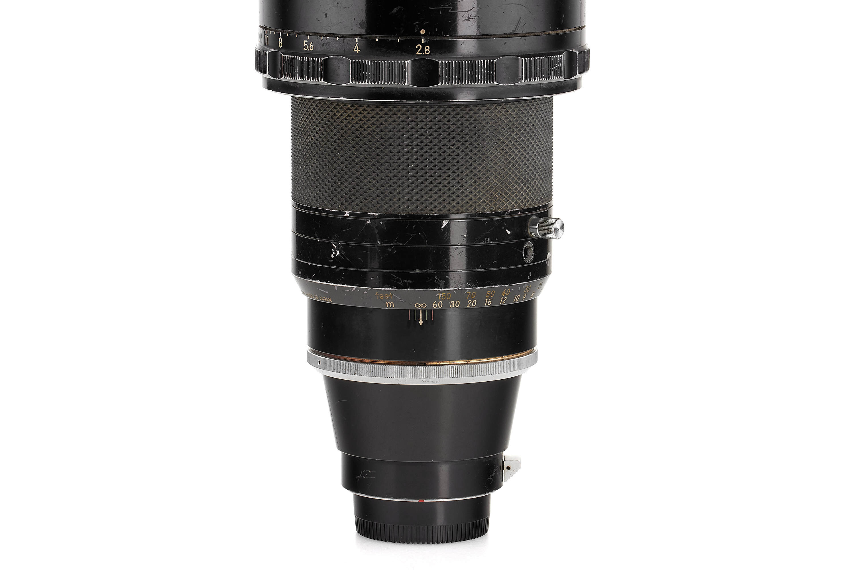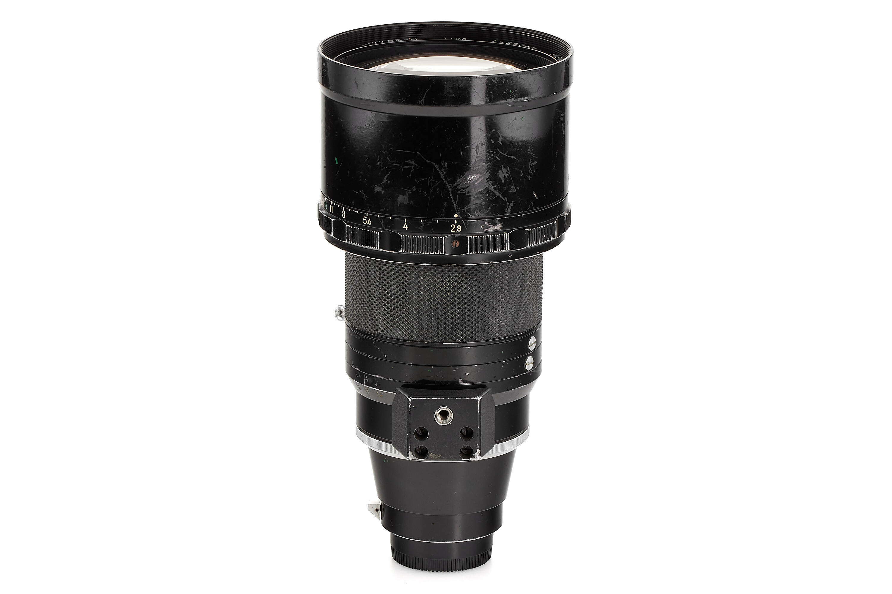 An extremely rare Nikkor-H 300mm f/2.8, introduced in January 1972 as the world’s very first 300mm lens with a maximum aperture of f/2.8. Built exclusively for professional press use around the time of the Sapporo Winter Olympics, it was never included in Nikon’s regular catalogues and only about 80 units were produced. The lens employs special ED-type glass supplied by Schott, as Nikon’s own ED material was not yet ready, and was designed without an automatic diaphragm to optimise performance at full aperture. With its six-element construction delivering superb correction and coverage up to 6×6 cm format, this impressive 3 kg lens stands as a milestone in Nikon’s optical history and remains one of the rarest professional Nikkors ever made. The offered example shows the wear of years of professional use; one of the focus click stops is missing, and while the front element bears some scratches, the optics remain perfectly usable.