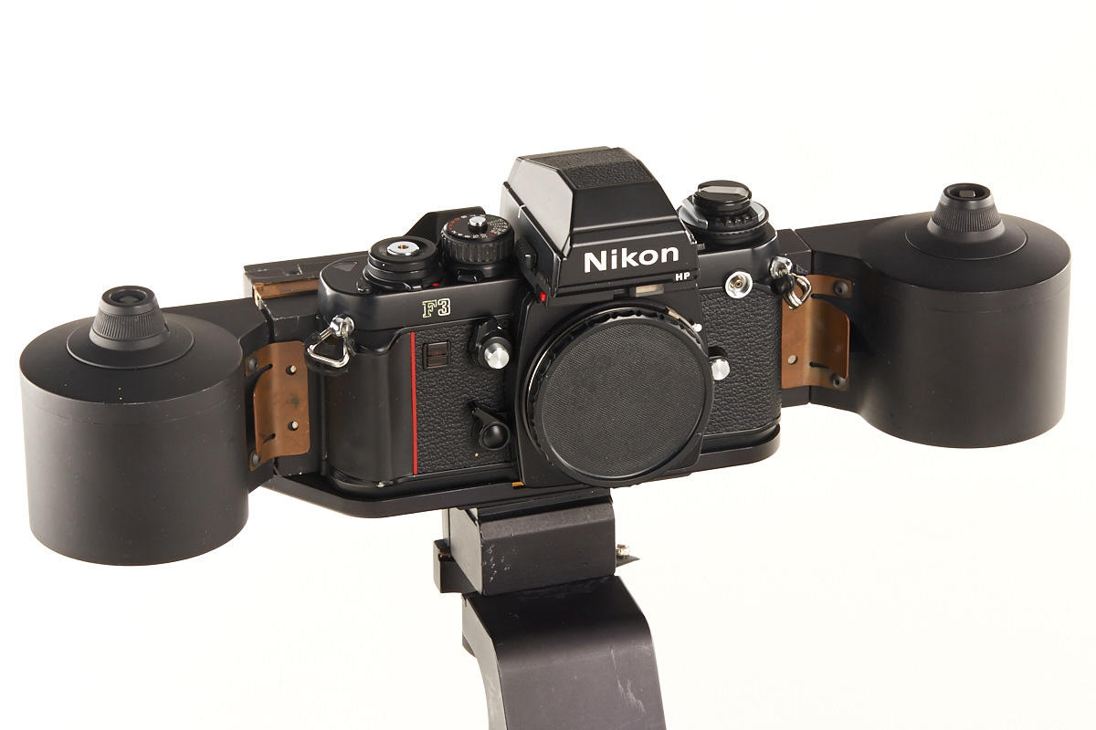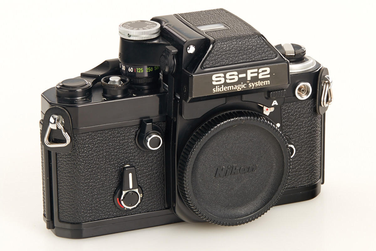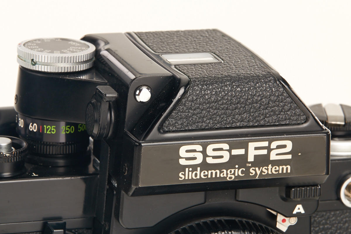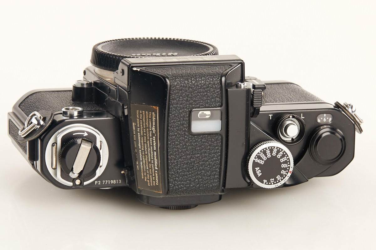 Nikon F2A no.7719813 and F3 no.1625854 modified by Maximillian Kerr Associates Inc. in New Jersey, some plastic parts exchanged for accuracy, F2A prism with accurately aligned focusing screen, the Slidemagic System was made for projection of moving items, the quality was superior to movie, only very little information is known, Nikon F3 with long film magazine on special stand