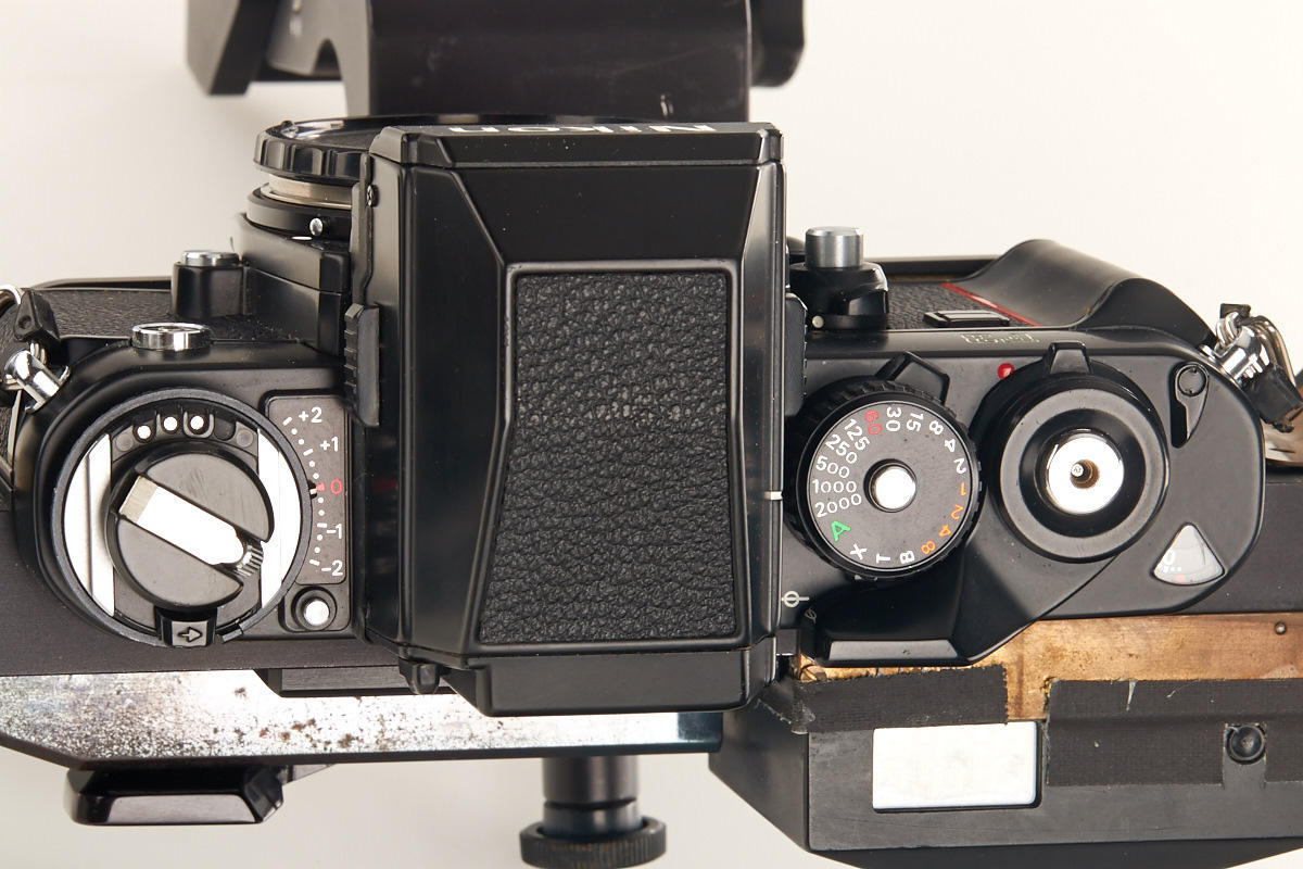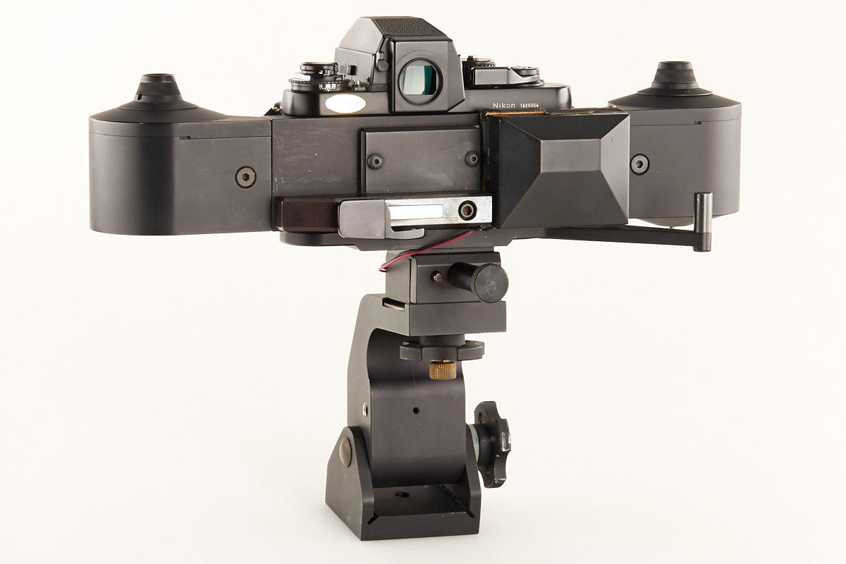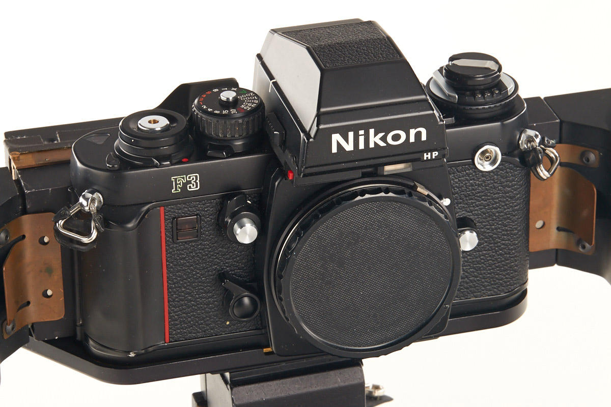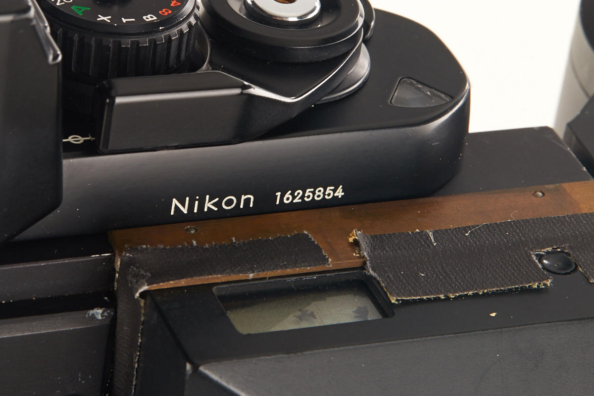 Nikon F2A no.7719813 and F3 no.1625854 modified by Maximillian Kerr Associates Inc. in New Jersey, some plastic parts exchanged for accuracy, F2A prism with accurately aligned focusing screen, the Slidemagic System was made for projection of moving items, the quality was superior to movie, only very little information is known, Nikon F3 with long film magazine on special stand