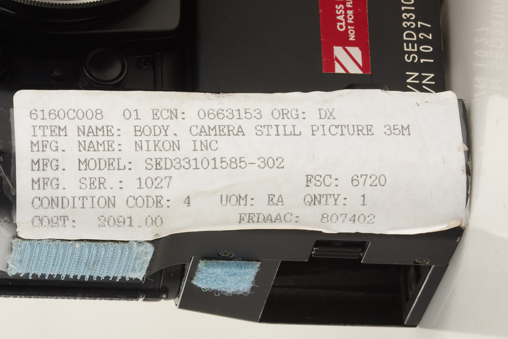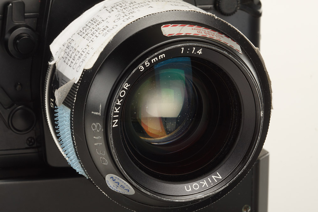 very rare original NASA camera with many special features, produced for Space shuttle Challenger and Columbia missions, the camera has special motor drive, counter to 72 frames, NASA inventory numbers and stickers, with 3 matching lenses and accessories: Nikkor 2/28mm S/N 1014 P/N SED33101583-302 with stickers and caps (front cap engraved inside: P/N SED33101579-002 S/N 1012), Nikkor 1.4/35mm S/N 1003 SED33101579-301 with stickers and caps, Zoom-Nikkor 3.5/35-70mm S/N 1003 P/N SED33102540-301 with stickers and caps, battery pack S/N 1021, data back, regular back S/N 1002, special SB-17 flash with NASA numbers and stickers, cable release with inventory sticker