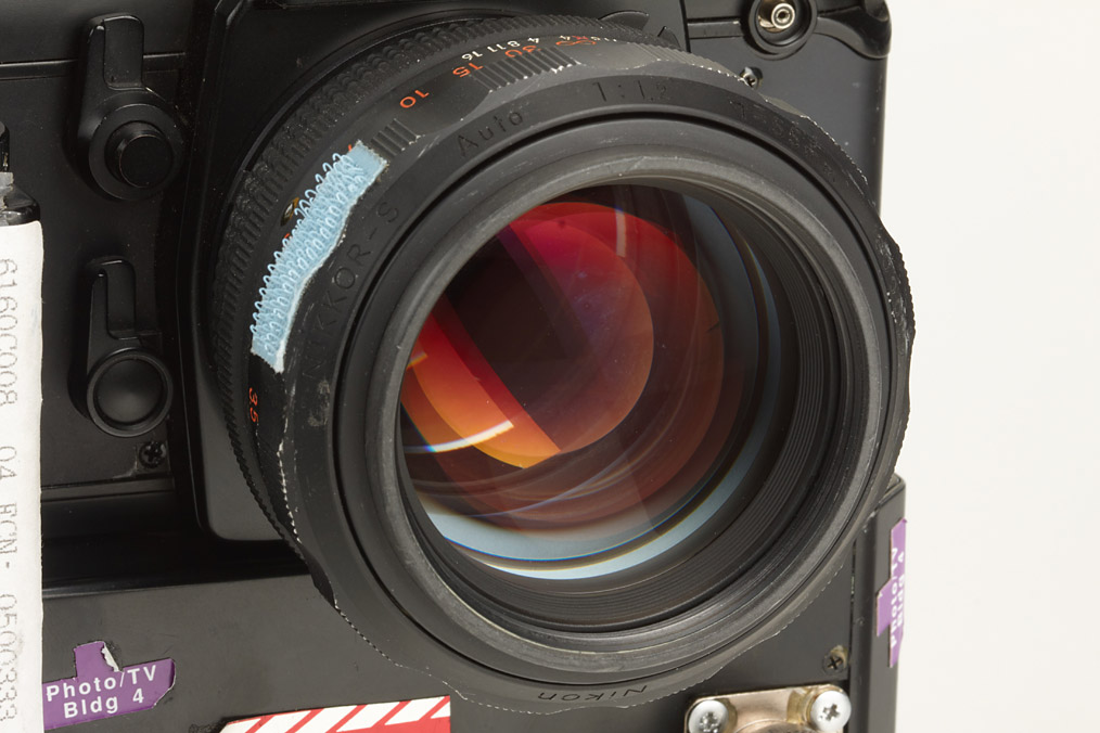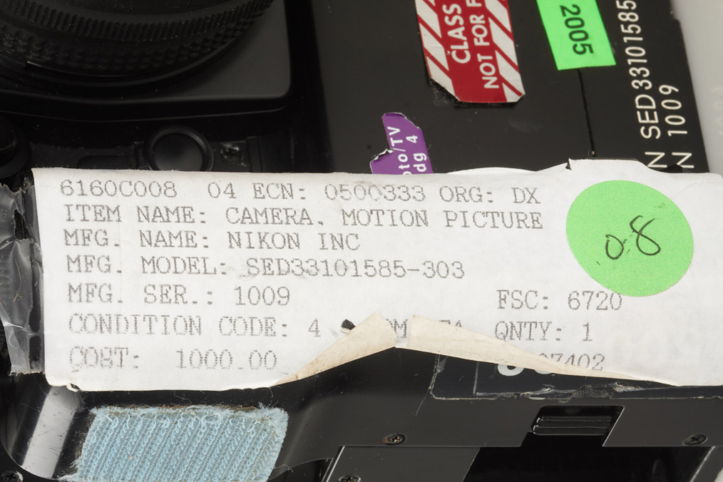 very rare original NASA camera with many special features, produced for Space shuttle Challenger and Columbia missions, the camera has special motor drive, counter to 72 frames, NASA inventory numbers and stickers, battery pack S/N 1038, data back SED33101588-303 S/N 1015, sports finder engraved with NASA numbers P/N SED33101574-301 S/N 1003, hand-engraved no.201713, HP finder with NASA numbers P/N SED 33101585-007 S/N 1040, cable release with inventory sticker, with very rare black anodised Nikkor-S Auto 1.2/55mm no.800009 with NASA numbers P/N SEB33100009-301 S/N 1009 with matching cap (in total only 18 of these lenses were produced for NASA)