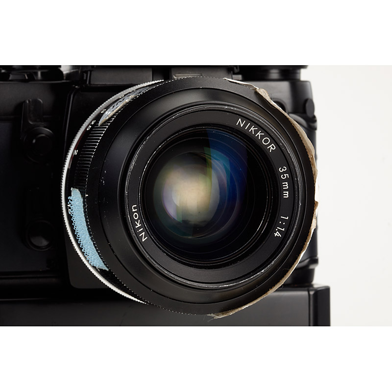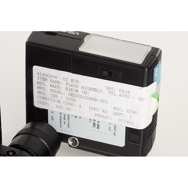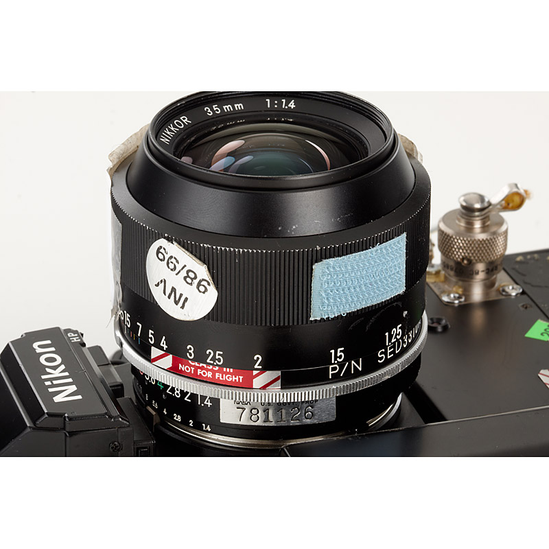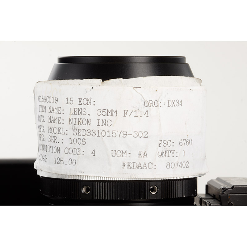 very rare original NASA camera with many special features, produced for Space shuttle Challenger and Columbia missions, the camera has special motor drive with connection to the Intervalometer, counter to 72 frames, typical NASA inventory numbers and stickers, with Nikkor 1.4/35mm in totally different design with NASA numbers P/N SED33101579-302 S/N 1006 with NASA inventory stickers, battery pack with NASA numbers P/N SED33101573-002 S/N 1085, battery cover with NASA numbers P/N SED33101573-003 S/N 1023, data back with NASA numbers P/N SED33101588-303 S/N 1070, special SB-17 flash with NASA stickers, cable release with NASA numbers P/N SED33102473-301 S/N 5015 with inventory sticker and flight records (flew on IML-2)