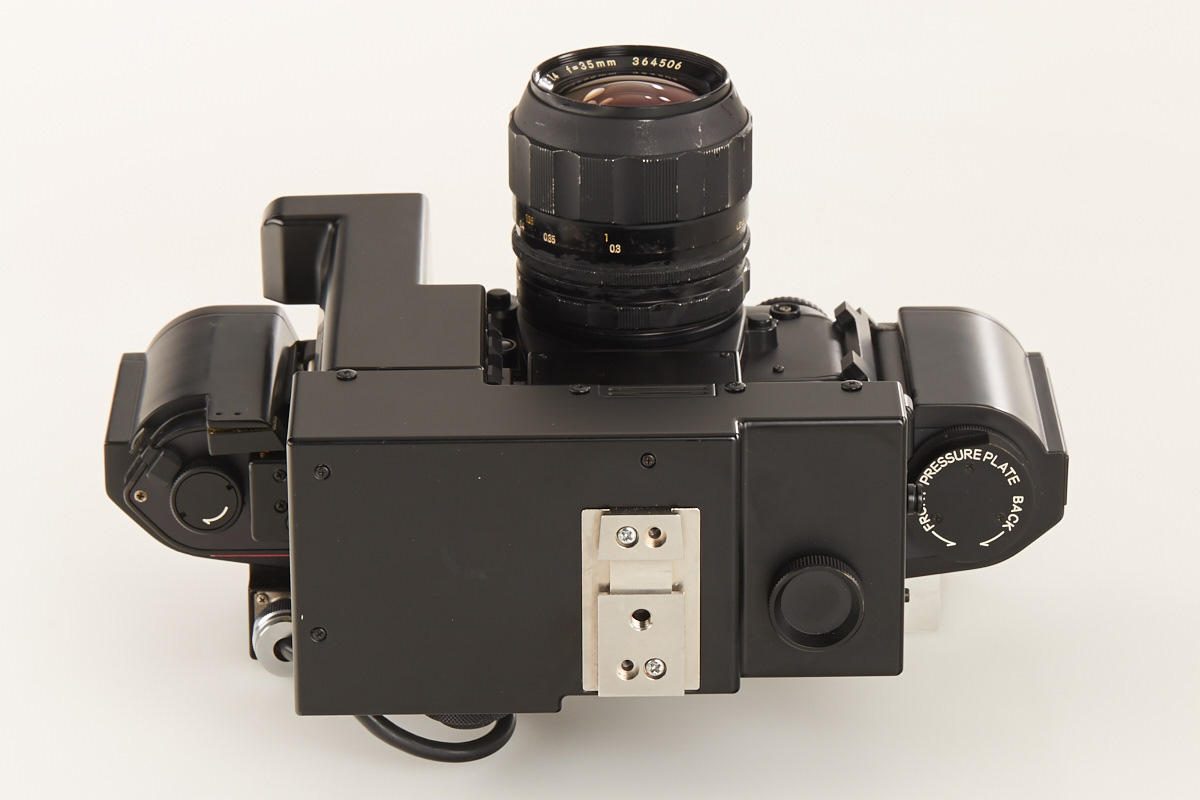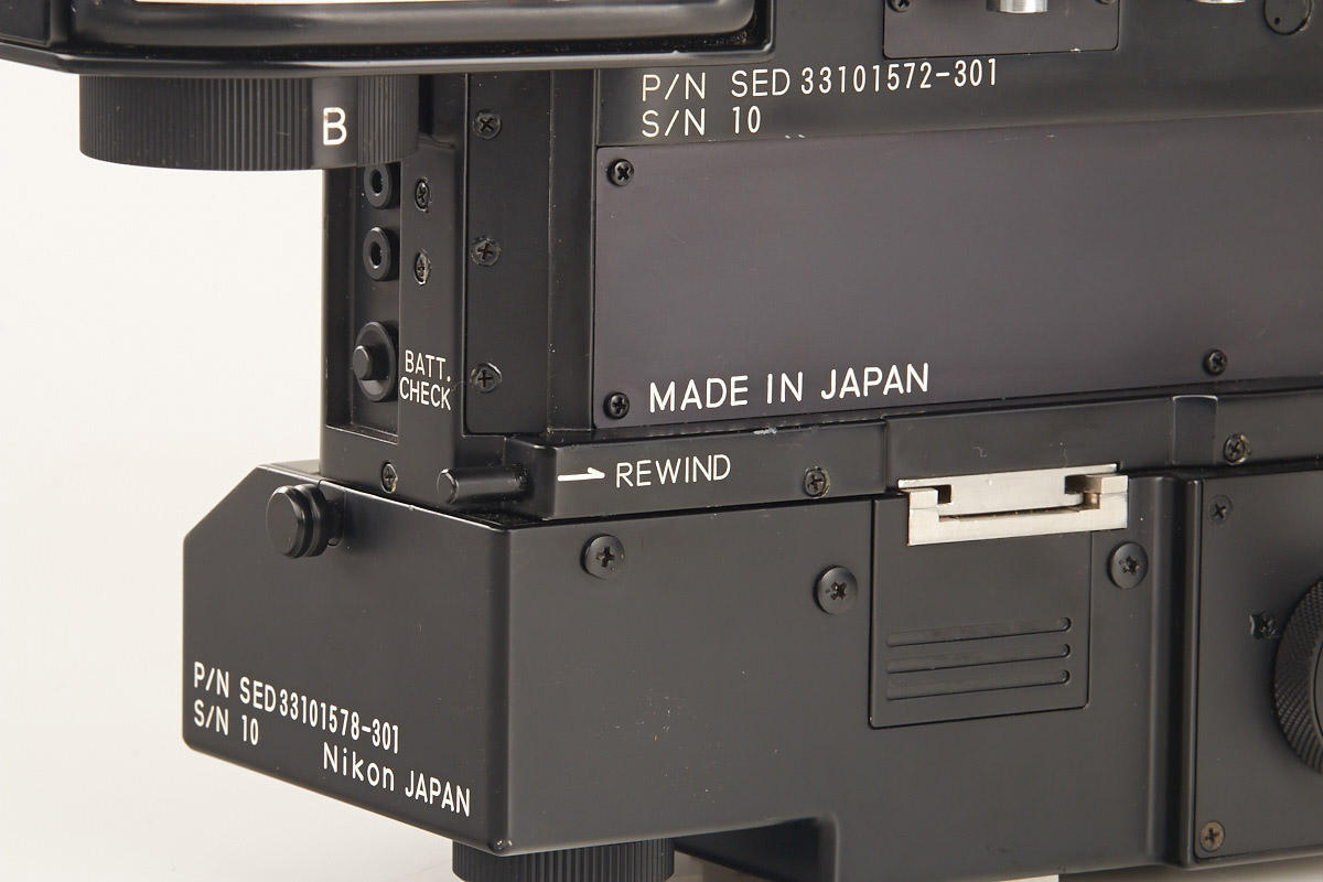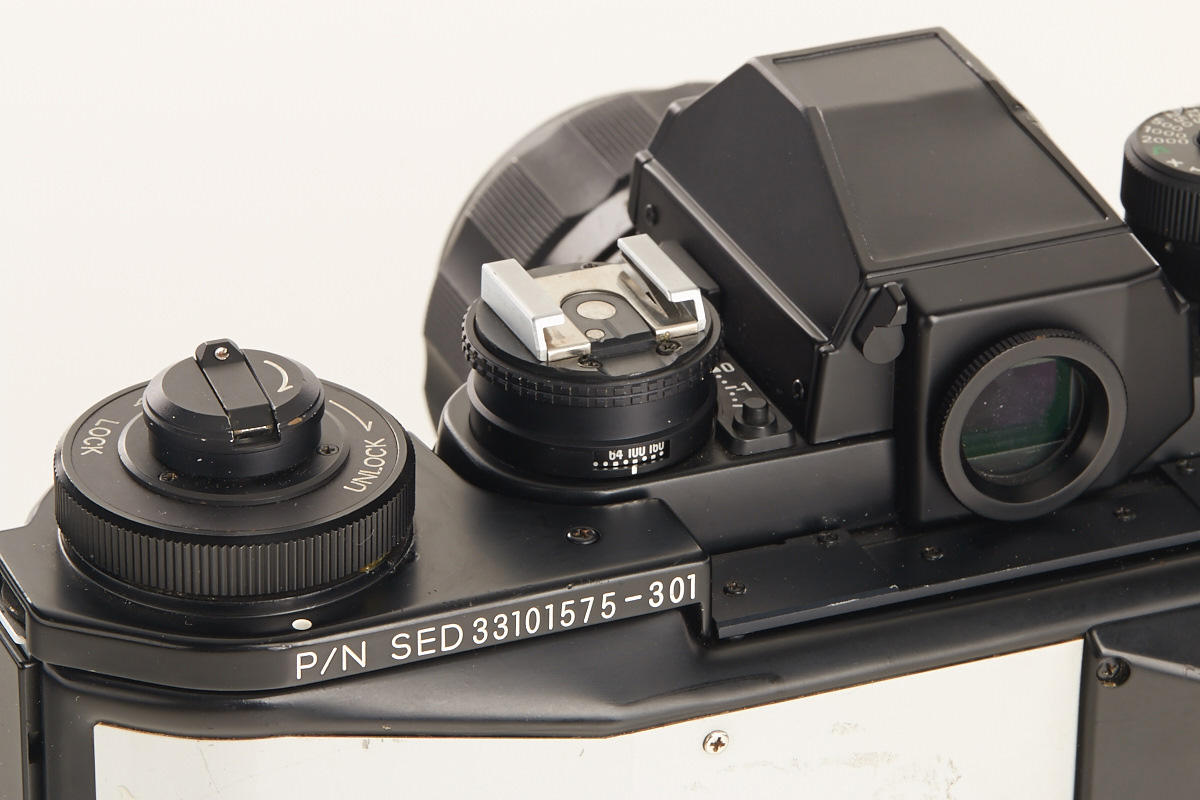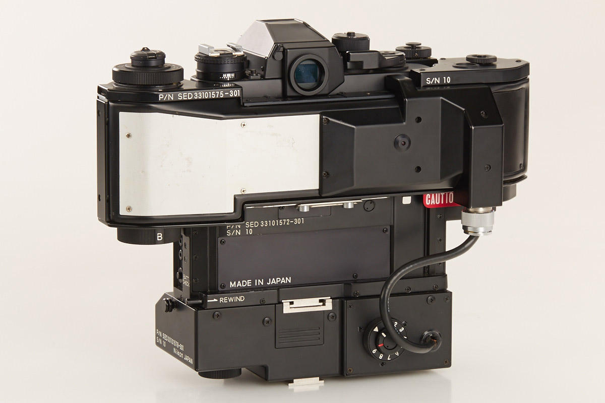 very rare demonstration camera with special motor drive engraved 'P/N SED 33101572-301 S/N 10' (the following two digits are blackened) with fixed battery chamber engraved 'P/N SED 33101573-002 S/N 1006', 250 back engraved 'P/N SED 33101575-301 S/N 10' (the following two digits are blackened), non removable dummy prism finder, Nikkor-N 1.4/35mm no.364506 (black anodized by NASA)