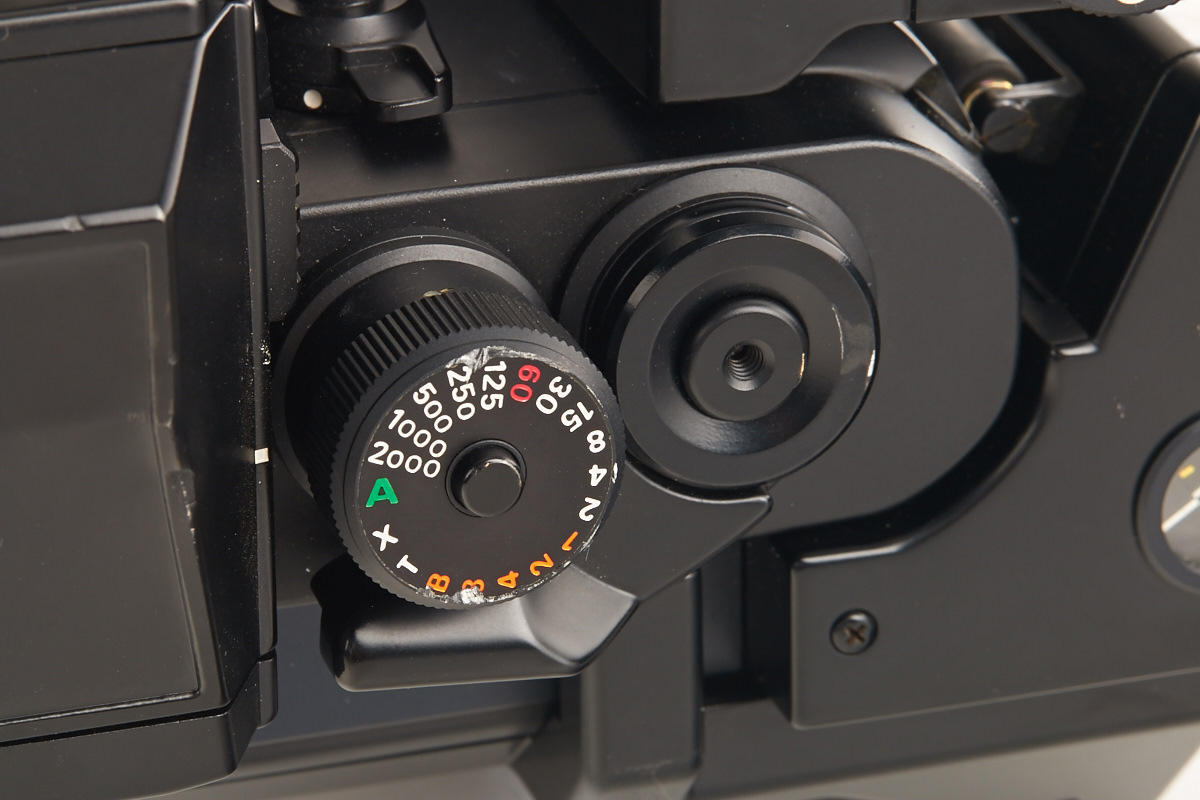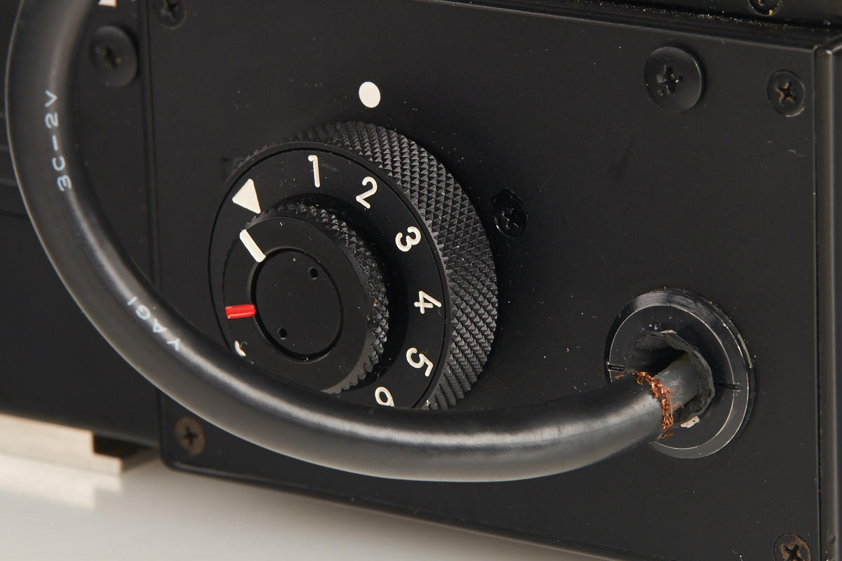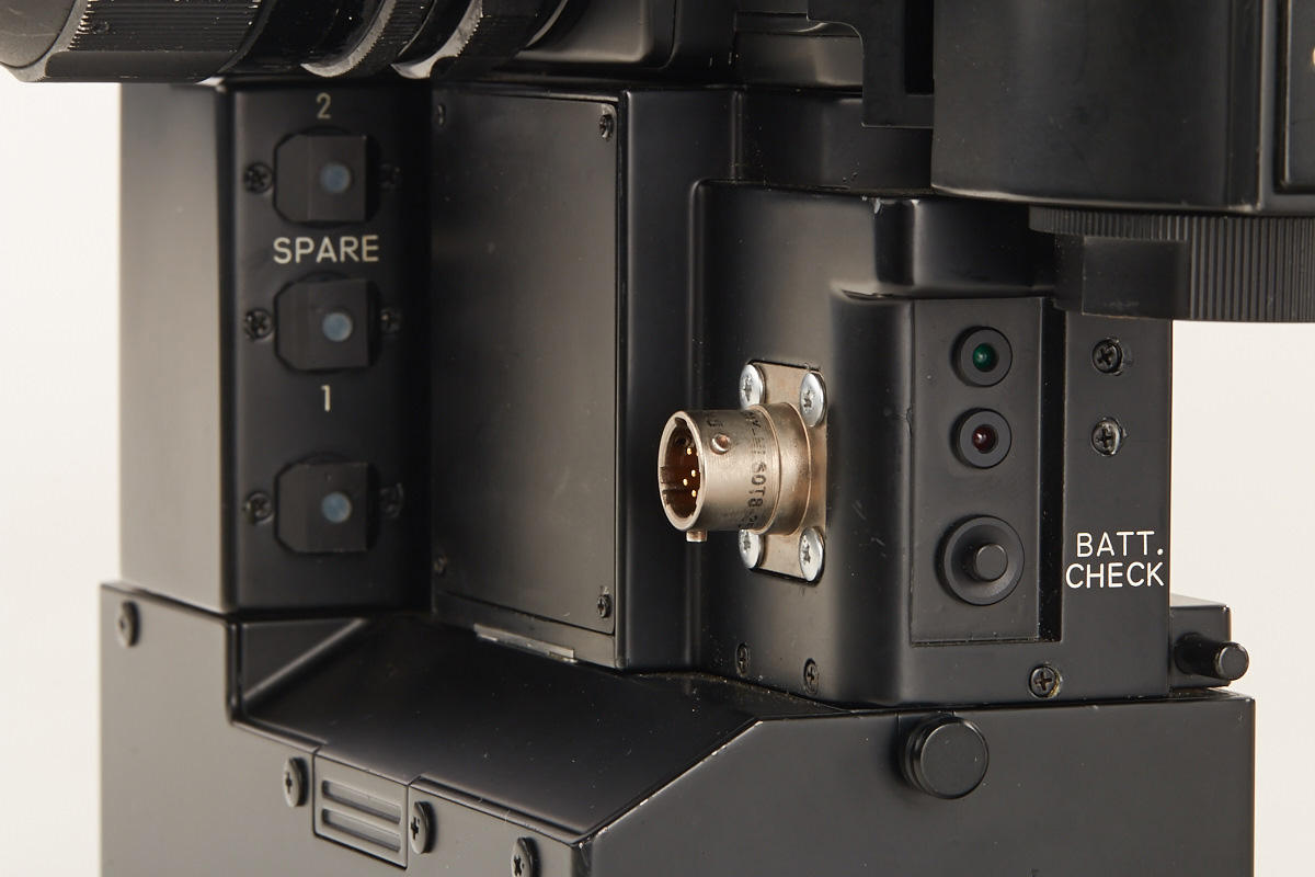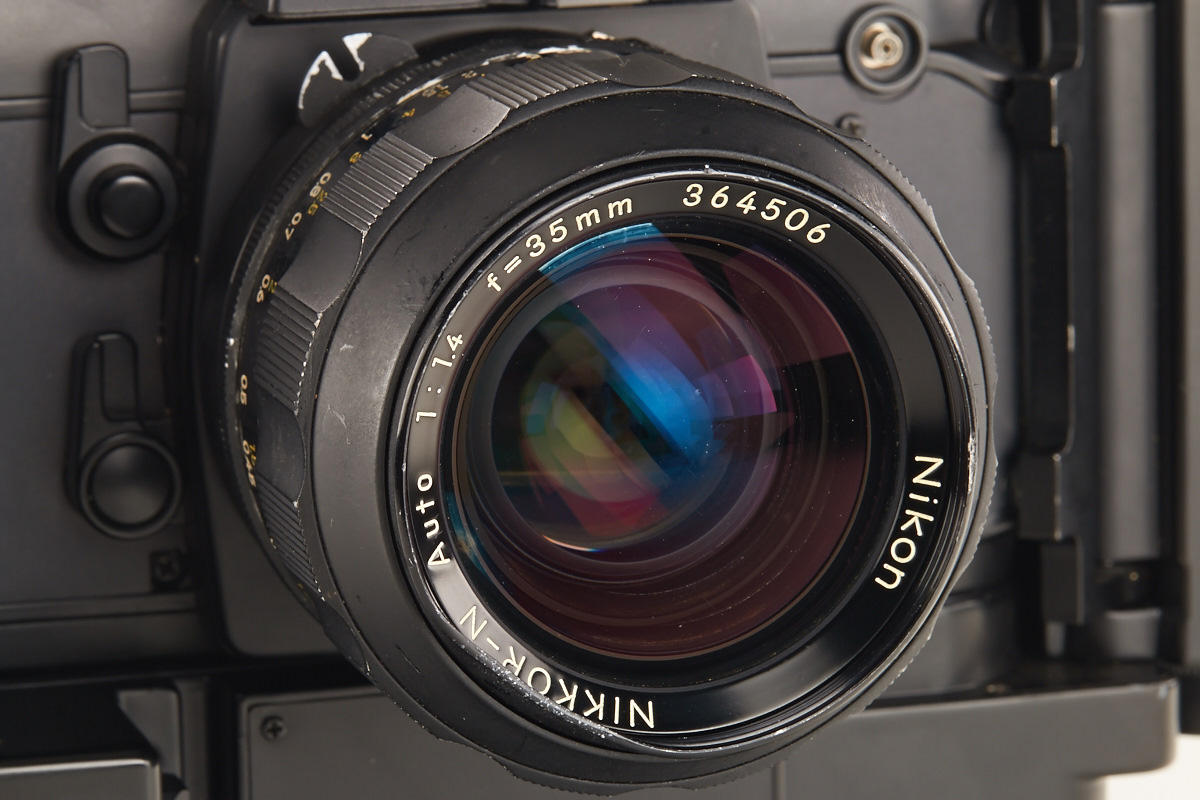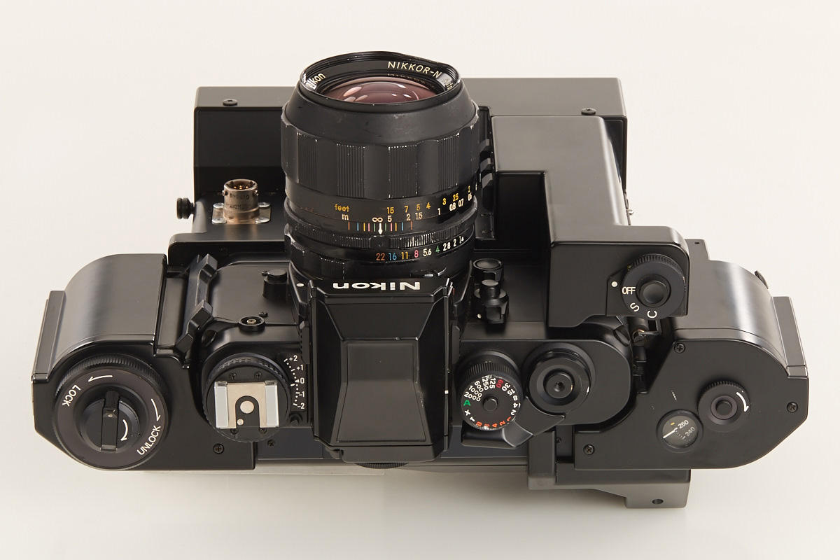 very rare demonstration camera with special motor drive engraved 'P/N SED 33101572-301 S/N 10' (the following two digits are blackened) with fixed battery chamber engraved 'P/N SED 33101573-002 S/N 1006', 250 back engraved 'P/N SED 33101575-301 S/N 10' (the following two digits are blackened), non removable dummy prism finder, Nikkor-N 1.4/35mm no.364506 (black anodized by NASA)