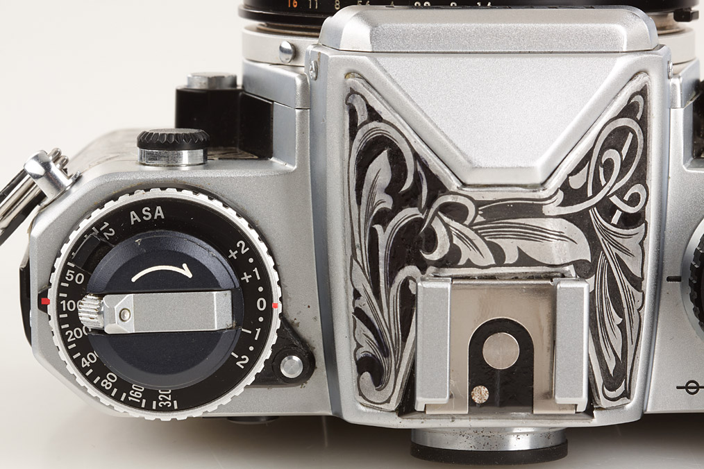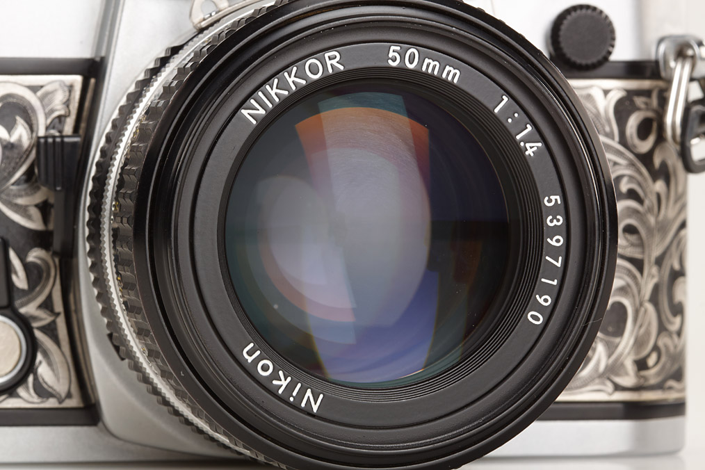 special custom made Nikon FE with hand-engraved sterling silver covering by Florin Mihai, Nikkor 1.4/50mm no.5397190 (cap), instructions, certificate and wooden presentation box