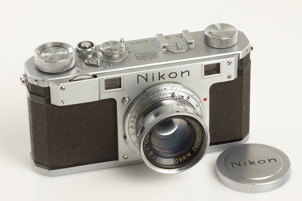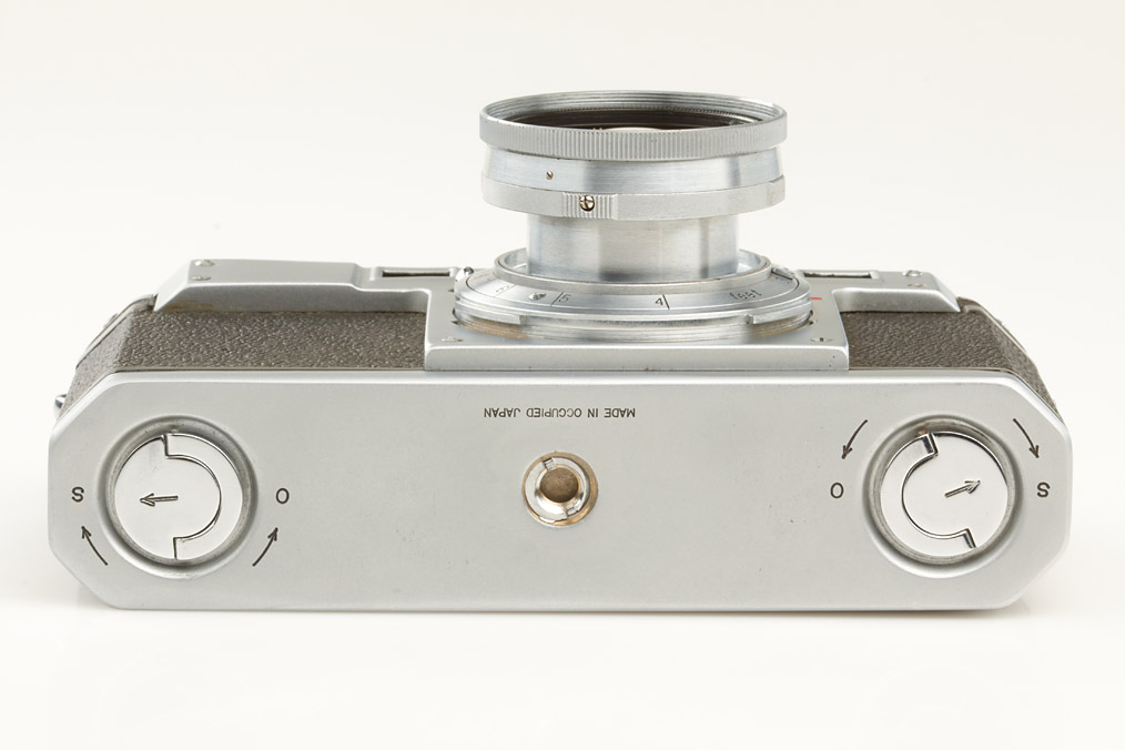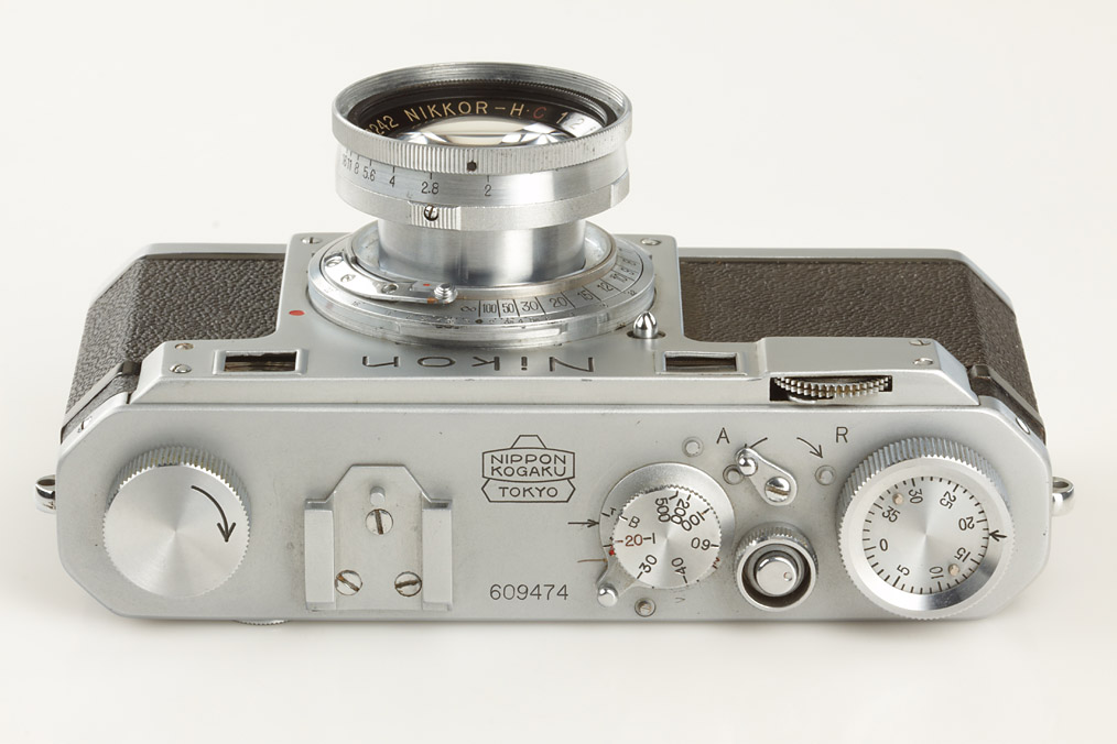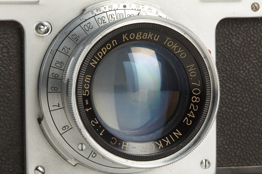 first model Nikon in very good original condition, version with 4 polished film guide rails, original shutter, non-removable take-up spool, original back door with same number, base plate engraved 'MADE IN OCCUPIED JAPAN', matching collapsible Tokyo Nikkor-H.C 2/5cm no.708242, rare chrome cap, original ever-ready case