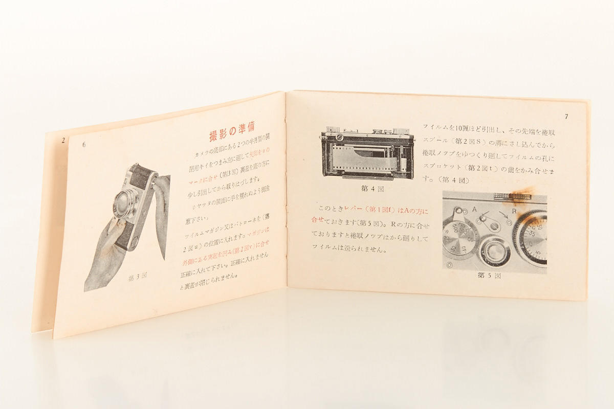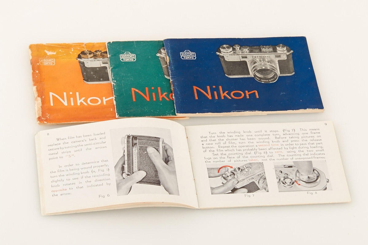 little collection of very rare early Nikon RF instruction booklets: (1) white/yellow instruction book for Nikon M showing the early varifocal finder with 24x32 engraving (for Nikon I !) on the last page, in Japanese, (2) green instruction book for Nikon M showing the early varifocal finder with 24x32 engraving (for Nikon I !) on the last page, in English, (3) orange instruction book for Nikon M including two Nikkor lens booklets, all in Japanese (4) later blue instruction book for Nikon M, in Japanese (5) later green instruction book for Nikon M, (6) Nikon S instruction book still with Nikon M illustrations, in Japanese (7) blue Nikon S2 instruction book, in English, (8) red Nikon S2 instruction book, in Japanese - most in very good condition (8)