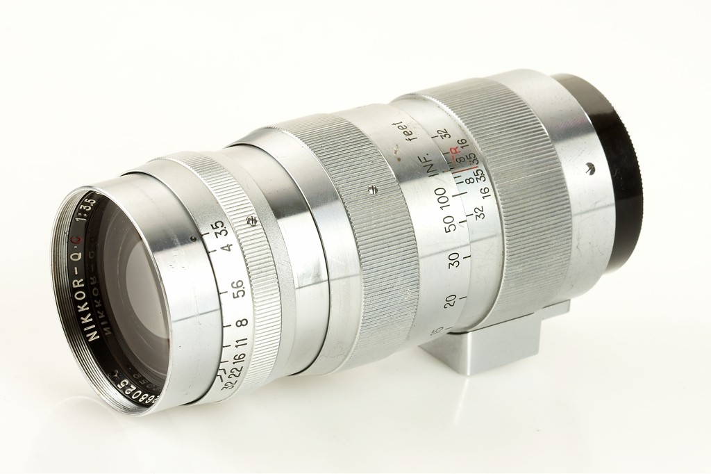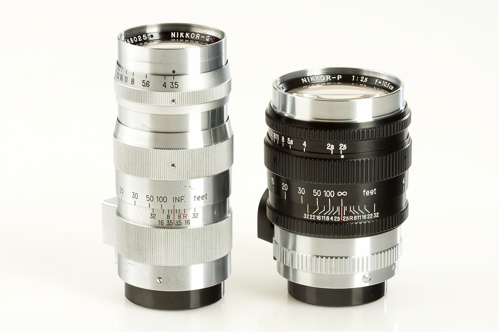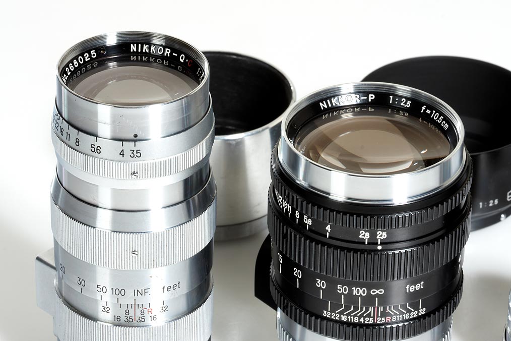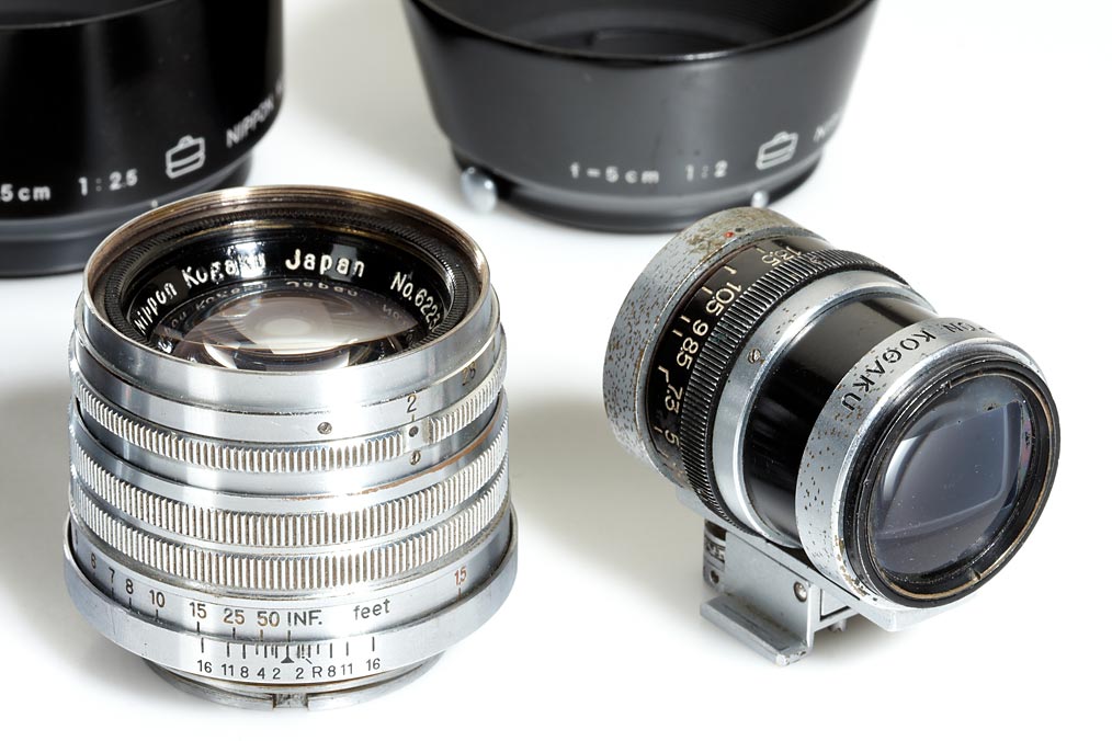 Nippon Kogaku Japan, Nikkor-H.C 2/5cm no.622348 (rare black painted hood engraved: f=5cm 1:2 Nippon Kogaku Japan), Nikkor-P 2.5/10.5cm no.919446 (cond. B/A, clean lenses, caps, hood), Nikkor-Q.C 3.5/13.5cm no.268025 (cap, hood), Nippon Kogaku Variofinder (35-135mm), all lenses in coupled M39 mount (3)