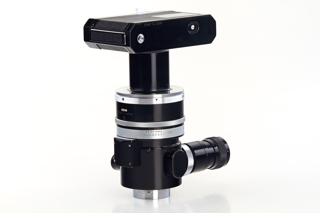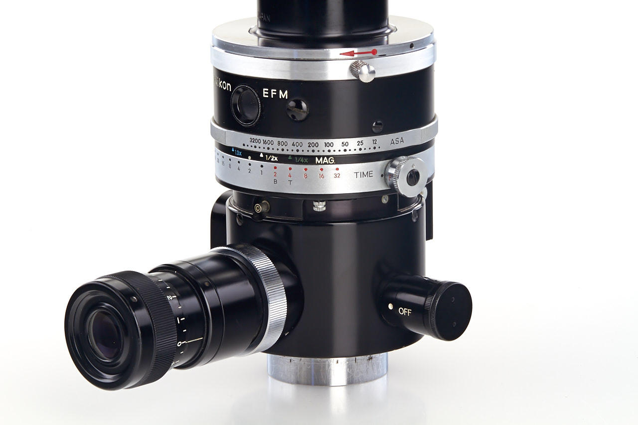 this EFM Microflex adapter to connect a Nikon microscope camera with a Nikon microscope to view via monocular oculars has its own shutter with T, B and times from 32 sec up to 1/250, it has a built-in metering system and could be used with films from 12 up to 3200 ASA, with a Nikon M-35S microscope camera in beautiful condition