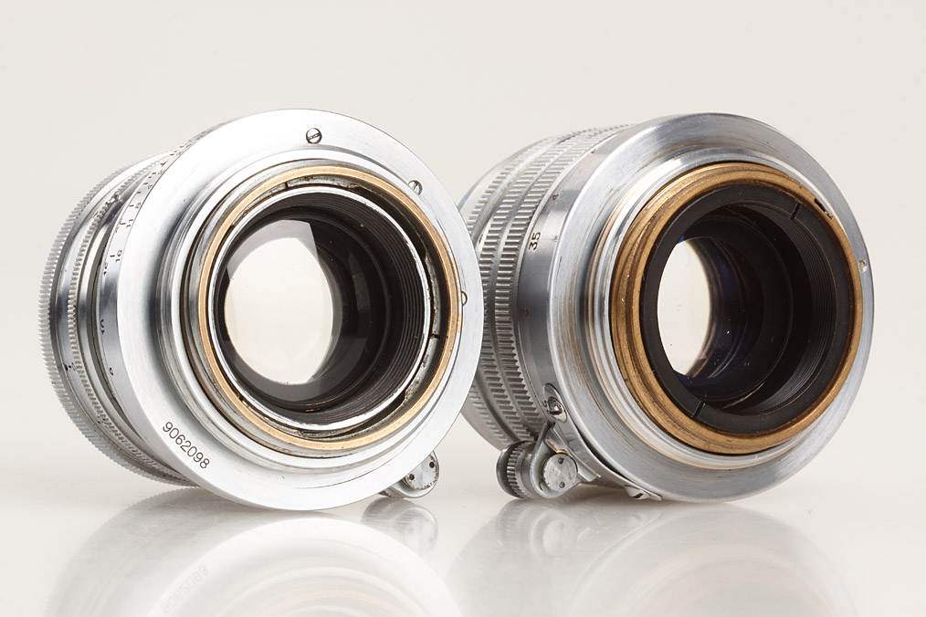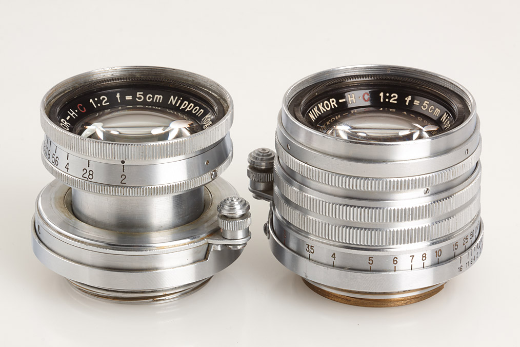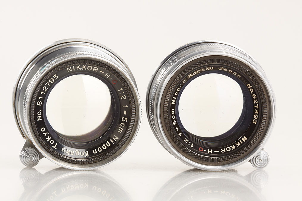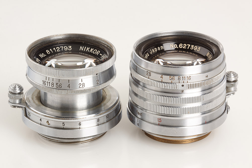 two Nikkor lenses for M39, (1) early coll. Nikkor-H.C 2/5cm no.8112793 (some cleaning marks, black bakelite keeper), (2) rigid Nikkor-H.C 2/5cm no.627393 (some cleaning marks, metal keeper) (2)