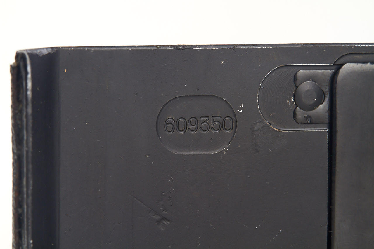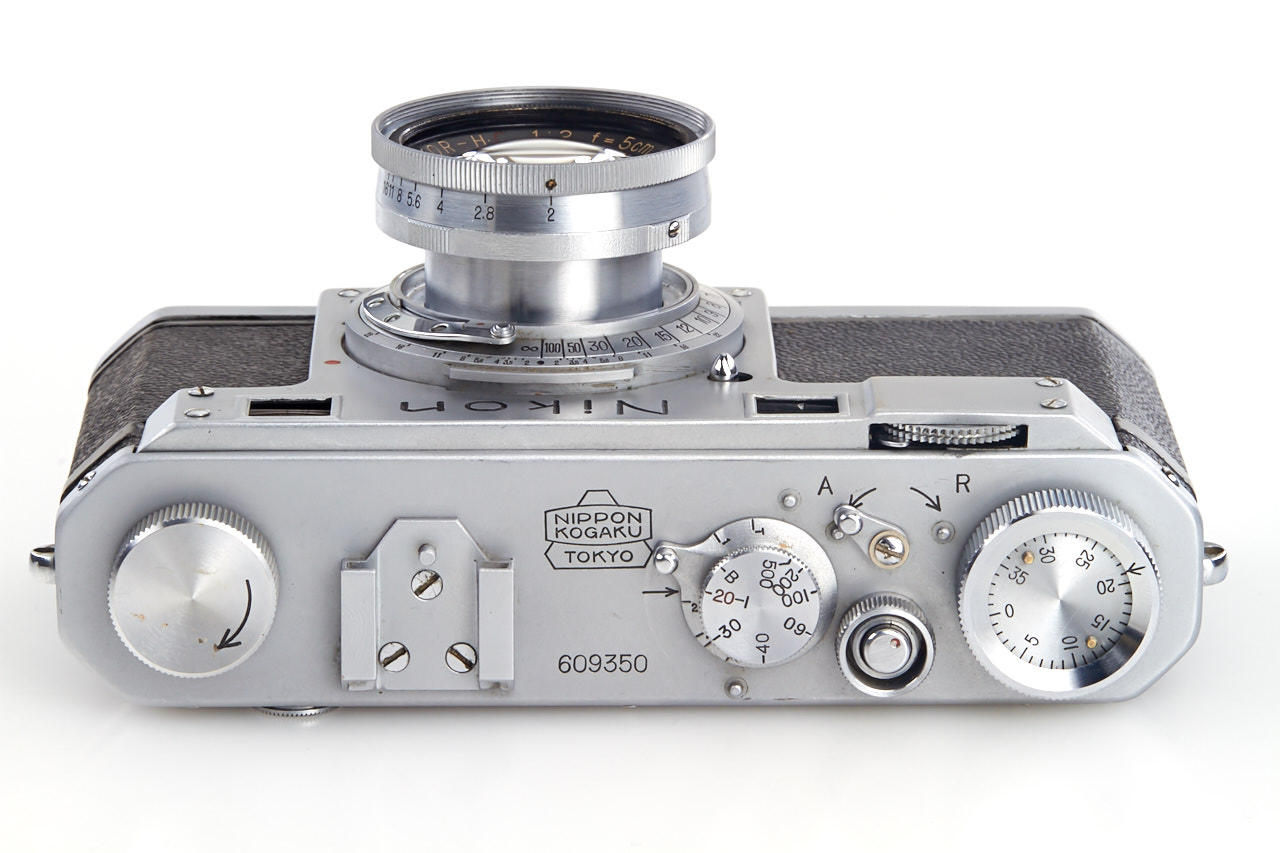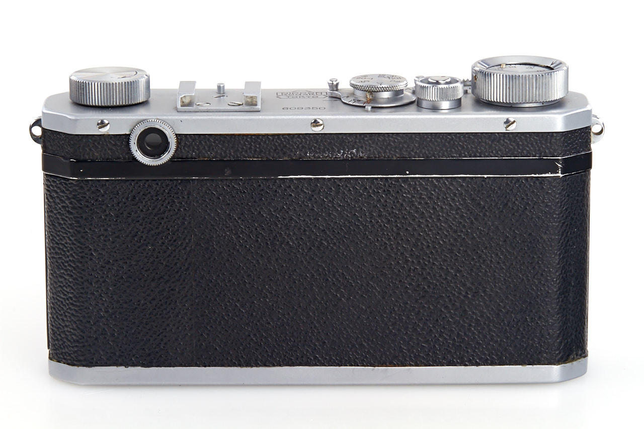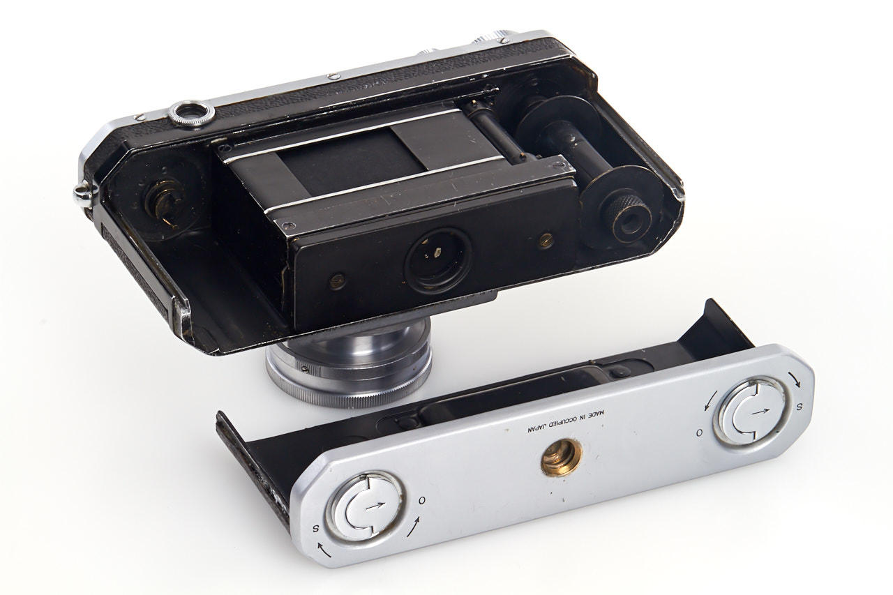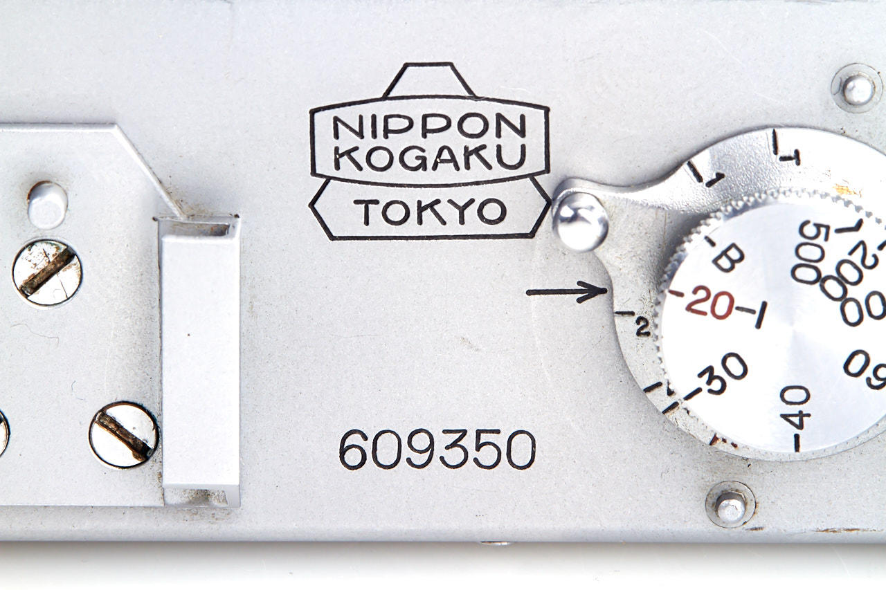 Very interesting Nikon One in very good and fully working condition: Nikon describes the Nikon One as having a 24x32 size negative. This camera no. 609350 with early body casting # 26 has a slightly smaller format 24x31. The top plate on this camera says camera 350, but the number 26 body casting seems to indicate its actually the 26th camera remanufactured later with newer parts that would fit and work right. Number 26 body casting, lens helical assembly, and top plate belonged to the 26th camera produced which failed quality control. #26 then went into a parts bin, awaiting the day its problems would be solved and it would make it to dealer shelves with a later number. The camera with two polished film guide rails, removable film spool. The back camera serial number inside of an oblong circle is very unusual so far reported only on very few cameras. The leather on the camera back has been replaced. It comes with the matching 2/5cm Nikkor-H.C no.708268