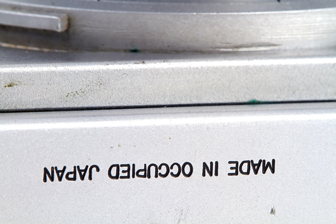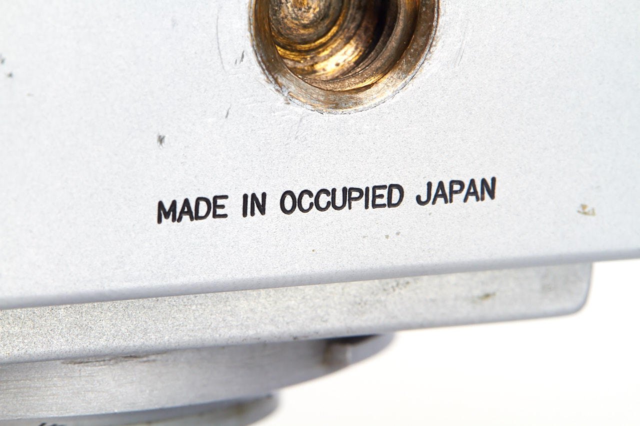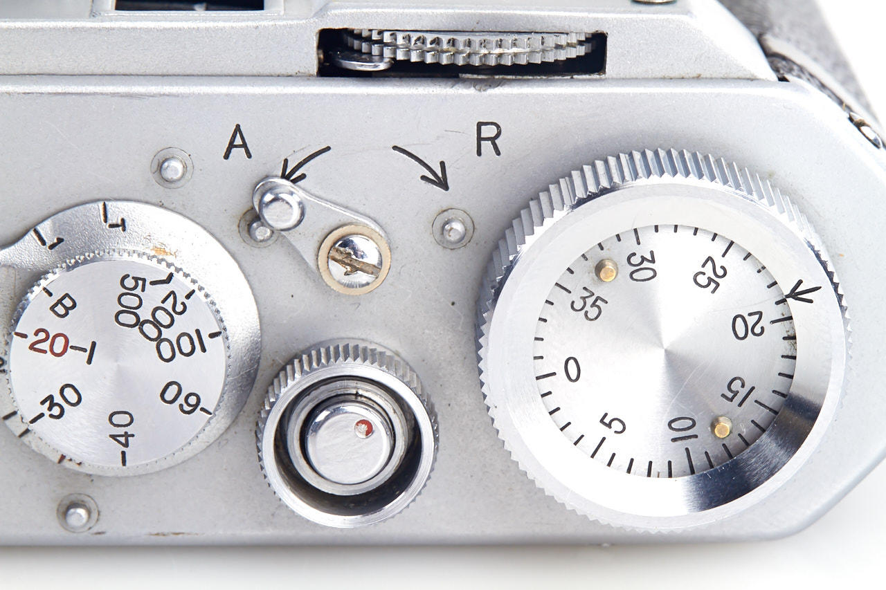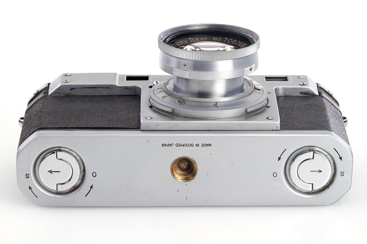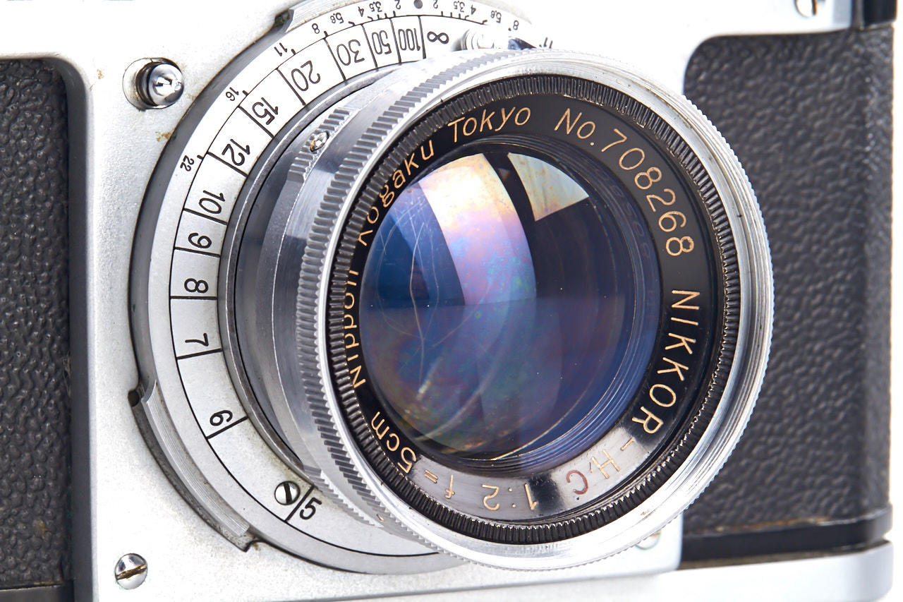 Very interesting Nikon One in very good and fully working condition: Nikon describes the Nikon One as having a 24x32 size negative. This camera no. 609350 with early body casting # 26 has a slightly smaller format 24x31. The top plate on this camera says camera 350, but the number 26 body casting seems to indicate its actually the 26th camera remanufactured later with newer parts that would fit and work right. Number 26 body casting, lens helical assembly, and top plate belonged to the 26th camera produced which failed quality control. #26 then went into a parts bin, awaiting the day its problems would be solved and it would make it to dealer shelves with a later number. The camera with two polished film guide rails, removable film spool. The back camera serial number inside of an oblong circle is very unusual so far reported only on very few cameras. The leather on the camera back has been replaced. It comes with the matching 2/5cm Nikkor-H.C no.708268